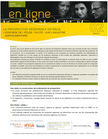 En bref En 2013, nous avons décidé de nous lancer dans un exercice de prospective régionale. Nous nous sommes tournés vers la direction régionale de l’Insee (Institut national de la statistique et des études économiques) et la Direccte (Direction régionale des entreprises, de la concurrence, de la consommation, du travail, et de l’emploi) en leur proposant de construire ensemble une méthodologie de projections d’emploi qui à la fois repose sur les tendances nationales et tient compte des spécificités régionales, notamment la démographie, le taux de chômage et la structure de l’appareil économique. Ces projections d’emploi par secteur d’activité ont constitué un levier au démarrage de la présente étude. En effet, en tant qu’OREF (observatoire régional emploi-formation), et donc ayant une mission d’aide à la décision, nous avons souhaité aller au-delà et prolonger ce travail. L’objectif d’une prospective régionale est non seulement de réaliser un suivi de l’évolution de l’emploi à partir d’un diagnostic quantitatif et qualitatif, mais aussi d’accompagner les acteurs institutionnels et socioéconomiques dans l’appropriation de ces résultats afin d’en faire un des éléments de diagnostic et d’aide à la décision. Au final : Une démarche prospective originale fondée sur une co-construction partenariale articulant un diagnostic quantitatif, une analyse des atouts, faiblesses et facteurs d’évolution du secteur des industries agroalimentaires en PACA. Un croisement entre les niveaux national et régional afin de construire des scénarios régionaux idoines. LA DÉMARCHE MÉTHODOLOGIQUE Une réelle co-construction de la démarche de prospective Un projet réunissant des professionnels régionaux intéressés et engagés : la Friaa (Fédération régionale des industries agroalimentaires), l’Ifria (Institut de formation de l’industrie alimentaire) et Observia (Observatoire prospectif des métiers et qualifications des industries alimentaires). Un diagnostic « dynamique » partagé faisant ressortir les atouts et les faiblesses d’un secteur professionnel dans la région. Une étude « pilote » Un croisement pertinent entre les niveaux national et régional : première collaboration entre un OREF et un observatoire de branche (Observia) en PACA. Une méthode originale de construction de scénarios régionaux qui déconstruit une par une les composantes des scénarios nationaux pour reconstruire des scénarios régionaux sur mesure. CETTE PUBLICATION A ETE REALISEE AVEC LA CONTRIBUTION DE Note Secteurs n°°2 – Juin 2015 Directeur de publication : Philippe Guy Réalisation : Annie Boyer et www.orm-paca.org Lydie Chaintreuil L'OBSERVATOIRE RÉGIONAL DE L'EMPLOI ET DE LA FORMATION DE LA RÉGION PROVENCE – ALPES – CÔTE D'AZUR Plusieurs étapes Établir un diagnostic quantitatif suivi d’un diagnostic qualitatif comprenant une analyse des atouts et faiblesses du secteur en région et les principaux facteurs d’évolution. Régionaliser les scénarios sur la base des scénarios nationaux de l’étude commanditée par Observia. Identifier les impacts des scénarios régionaux en termes de compétences métiers. Un périmètre ad hoc Un périmètre des industries agroalimentaires défini par le groupe de travail, tant pour le champ des activités économiques que sur celui des métiers retenus. LE DIAGNOSTIC Les entreprises de l’industrie agroalimentaire en région Un tissu économique composé essentiellement de TPE et PME. Deux gros bassins d’activités, l’un à Marseille, l’autre à Avignon. Un secteur résistant à la crise mais des effectifs en baisse depuis 2010. e e PACA est au 4 rang national en termes d’emploi concernant l’activité des fruits et légumes et 5 pour l’industrie des boissons. Les conditions d’emploi dans les industries agroalimentaires en PACA Une population active principalement dans la production avec une part dominante d’ouvriers non qualifiés. Une part des femmes plus importante que dans le reste de l’industrie et plus diplômées que les hommes. Une proportion de non-diplômés plus importante que dans les autres secteurs. Une part de l’apprentissage sensiblement égale dans les industries agroalimentaires et dans l’industrie. Une part plus importante d’actifs travaillant à temps complet que dans l’ensemble des secteurs. Les industries agroalimentaires en PACA possèdent des atouts et des faiblesses spécifiques Les atouts de la région : densité de la population présentielle, infrastructures de transports (autoroutes, aéroports), port autonome de Marseille, image positive de la Provence et centres de ressources techniques et de recherche très présents sur le territoire. Un tissu d’entreprises composé de grands groupes et de TPE et PME familiales, une diversité d’activités de production et des activités de « niche » et haut de gamme. Une forte collaboration des organismes professionnels auprès des entreprises et auprès des pouvoirs publics. La faiblesse des stratégies agroalimentaires et agricoles pour lutter contre la concurrence, et la structuration insuffisante de certaines filières régionales. Un déficit d’entreprises de taille intermédiaire qui freine l’investissement dans le matériel et l’immatériel. Un poids considérable de la grande distribution qui tire les prix vers le bas. Une implantation fréquente des entreprises en zone rurale ne favorisant pas les recrutements. Un coût et une rareté du foncier et des logements ne favorisant pas l’attractivité. 2 OBSERVATOIRE RÉGIONAL DES MÉTIERS Le secteur agroalimentaire est influencé par des facteurs d’évolution économiques, politiques et réglementaires, démographiques et socioculturels… L’environnement des IAA n’est pas caractérisé par des bouleversements de grande ampleur ou des ruptures drastiques (sauf en cas de crise sanitaire médiatisée). Les aspects