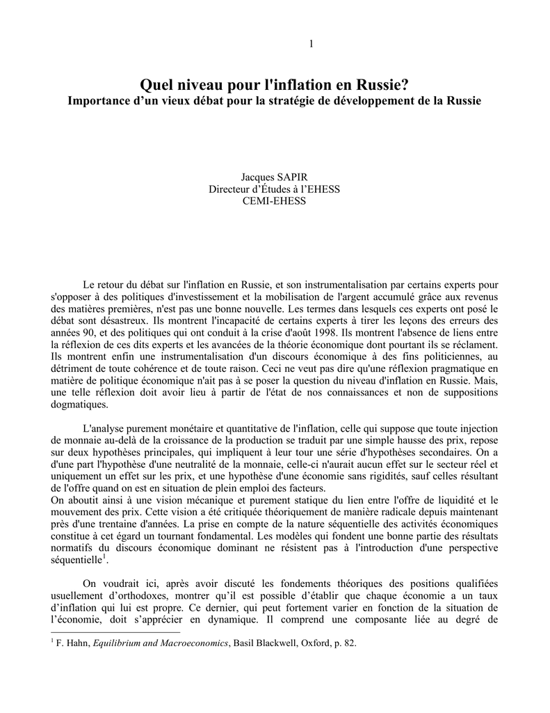 1 Quel niveau pour l'inflation en Russie? Importance d’un vieux débat pour la stratégie de développement de la Russie Jacques SAPIR Directeur d’Études à l’EHESS CEMI-EHESS Le retour du débat sur l'inflation en Russie, et son instrumentalisation par certains experts pour s'opposer à des politiques d'investissement et la mobilisation de l'argent accumulé grâce aux revenus des matières premières, n'est pas une bonne nouvelle. Les termes dans lesquels ces experts ont posé le débat sont désastreux. Ils montrent l'incapacité de certains experts à tirer les leçons des erreurs des années 90, et des politiques qui ont conduit à la crise d'août 1998. Ils montrent l'absence de liens entre la réflexion de ces dits experts et les avancées de la théorie économique dont pourtant ils se réclament. Ils montrent enfin une instrumentalisation d'un discours économique à des fins politiciennes, au détriment de toute cohérence et de toute raison. Ceci ne veut pas dire qu'une réflexion pragmatique en matière de politique économique n'ait pas à se poser la question du niveau d'inflation en Russie. Mais, une telle réflexion doit avoir lieu à partir de l'état de nos connaissances et non de suppositions dogmatiques. L'analyse purement monétaire et quantitative de l'inflation, celle qui suppose que toute injection de monnaie au-delà de la croissance de la production se traduit par une simple hausse des prix, repose sur deux hypothèses principales, qui impliquent à leur tour une série d'hypothèses secondaires. On a d'une part l'hypothèse d'une neutralité de la monnaie, celle-ci n'aurait aucun effet sur le secteur réel et uniquement un effet sur les prix, et une hypothèse d'une économie sans rigidités, sauf celles résultant de l'offre quand on est en situation de plein emploi des facteurs. On aboutit ainsi à une vision mécanique et purement statique du lien entre l'offre de liquidité et le mouvement des prix. Cette vision a été critiquée théoriquement de manière radicale depuis maintenant près d'une trentaine d'années. La prise en compte de la nature séquentielle des activités économiques constitue à cet égard un tournant fondamental. Les modèles qui fondent une bonne partie des résultats normatifs du discours économique dominant ne résistent pas à l'introduction d'une perspective séquentielle1. On voudrait ici, après avoir discuté les fondements théoriques des positions qualifiées usuellement d’orthodoxes, montrer qu’il est possible d’établir que chaque économie a un taux d’inflation qui lui est propre. Ce dernier, qui peut fortement varier en fonction de la situation de l’économie, doit s’apprécier en dynamique. Il comprend une composante liée au degré de 1 F. Hahn, Equilibrium and Macroeconomics, Basil Blackwell, Oxford, p. 82. 2 transformation de l’appareil productif, et qui définit un taux d’inflation « normal ». Il comprend aussi une composante qui traduit l’impact d’un effort exceptionnel d’investissement, qui peut être rendu nécessaire par une période antérieure de décapitalisation de l’économie. Cette composante implique de prendre en compte la variation de l’inflation dans le cadre du cycle d’investissement. Des fluctuations plus ou moins importantes de l’inflation instantanée autour du niveau « normal » sont donc prévisibles et doivent être prises en compte dans l’évaluation du taux qui peut être socialement et politiquement acceptable par rapport à une stratégie de développement donnée. I. Erreurs et incohérences du raisonnement monétariste. Le monétarisme, tant dans sa forme originelle chez Milton Friedman que dans ses formes dérivées qui constituent "l'économie standard" au FMI et chez une partie des experts économiques, affirme que toute injection de monnaie se traduit uniquement par une hausse des prix absolus. Pour arriver à cette affirmation, Milton Friedman et ses élèves doivent prétendre que les agents économiques ne sont pas sensibles aux valeurs nominales mais uniquement aux valeurs réelles. Or, cette affirmation soulève de nombreux problèmes de logique et de cohérence qui la rendent extrêmement douteuse2. Si l'on accepte l'hypothèse de Friedman que l'on ne détient de la monnaie que pour le service de sécurité qu'elle rend, et que les acteurs se polarisent sur la valeur réelle et non nominale de ce stock de monnaie, il nous faut alors faire certaines hypothèses qui se situent en amont de son raisonnement et qui sont très particulières. Tout d'abord, il nous faut supposer que le flux de ce service doit être proportionnel au degré d'incertitude régnant dans l'économie, et pas uniquement au stock de monnaie détenu. Autrement dit, on va détenir de la monnaie pour obtenir, à une date donnée, un certain service de sécurité. Mais, supposer une proportionnalité directe entre le service et le stock de monnaie signifie soit que le degré d'incertitude est constant, soit qu'il est prévisible ex-ante. Sinon, nous ne pouvons plus dire aujourd'hui quelle sera la nature exacte du service de sécurité que nous donnera demain une quantité de monnaie. Dans ces deux cas, si l'incertitude est prévisible ou constante ce n'est plus de l'incertitude, et le service de sécurité que la monnaie est supposée rendre devient superfétatoire. Face à des risques qui ne sont pas incertains, et donc probabilisables, il existe bien d'autres moyens de se prémunir, y compris de manière contractuelle. Inversement, si l'on est bien en présence d'une incertitude radicale, la notion de valeur réelle d'un stock de monnaie n'a plus de sens puisque qu'il devient impossible de déterminer à l'avance la fluctuation de cette valeur. Notre besoin de sécurité nous renvoie alors à un montant nominal de monnaie, car il est la seule chose dont nous puissions être assurés. Il y a là une première contradiction logique dans le raisonnement du père du monéta