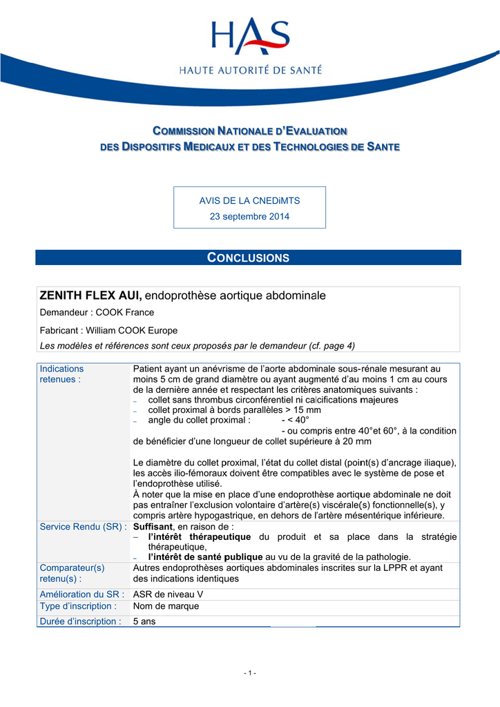 COMM MISSION N ATIONALE E D’EVALU UATION DES DIS SPOSITIFS MEDICAU UX ET DES TECHNOL LOGIES DE E SANTE AVIS D DE LA CNE EDiMTS 23 sseptembre 2014 2 CONCLUSIO ONS ZENITH Z F FLEX AUI, endoprrothèse a aortique abdomina a ale Demandeur D : COOK Fra ance Fabricant : W William COO OK Europe Les modèless et référencces sont ce eux proposé és par le dem mandeur (c cf. page 4) In ndications re etenues : Patient ayan P nt un anévrrisme de l’ao orte abdominale sous--rénale mes surant au m moins 5 cm de grand d diamètre ou ayant augm menté d’au moins 1 cm m au cours d la derniè de ère année ett respectant les critères anatomiqques suivantts : collet sa ans thrombu us circonférrentiel ni callcifications m majeures collet prroximal à bo ords parallèles > 15 mm m angle du u collet proxximal : - < 40° - ou com mpris entre 440°et 60°, à la condition d bénéficie de er d’une lon ngueur de co ollet supérie eure à 20 m mm Le diamètre L e du collet p proximal, l’état du collett distal (poinnt(s) d’ancrrage iliaque), les accès ilio-fémorauxx doivent êtrre compatib bles avec lee système de pose et èse utilisé. l’endoprothè À noter que la mise en place d’une endoproth hèse aortiquue abdomin nale ne doit p entraîne pas er l’exclusio on volontaire e d’artère(s s) viscérale((s) fonctionn nelle(s), y c compris artè ère hypogasstrique, en dehors de l’artère méssentérique inférieure. Service S Rendu (SR) : Suffisant, S en e raison de e: l’intérêtt thérapeu utique du produit et e sa placce dans la stratégiie thérapeu utique, l’intérêtt de santé p publique au vu de la gravité g de laa pathologie e. Comparateu C r(s) A Autres endo oprothèses aortiques abdominales a s inscrites ssur la LPPR R et ayant re etenu(s) : d indicatio des ons identiqu ues Amélioration A n du SR : A ASR de nive eau V Type T d’inscriiption : N Nom de marque Durée D d’insccription : 5 ans -1- Données analysées : Comme pour la demande d’inscription, aucune donnée spécifique à ZENITH FLEX AUI n’est disponible. Les inclusions de cette étude post-inscription observationnelle, prospective, multicentrique (16 centres français actifs) ont débuté en mai 2013. Cent quinze patients ont été inclus sur les 180 patients prévus dans l’étude. Seul un suivi à 6 mois était disponible pour 40 patients et à un an pour 3 patients. Éléments conditionnant le SR : Spécifications techniques : Aucune exigence supplémentaire par rapport aux spécifications techniques proposées par le fabricant Modalités de prescription et d’utilisation : L’implantation de l’endoprothèse ZENITH FLEX AUI doit être réalisée conformément aux recommandations émises par la HAS/ANSM incluant, entre autres : La nécessité d’informer les patients des avantages et les inconvénients des deux techniques et des incertitudes à long terme, et l’évolutivité possible de l’AAA. Pour permettre un choix éclairé impliquant le patient, une notice d’information au patient a été validée, destinée à être mise à la disposition des praticiens. L’environnement opératoire : la pose d’une endoprothèse aortique abdominale ne doit être envisagée que dans un centre pluridisciplinaire regroupant des activités chirurgicale et radiologique. Ce centre doit avoir une pratique régulière de la chirurgie vasculaire, des thérapeutiques endovasculaires et des explorations radiologiques à visée vasculaire. La collaboration radio-chirurgicale est recommandée. La salle où se déroule la pose doit répondre à des critères de qualité chirurgicale permettant une intervention majeure et radiologique (traitement numérisé de l’image avec un mode soustraction, matériel et salle de cathétérisme conforme à un bloc opératoire en termes d’asepsie, injecteur de produit de contraste, respect des contraintes de radioprotection du personnel). Il est important de rappeler les conditions dans lesquelles devront être pratiqués ces interventions afin d’assurer une sécurité optimale au patient. Pour les centres débutants, l’assistance d’un médecin tuteur est recommandée pour la mensuration et la pose des 6 premiers implants. La surveillance du patient est obligatoire à long terme. En son absence le traitement ne peut pas être considéré comme complet. Cette surveillance est sous la responsabilité de l’implanteur selon un calendrier précis dont le patient aura été informé. Ces examens se dérouleront conformément aux recommandations du « Guide du bon usage des examens d’imagerie médicale». Conditions du renouvellement : La CNEDiMTS subordonne le renouvellement d’inscription de l’endoprothèse ZENITH FLEX AUI à la transmission des résultats d'une étude de suivi spécifique mise en place sur une cohorte de patients représentative de la population traitée en conditions réelles d’utilisation. L’objectif de l’étude est d’évaluer l’intérêt de la technique en documentant, la mortalité globale, les complications (endofuite, migration), le taux de conversion chirurgicale, l’évolution et la rupture de l’anévrisme, à long terme, c'est-à-dire au-delà de 5 ans. -2- Population cible : Cette étude de cohorte prospective devra concerner au moins 150 patients implantés après inscription sur la LPPR. L’évaluation de ce suivi pourra aboutir à la recommandation par la CNEDiMTS du maintien ou à la suppression de la prise en charge de l’endoprothèse aortique abdominale concernée. Seuls des résultats préliminaires de l’étude post-inscription demandée sont disponibles. La Commission souhaite disposer du rapport final de l’étude postinscription lors de la prochaine demande de renouvellement d’inscription. Environ 6 000 patients Avis 1 définitif -3- ARGUMENTAIRE 01 NATURE DE LA DEMANDE Demande de renouvellement d’inscription sur la liste des produits et prestations mentionnés à l’article L 165-1 du code de la Sécu