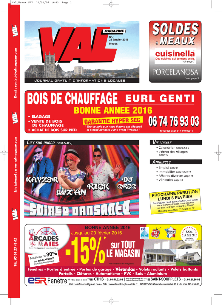 21/01/16 9:43 Page 1 E MAGAZIN Val_Meaux N°7 Email : [email protected] N°7 25 janvier 2016 Meaux SOLDES à MEAUX Voir page 7 PORCELANOSA Voir page 9 BOIS DE CHAUFFAGE EURL GENTI E MAGAZIN BONNE ANNEE 2016 Site Internet : www.valmagazine.com • ELAGAGE • VENTE DE BOIS DE CHAUFFAGE • ACHAT DE BOIS SUR PIED LIZY-SUR-OURCQ GARANTIE HYPER SEC " Tout le bois que nous livrons est découpé et stocké pendant 2 ans avant livraison " 06 74 76 93 03 N° SIRET : 531 017 440 00011 VIE LOCALE (VOIR PAGE 4) • Calendrier pages 2 à 6 • L’écho des villages page 12 ANNONCES • Emploi page 8 • Immobilier page 10 et 11 • Affaires diverses page 13 • Véhicules page 15 PARUTION PROCHAINE VRIER LUNDI 8cetteFE textes parution, vos E MAGAZIN ns Pour figurer daes doivent nous parvenir février. ou annonc ur le mardi 2 au plus tard po .49.02 23 t au 03.64. Renseignemen Tél. 03 64 23 49 02 BONNE ANNEE 2016 Jusqu’au 20 février 2016 * 30% iez de ôt Bénéfic it d’imtipque* é de créd n énerg transitio -15% sur TOUT LE MAGASIN *Voir conditions en magasins. Fenêtres - Portes d’entrée - Portes de garage - Vérandas - Volets roulants - Volets battants Portails - Clôtures - Automatisme - PVC - Bois - Aluminium 19 rue Gérard de Nerval - 77280 OTHIS - 01.60.54.22.98 4 rue du 5 septembre 1914 (près de Carrefour Market) 77165 SAINT-SOUPPLETS - 01.60.24.66.92 Mail : [email protected] - Site : www.fenetre-plus-othis.fr OUVERTURE : Du lundi au samedi de 9h à 12h et de 14h à 18h30 Val_Meaux N°7 21/01/16 9:43 Page 2 TROP DE CREDITS ! CALENDRIER UNE SOLUTION S’OFFRE A VOUS EN REGROUPANT TOUS VOS CREDITS même pour les locataires et les propriétaires fichés consultation gratuite et sans engagement Un crédit vous engage et doit être remboursé. Vérifiez vos capacités de remboursement avant de vous engager NEW DEPART FINANCE 17 ans à votre écoute. Mandaté par SYGMA. [email protected] 01.60.01.21.98 - N° ORIAS 13003411 BOISSY-FRESNOY 60 Loto Le Comité des fêtes de Boissy-Fresnoy organise son loto le samedi 30 janvier dans la salle multifonctions, ouverture des portes à 18h30, début des jeux 20h30. Tarifs : 1 carton 4 euros, 3 cartons 8 euros, 7 cartons 16 euros, 10 cartons 22 euros, plaque de 12 cartons 20 euros. Parties enfants. Lots : ecran plat, lave linge, vtt, caméra sportive, pompe à bière, machine à café, centrale à vapeur, perceuse, sèche cheveux, imprimante et de nombreux autres lots. Tombola. Buvette et restauration sur place. Pour la réservation de vos places : 06.21.53.79.33 ou 06.09.02.72.18 ou 03.44.87.72.78 (le soir). Sounds for Tana - Concert Rock Sounds for Tana, association musicale ayant pour but de soutenir moralement et financièrement l'action de Pedro 06.29.98.06.65 ou par mail les2rouesde [email protected] 02 CHATEAU-THIERRY Après-midi dansant La Guinguette de la Fontaine et R2M La Radio Plus, organise, en partenariat avec la municipalité de Château-Thierry, un après-midi dansant le dimanche 7 février à partir de 15h, dans la grande salle parquetée du Palais des Rencontres, avenue de Lauconnois, quartier Blanchards à Château-Thierry. L'animation sera assurée par le sympathique Orchestre Mady Musette (pour la première fois à Château-Thierry). Boissons et pâtisserie sur place. Prix entrée par personne : 10 euros. Renseignements complémentaires et réservations au 03.60.38.50.64 ou 03.23.69.25.30 ou sur le site www.laguinguettedela fontaine.com BONNE ANNEE 2016 à Lizy-sur-Ourcq Enfant - Femme - Homme Shampoing + coupe + coiffage homme 16€ Shampoing + coupe + coiffage femme Shampoing brushing + + balayage 24€ Shampoing + coupe + couleur 45€ 38€ Offres valables jusqu’au 27/02/16 sur présentation de cette publicité. 24, rue Jean Jaurès - 77440 Offres exceptionnelles ouvert du mardi au vendredi LIZY-SUR-OURCQ de 9h00 à 12h00 / 14h00 à 19h00 01.60.01.73.60 Opeka en faveur des plus démunis de Madgascar, est invité par l'association "Les 2 roues de Boissy-Fresnoy" pour un grand concert rock ! Au programme, des reprises de Queen, Led Zeppelin, Pink Floyd, Alanis Morissette, Radiohead, Bob Dylan, Muse... Ce concert s'adresse à la fois aux amateurs et fans de ce style de musique, et aussi à toute personne qui souhaite contribuer utilement à aider à sortir de la misère des dizaines de milliers de Malgaches. Deux heures de show pour permettre de soutenir financièrement et moralement l'action de Pedro Opeka en faveur des plus démunis de Madagascar... Venez nombreux, et pensez à réserver ! Réservation obligatoire par téléphone au Le samedi de 9h00 à 18h00 77 CHAUCONINNEUFMONTIERS Talents de Chauc' Samedi 6 février à 20h30, le Comité des Fêtes et le Service Enfance Jeunesse de Chauconin-Neufmontiers organisent dans la salle polyvalente l'édition 2016 de Talent de Chauc'. Inscrivez-vous sans attendre. Quelle que soit votre spécialité (danse, chant, sketch, spectacle, cirque...), vous pouvez participer seul ou à plusieurs dans l'une des 3 catégories : moins de 10 ans, de 11 à 17 ans ou adultes, pour une prestation de 1 à 4 minutes. Inscription obes sexy Lingerie et r ins Jouets coqu Poppers… s p r o c e d Produits www.facebook.com/pour.elles.9 www.pourelles2.fr 2 boutiques Bonne année 2016 u Nouvea D é s i r s S e n s u e l s Pour Elles 13 bis rue Victor Baltard - ZI La Motte Soldes 4 rue Madame Dassy MEAUX - 01.64.33.89.91 Ouvert du lundi au samedi Page 2 (Grand parking) CLAYE-SOUILLY - 01.64.66.14.04 gratuite sous réserve de place avant le 30 janvier sur [email protected] et retrouvez toutes les infos sur le site http://cdf.cn.free.fr CHAUFFRY 77 Brocante d'intérieur Les P'tits Loups de Chauffry organisent leur brocante d'intérieur sur 2 jours du samedi 6 février au dimanche 7 février dans la salle des fêtes de Chauffry. Ouvert aux particuliers et aux professionnels. Intérieur 5 euros le ml ou 9 euros pour les 2 jours, et en extérieur 4 euros le ml ou 8 euros pour les 2 jours. Renseignements et r