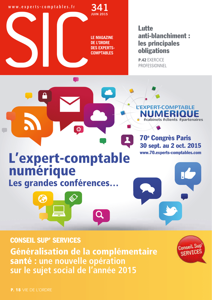 SIC www.experts-comptables.fr 341 JUIN 2015 LE MAGAZINE DE L’ORDRE DES EXPERTSCOMPTABLES Lutte anti-blanchiment : les principales obligations P.42 EXERCICE PROFESSIONNEL 70e Congrès Paris 30 sept. au 2 oct. 2015 L’expert-comptable numérique www.70.experts-comptables.com Les grandes conférences… CONSEIL SUP’ SERVICES Généralisation de la complémentaire santé : une nouvelle opération sur le sujet social de l’année 2015 P. 18 VIE DE L’ORDRE Le Cloud Cegid, le seul nuage sécurisé capable de vous dégager l’horizon. PROFESSION COMPTABLE www.cegid.fr ÉDITORIAL Être à l’écoute ! E tre à l’écoute, c’est remplir son mandat d’élu avec humilité et sagesse, afin de prendre les meilleures décisions en évitant l’écueil de la subjectivité. Etre à l’écoute de la profession, c’est rencontrer les cabinets de toutes tailles, des plus petits aux plus grands, de tous modes d’exercice, des réseaux aux AGC, afin de répondre à leurs attentes. Etre à l’écoute des syndicats et des forces vives de la profession, c’est construire les projets dans une démarche globale et unitaire afin de leur donner le maximum de force et par conséquent de chances de succès. Etre à l’écoute des élus du Conseil supérieur, c’est agir dans le respect de toutes les tendances de la profession. Etre à l’écoute des membres du Bureau, c’est partager l’information pour engager collectivement une réflexion destinée à relever les défis auxquels nous devons faire face. Etre à l’écoute des membres du Comité exécutif, c’est instituer un processus de décision collégial, et réduire les risques d’erreurs. Etre à l’écoute des collaborateurs permanents de l’Ordre, c’est créer un climat propice à une meilleure mise en œuvre opérationnelle des décisions prises dans l’intérêt des cabinets. “ Etre à l’écoute des entreprises, c’est être capable d’évoluer et d’adapter notre offre de services à leurs attentes, de les accompagner dans leur développement et de garder leur confiance. ” Etre à l’écoute des entreprises, c’est être capable d’évoluer et d’adapter notre offre de services à leurs attentes, de les accompagner dans leur développement et de garder leur confiance. Etre à l’écoute des partenaires des cabinets, c’est construire avec eux des actions utiles, notamment pour conduire leur évolution. Etre à l’écoute des partenaires institutionnels de la profession, c’est créer des bases de confiance sur lesquelles construire des projets solides et parfois rapidement, pour répondre aux urgences des réformes publiques. Etre à l’écoute de notre environnement et de la société en mutation, c’est faire en sorte de maintenir notre profession dynamique et réactive au cœur des échanges d’information. Etre à l’écoute des pouvoirs publics, c’est entretenir un dialogue constructif à même de nous permettre d’anticiper les réformes et de les déployer avec efficacité, dans l’intérêt de tous. « Si parler est un besoin, écouter est un art ». Les enjeux du moment sont d’une telle importance pour l’avenir de la profession, que l’art de l’écoute s’impose. Philippe Arraou Président du Conseil supérieur JUIN 2015 SIC 341 3 SOMMAIRE 3. ÉDITORIAL 6. EN BREF www.70.experts-comptables.com p. 8 à 17 8. FOCUS L’expert-comptable numérique : les grandes conférences… EXERCICE PROFESSIONNEL p. 18 18.VIE DE L’ORDRE Une nouvelle opération sur le sujet social de l’année 2015 ! 25.DSN : à vos “annule et remplace” prêts ! 26.Du nouveau dans le montant de la gratification à verser aux stagiaires 28.Lettre de mission d’assistance en matière sociale 29 Quoi de neuf sur le site Infodoc-experts ? 30.Régime simplifié d’imposition à la TVA : c’est à présent qu’il faut intégrer les changements ! 20. A ider vos clients à choisir leur forme juridique 22.Afeca : une dynamique au service de la marque Expert-comptable 32.Actualités juridiques 34.Publication d’une carte des pratiques et montages abusifs p. 37 37.Un nouveau kit mission pour accompagner les créateurs d’entreprise ! 38.Analyses sectorielles : une étude complète sur le secteur de la coiffure 40.Le diplôme d’expertise comptable : retour d’expérience et stratégie de réussite 42.Lutte anti-blanchiment : faites le point ! 23.Amérique latine : le 8e Forum économique CReCER 50.A LIRE a c t u s des régions p.38 44. Toulouse Midi-Pyrénées - 46. Marseille Paca 48. Paris Ile- de-France DANS LA RFC Dossier « Financement des entreprises » Revue mensuelle de l’ordre des experts-comptables éditée par Experts-Comptables Services • 19, rue Cognacq-Jay 75341 Paris cedex 07 • Tél. 01 44 15 60 00 • Fax 01 44 15 90 05 • Tirage : 29 800 exemplaires • Directeur de la publication : Philippe Arraou, président • Directeur délégué de la publication : Olivier Salamito, secrétaire général • Rédacteur en chef : René Keravel, président de la commission Publications • Rédacteurs en chef adjoints : Françoise Berthon, Alain Chandioux, Pierre Grafmeyer, Pierre-Alain Millot • Comité de rédaction : F. Balden, P. Boyer, A. Delemer, C. Dumont, A. Fages, E. Ferdjallah-Cherel, G. Filho, M. Laqhila, J. Liziard, U. Lopez, G. Patetta, H. Tondeur • Secrétaire de rédaction : Justine Liziard • Maquette et infographie : Françoise Balden • Fabrication : Catherine Licini • Régie de la publicité : APAR - Tél. 01 41 49 02 90 • Impression : Imp. Fabrègue • Saint-Yrieix – Limoges – Paris • Dépôt légal : Juin 2015 • Abonnements • (non-membres de l’Ordre) • France et étranger 93,76 e • supplément avion 44,21 e • Agences - 33 % • Ets d’enseignement - 50 % règlement à l’ordre d’Experts Comptables Services • Liste des annonceurs • Cegid 2e de couv. • ACD p. 4 • Axa p. 7 • Cipres p. 15 • Revue Fiduciaire p. 17 • Malakoff Mederic p. 19 • 