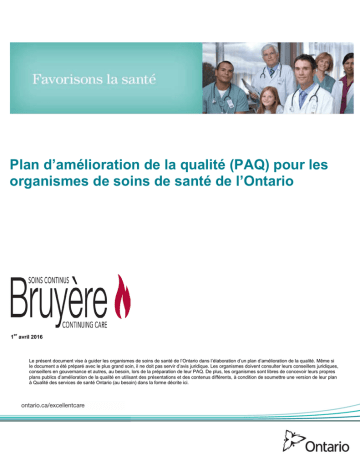 Plan d’amélioration de la qualité (PAQ) pour les organismes de soins de santé de l’Ontario er 1 avril 2016 Le présent document vise à guider les organismes de soins de santé de l’Ontario dans l’élaboration d’un plan d’amélioration de la qualité. Même si le document a été préparé avec le plus grand soin, il ne doit pas servir d’avis juridique. Les organismes doivent consulter leurs conseillers juridiques, conseillers en gouvernance et autres, au besoin, lors de la préparation de leur PAQ. De plus, les organismes sont libres de concevoir leurs propres plans publics d’amélioration de la qualité en utilisant des présentations et des contenus différents, à condition de soumettre une version de leur plan à Qualité des services de santé Ontario (au besoin) dans la forme décrite ici. Inscrire le nom de l’organisme Inscrire l’adresse de l’organisme 1 Aperçu La mission de Soins continus Bruyère est d’exceller dans la prestation de soins et des services de santé fondés sur des données probantes pour les personnes vulnérables et celles atteintes de problèmes médicaux complexes, et nous mettons l’accent sur les personnes qui requièrent des soins subaigus, gériatriques ou palliatifs. Inspiré de sa fondatrice, la mère Élisabeth Bruyère, notre organisme de soins de santé catholique vise l’optimisation de la qualité de vie des gens qui composent la collectivité diversifiée qu’il sert, en français et en anglais. Nous y parvenons grâce à notre engagement envers l’excellence, l’éducation, la recherche, l’innovation, les partenariats régionaux et la prestation des soins plus près du domicile des patients. Notre vision : Enrichir des vies et transformer les soins. Notre plan stratégique comprend plusieurs orientations et buts sur la sécurité des patients et la qualité des soins qui témoignent de l’engagement de notre conseil d’administration, de notre équipe de direction, de notre personnel et de nos médecins à fournir des soins attentionnés, sécuritaires et de qualité à nos patients. Les objectifs présentés dans notre PAQ servent à renforcer cet engagement et se font l’écho de l’importance de la sécurité et de la qualité des soins dans la mission et les valeurs de Bruyère. Les objectifs présentés dans le PAQ de Bruyère tiennent compte de plusieurs buts et orientations stratégiques décrits dans notre plan stratégique 2015-2020. Tout comme dans notre plan stratégique, la priorité de notre PAQ est la sécurité de nos populations de patients et notre engagement à leur égard. Comme la qualité est un concept multidimensionnel, les objectifs prioritaires présentés dans le PAQ concernent divers aspects de l’approche centrée sur le patient et de la sécurité des patients. Pour 2016-2017, l’organisme a ciblé quatre secteurs prioritaires à améliorer : • Rehausser la satisfaction des patients • Accroître le respect de l’hygiène des mains avant de toucher à un patient ou à son environnement • Effectuer un bilan comparatif des médicaments dans les 24 heures suivant l’admission • Réduire le risque de chutes chez les patients MÉDECINE FAMILIALE L’équipe de santé familiale (ESF) universitaire Bruyère occupe deux emplacements au centre-ville d’Ottawa. Ce sont deux importants centres de formation pour le programme de médecine familiale de l’Université d’Ottawa. Nous y avons 12 300 patients inscrits et 4000 patients non inscrits. Les deux priorités majeures de nos cliniques sont les soins aux patients et la médecine familiale, qui est aussi un domaine de spécialité pour les universitaires. Nous fournissons de soutien et des programmes universitaires surtout aux résidents en médecine familiale, mais nous accueillons également des apprenants en pharmacie, soins infirmiers, professions paramédicales et d’autres qui suivent une formation d’infirmière praticienne ou d’infirmier praticien. Nous sommes situés à Soins continus Bruyère et adhérons à la philosophie de la mère Bruyère, une religieuse catholique pionnière; par conséquent, nous visons à intégrer les soins aux populations défavorisées. Dans cette perspective, et pour offrir des programmes de proximité, nous fournissons des soins à plusieurs organismes, notamment l’Hospice à May Court, la Mission d’Ottawa, les centres pour jeunes parents célibataires (la Maison Sainte-Marie et le Centre d’espoir Bethany), la Maison unitarienne et la Maison Sophia Reception House pour réfugiés. Inscrire le nom de l’organisme Inscrire l’adresse de l’organisme 2 Le processus de mise en place du PAQ consistait en la préparation des objectifs, mesures et indicateurs par le comité sur la Qualité au sein de l’ESF universitaire Bruyère, qui regroupe des professionnels de diverses spécialités représentant les divers secteurs de notre ESF. Le PAQ proposé a été présenté au comité de gestion de l’ESF et au conseil d’administration de l’ESF pour approbation. Nous avons sollicité les commentaires du comité d’AQ et des secteurs de notre ESF. Notre PAQ est cohérent avec : A. Les priorités et mesures du ministère de la Santé et des Soins de longue durée 1. Une expérience-patient efficace, efficiente et équitable B. Le plan stratégique de l’ESF universitaire Bruyère Le plan stratégique poursuit les objectifs suivants : 1. L’ESF doit fournir des soins exemplaires et efficients à une population diversifiée de patients et accorder une attention particulière aux personnes vulnérables et à celles qui n’ont pas accès aux services de soins primaires. 2. L’ESF doit servir de site de formation en médecine familiale aux universitaires de premier cycle et de cycle supérieur. L’ESF doit aussi se faire site de formation en soins infirmiers et paramédicaux pour les apprenants à la recherche de formation en milieu offrant des soins primaires. 3. L’ESF doit pre