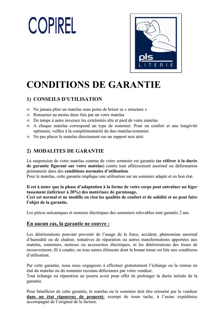 CONDITIONS DE GARANTIE 1) CONSEILS D’UTILISATION • • • • • Ne jamais plier un matelas sous peine de briser sa « structure » Retourner au moins deux fois par an votre matelas De temps à autre inversez les extrémités tête et pied de votre matelas A chaque matelas correspond un type de sommier. Pour un confort et une longévité optimum, veillez à la complémentarité du duo matelas/sommier. Ne pas placer le matelas directement sur un support non aéré. 2) MODALITES DE GARANTIE La suspension de votre matelas comme de votre sommier est garantie (se référer à la durée de garantie figurant sur votre matelas) contre tout affaissement anormal ou déformation prématurée dans des conditions normales d’utilisation. Pour le matelas, cette garantie implique une utilisation sur un sommier adapté et en bon état. Il est à noter que la phase d’adaptation à la forme de votre corps peut entraîner un léger tassement (inférieur à 20%) des matériaux de garnissage. Ceci est normal et ne modifie en rien les qualités de confort et de solidité et ne peut faire l’objet de la garantie. Les pièces mécaniques et moteurs électriques des sommiers relevables sont garantis 2 ans. En aucun cas, la garantie ne couvre : Les détériorations pouvant provenir de l’usage de la force, accident, phénomène anormal d’humidité ou de chaleur, tentatives de réparation ou autres transformations apportées aux matelas, sommiers, moteurs ou accessoires électriques, ni les détériorations des tissus de recouvrement, fil à coudre, ou tous autres éléments dont la bonne tenue est liée aux conditions d’utilisation. Par cette garantie, nous nous engageons à effectuer gratuitement l’échange ou la remise en état du matelas ou du sommier reconnu défectueux par votre vendeur. Tout échange ou réparation ne pourra avoir pour effet de prolonger la durée initiale de la garantie. Pour bénéficier de cette garantie, le matelas ou le sommier doit être retourné par le vendeur dans un état rigoureux de propreté, exempt de toute tache, à l’usine expéditrice accompagné de l’original de la facture.