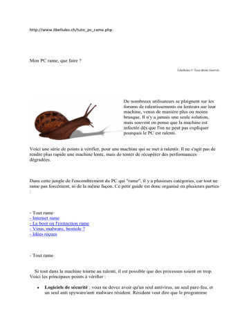 http://www.libellules.ch/tuto_pc_rame.php Mon PC rame, que faire ? Libellules © Tous droits réservés De nombreux utilisateurs se plaignent sur les forums de ralentissements ou lenteurs sur leur machine, venus de manière plus ou moins brusque. Il n'y a jamais une seule solution, mais souvent on pense que la machine est infectée dès que l'on ne peut pas expliquer pourquoi le PC est ralenti. Voici une série de points à vérifier, pour une machine qui se met à ralentir. Il ne s'agit pas de rendre plus rapide une machine lente, mais de tenter de récupérer des performances dégradées. Dans cette jungle de l'encombrement du PC qui "rame", il y a plusieurs catégories, car tout ne rame pas forcément, ni de la même façon. Ce petit guide est donc organisé en plusieurs parties : - Tout rame - Internet rame - Le boot ou l'extinction rame - Virus, malware, bestiole ? - Idées reçues - Tout rame Si tout dans la machine tourne au ralenti, il est possible que des processus soient en trop. Voici les principaux points à vérifier : Logiciels de sécurité : vous ne devez avoir qu'un seul antivirus, un seul pare-feu, et un seul anti spyware/anti malware résident. Résident veut dire que le programme tourne silencieusement à l'arrière plan, en permanence, et démarre avec Windows. Causes : Deux antivirus résidents ne servent à rien et se gênent mutuellement : chaque fichier est analysé deux fois, et le deuxième antivirus doit attendre que le premier ait terminé. Le même raisonnement s'applique aux firewalls et à la gestion des connexions. NB : le pare-feu de Windows peut être désactivé si vous avez installé un autre parefeu. Pour cela, ouvrez le panneau de configuration, puis "Pare-feu Windows". Diagnostic : regardez ce que vous avez installé, dans le panneau de configuration, puis Ajout/Suppression de programmes. Le cas échéant, il est possible de faire faire le diagnostic sur un forum. Solutions : Désinstaller les logiciels qui sont en trop. Température : une température du processeur trop élevée peut déclencher des dispositifs de ralentissement selon le matériel que vous utilisez. Diagnostic : Contrôlez la température avec un programme comme Everest. Au dessus de 60°C pour le processeur, sans sollicitation particulière (voir point suivant), posezvous des questions sur le refroidissement. Solutions : au besoin dépoussiérez le radiateur de votre processeur, sur un PC fixe. Consultez les guides sur internet, cette opération est délicate et comporte une petite part de risque en cas de mauvaise manipulation. 100% CPU : La charge du processeur peut-être très élevée, et paralyser la machine, qui se retrouve très fortement ralentie. Causes : Un bug de Windows, un driver, ou des malwares peuvent provoquer cela. Diagnostic : Ouvrez le gestionnaire de processus (CTRL+ALT+SUPPR), et regardez la charge du processeur, indiquée en pourcentage dans l'onglet Performances, ou en bas, pour n'importe quel onglet. Sur la copie d'écran, le processeur a 4 coeurs, et les 4 coeurs sont à fond. Lorsqu'un seul processeur est à fond, le total affiché est donc de 25%. Sur une machine double coeur, 50% correspond à un coeur à fond. Suivant le problème, le chiffre affiché n'est donc pas forcément 100%. Ouvrez l'onglet Processus, et isolez le ou les processus responsables de la surcharge : Responsable n'est pas nécessairement coupable. - Dans le premier encadré, les 4 processus vont être acquittés : il s'agit de calcul partagé avec Boinc, logiciel légitime installé par mes soins. - Le deuxième encadré bénéficiera d'un non-lieu : le processus inactif du système fait partie de Windows, et correspond aux ressources processeur disponibles : quand le processeur travaille à 10%, le processus inactif affiche 90%. Solutions : - Si svchost.exe (écrit exactement comme cela, avec les lettres dans cet ordre) est responsable, il s'agit probablement du processus Windows légitime. Passez par Windows Updates dans un premier temps, et le cas échéant, réinstallez votre carte réseau ou ses pilotes. - Si nwiz.exe est le processus responsable, sélectionnez-le dans le gestionnaire des tâches, et cliquez sur le bouton Terminer le processus. Il s'agit d'un driver nVidia, qui peut poser problème. Pour éviter qu'il revienne au démarrage suivant, utilisez Msconfig ou autre programme pour l'empêcher de redémarrer. Au besoin, passez par ce fichier .REG : - Si le CPU bloque sur explorer.exe ou après avoir prévisualisé des fichiers AVI (vidéo) dans l'explorateur Windows, qui deviennent impossibles à supprimer. Supprimez des clés de registre responsables de la fonction de prévisualisation, liées à la CLSID {87D62D94-71B3-4b9a-9489-5FE6850DC73E} (PropertyHandler et InProcServer32). Pour le faire rapidement, utilisez ce fichier reg : Ce fichier reg rétablira en cas de problème ce qui a été effacé : Ouvrez la boite exécuter (touches Windows+R, ou dans le menu démarrer), et validez cette commande : regsvr32.exe -u shmedia.dll La commande pour rétablir le comportement normal est : regsvr32.exe shmedia.dll - Si wuauclt.exe est responsable sous XP, il s'agit du processus de Windows Updates. Assurez-vous d'avoir fait la mise à jour KB927891. Pour les autres, il peut y avoir besoin de réinitialiser les composants Windows Updates. o o o o o o o Pour cela téléchargez Dial-a-Fix, Enregistrez-le sur le Bureau. Décompressez-le puis double-cliquez sur le dossier " Dial-a-fix" qui vient d'être créé puis sur le fichier "Dial-a-fix.exe". Dans la fenêtre principale, cochez Fix Windows update et les trois cases en dessous. Cliquez ensuite sur "GO" et laissez le logiciel travailler. Chaque action en cours est soulignée et une fois terminée elle se décoche automatiquement. Cliquez enfin sur le bouton "Flush SoftwareDistribution" et redémarrez la machine. - Processus inconnu : utilisez un bon antimalware, par exemple MalwareBytes AntiMalware, ou passer pas la case Virus