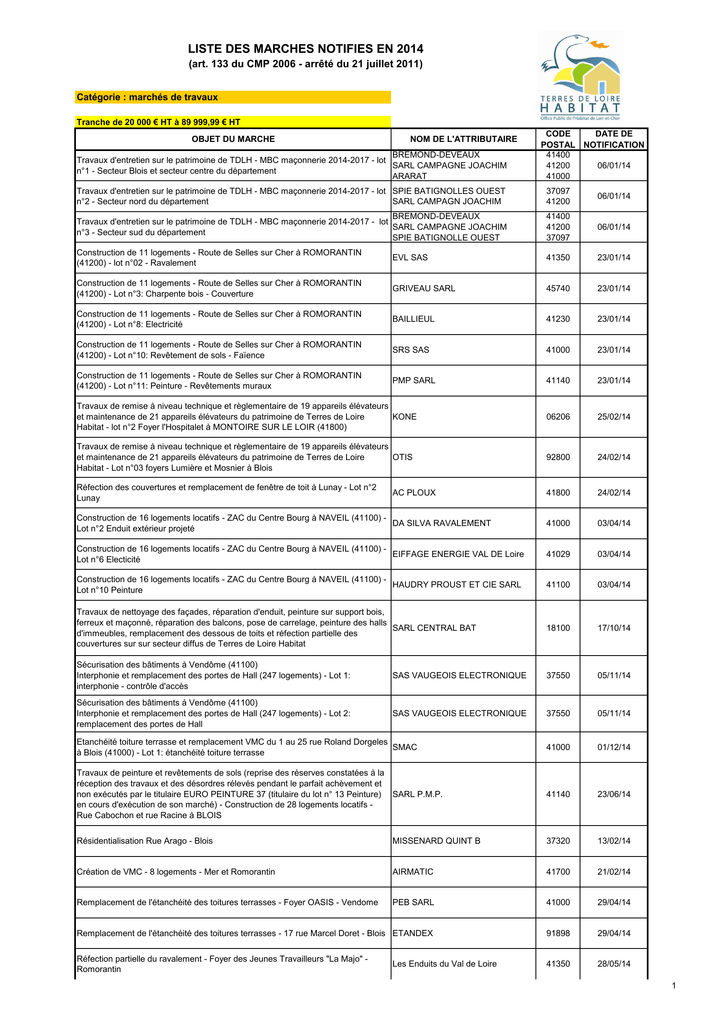 LISTE DES MARCHES NOTIFIES EN 2014 (art. 133 du CMP 2006 - arrêté du 21 juillet 2011) Catégorie : marchés de travaux Tranche de 20 000 € HT à 89 999,99 € HT OBJET DU MARCHE NOM DE L'ATTRIBUTAIRE BREMOND-DEVEAUX Travaux d'entretien sur le patrimoine de TDLH - MBC maçonnerie 2014-2017 - lot SARL CAMPAGNE JOACHIM n°1 - Secteur Blois et secteur centre du département ARARAT CODE DATE DE POSTAL NOTIFICATION 41400 06/01/14 41200 41000 Travaux d'entretien sur le patrimoine de TDLH - MBC maçonnerie 2014-2017 - lot SPIE BATIGNOLLES OUEST n°2 - Secteur nord du département SARL CAMPAGN JOACHIM 37097 41200 06/01/14 BREMOND-DEVEAUX Travaux d'entretien sur le patrimoine de TDLH - MBC maçonnerie 2014-2017 - lot SARL CAMPAGNE JOACHIM n°3 - Secteur sud du département SPIE BATIGNOLLE OUEST 41400 41200 37097 06/01/14 Construction de 11 logements - Route de Selles sur Cher à ROMORANTIN (41200) - lot n°02 - Ravalement EVL SAS 41350 23/01/14 Construction de 11 logements - Route de Selles sur Cher à ROMORANTIN (41200) - Lot n°3: Charpente bois - Couverture GRIVEAU SARL 45740 23/01/14 Construction de 11 logements - Route de Selles sur Cher à ROMORANTIN (41200) - Lot n°8: Electricité BAILLIEUL 41230 23/01/14 Construction de 11 logements - Route de Selles sur Cher à ROMORANTIN (41200) - Lot n°10: Revêtement de sols - Faïence SRS SAS 41000 23/01/14 Construction de 11 logements - Route de Selles sur Cher à ROMORANTIN (41200) - Lot n°11: Peinture - Revêtements muraux PMP SARL 41140 23/01/14 Travaux de remise à niveau technique et règlementaire de 19 appareils élévateurs et maintenance de 21 appareils élévateurs du patrimoine de Terres de Loire KONE Habitat - lot n°2 Foyer l'Hospitalet à MONTOIRE SUR LE LOIR (41800) 06206 25/02/14 Travaux de remise à niveau technique et règlementaire de 19 appareils élévateurs et maintenance de 21 appareils élévateurs du patrimoine de Terres de Loire OTIS Habitat - Lot n°03 foyers Lumière et Mosnier à Blois 92800 24/02/14 Réfection des couvertures et remplacement de fenêtre de toit à Lunay - Lot n°2 Lunay 41800 24/02/14 Construction de 16 logements locatifs - ZAC du Centre Bourg à NAVEIL (41100) DA SILVA RAVALEMENT Lot n°2 Enduit extérieur projeté 41000 03/04/14 Construction de 16 logements locatifs - ZAC du Centre Bourg à NAVEIL (41100) EIFFAGE ENERGIE VAL DE Loire Lot n°6 Electicité 41029 03/04/14 Construction de 16 logements locatifs - ZAC du Centre Bourg à NAVEIL (41100) HAUDRY PROUST ET CIE SARL Lot n°10 Peinture 41100 03/04/14 Travaux de nettoyage des façades, réparation d'enduit, peinture sur support bois, ferreux et maçonné, réparation des balcons, pose de carrelage, peinture des halls SARL CENTRAL BAT d'immeubles, remplacement des dessous de toits et réfection partielle des couvertures sur sur secteur diffus de Terres de Loire Habitat 18100 17/10/14 Sécurisation des bâtiments à Vendôme (41100) Interphonie et remplacement des portes de Hall (247 logements) - Lot 1: interphonie - contrôle d'accès SAS VAUGEOIS ELECTRONIQUE 37550 05/11/14 Sécurisation des bâtiments à Vendôme (41100) Interphonie et remplacement des portes de Hall (247 logements) - Lot 2: remplacement des portes de Hall SAS VAUGEOIS ELECTRONIQUE 37550 05/11/14 Etanchéité toiture terrasse et remplacement VMC du 1 au 25 rue Roland Dorgeles SMAC à Blois (41000) - Lot 1: étanchéité toiture terrasse 41000 01/12/14 Travaux de peinture et revêtements de sols (reprise des réserves constatées à la réception des travaux et des désordres rélevés pendant le parfait achèvement et non exécutés par le titulaire EURO PEINTURE 37 (titulaire du lot n° 13 Peinture) SARL P.M.P. en cours d'exécution de son marché) - Construction de 28 logements locatifs Rue Cabochon et rue Racine à BLOIS 41140 23/06/14 Résidentialisation Rue Arago - Blois MISSENARD QUINT B 37320 13/02/14 Création de VMC - 8 logements - Mer et Romorantin AIRMATIC 41700 21/02/14 Remplacement de l'étanchéité des toitures terrasses - Foyer OASIS - Vendome PEB SARL 41000 29/04/14 Remplacement de l'étanchéité des toitures terrasses - 17 rue Marcel Doret - Blois ETANDEX 91898 29/04/14 Réfection partielle du ravalement - Foyer des Jeunes Travailleurs "La Majo" Romorantin 41350 28/05/14 AC PLOUX Les Enduits du Val de Loire 1 nettoyage des façades et divers travaux de peinture - 1 à 27 rue Jacques Yves Cousteau - Vendôme ROULLIAUD 37390 31/07/14 Traitement des balcons - mise en place d'une étanchéité liquite protégée par un carrelage - 66 allée François 1er - Blois SMAC 41000 28/07/14 Réparation des nez de balcons - Foyer Soleil - St Ouen CENTRAL BAT 18100 27/10/14 Tranche de 90 000 € HT à 5.185.999,99 € HT OBJET DU MARCHE NOM DE L'ATTRIBUTAIRE CODE DATE DE POSTAL NOTIFICATION Travaux d'entretien sur le patrimoine de TDLH - MBC CARRELAGE 2014-2017 lot n°1 - Secteur Blois et secteur centre du département TOP DECORATION ALMEIDA CARRELAGE BREMOND-DEVAUX 41000 41000 41400 06/01/14 Travaux d'entretien sur le patrimoine de TDLH - MBC CARRELAGE 2014-2017 lot n°2 - Secteur nord du département TOP DECORATION ALMEIDA CARRELAGE SARL CAMPAGNE JOACHIM 41000 41000 41200 06/01/14 Travaux d'entretien sur le patrimoine de TDLH - MBC CARRELAGE 2014-2017 lot n°3 - Secteur sud du département TOP DECORATION ALMEIDA CARRELAGE COULEURS ET LUMIERES 41000 41000 18100 06/01/14 Construction de 11 logements - Route de Selles sur Cher à ROMORANTIN (41200) - lot n°01 - Maçonnerie BOZKURT SARL 41200 23/01/14 Construction de 11 logements - Route de Selles sur Cher à ROMORANTIN (41200) - Lot n°4: Etanchéité Asphalte BERGERET 37270 23/01/14 Construction de 11 logements - Route de Selles sur Cher à ROMORANTIN (41200) - Lot n°5: Menuiseries extérieures PVC LESPAGNOL MENUISERIE S.A.R.L. 37600 23/01/14 Construction de 11 logements - Route de Selles sur Cher à ROMORANTIN (41200) - Lot n°6: Plâtrerie - Isolation FRIBOURG Pierre S.A.S. 41700 23/01/14 Construction de 11 logements