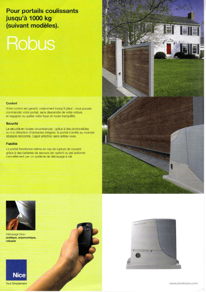 Pour portails coulissants jusqu'à 1000 kg (suivant modèles). Confort Votre confort est garanti, notamment lorsqu'il pleut : vous pouvez commander votre portail, sans descendre de votre voiture, et regagner ou quitter votre foyer en toute tranquillité. Sécurité La sécurité en toutes circonstances ; grâce à des photocellules ou à la détection d'obstacles intégrée, le portail s'arrête au moindre obstacle rencontré. Capot antichoc sans arêtes vives. Fiabilité Le portail fonctionne même en cas de rupture de courant grâce à des batteries de secours (en option) ou est actionné manuellement par un système de débrayage à clé. Débrayage Nice : pratique, ergonomique robuste Nice Tout Simplement www.niceforyou.com Nice Lampe clignotante Émetteur Pour un système encore plus sûr et confortable : FLOR PS124 MOFB MOSE LUCYB Choisisse/: votre émetteur 1, 2 ou 4 canaux pour actionner tous les automatismes de votre maison et du bureau. Batterie 24 V avec chargeur de batterie incorporé Paire de photocellules montage en applique avec technologie BlueBUS. Vous pouvez actionner votre système aussi avec un sélecteur à clé extérieur Lampe clignotante ABFKIT Antenne orientable Commodité Sécurité Service Design Un automatisme Nice est une plus-value pour la maison : • vous pourrez entrer et sortir en toute quiétude, sans descendre de voiture • les enfants jouent en toute sécurité dans le jardin. Les dispositifs de sécurité intégrés évitent le risque d'accidents liés au mouvement qui sont le propre des installations non automatisées. • la technologie raffinée de Nice à encodeur ajoute des fonctions de sécurité exclusives. Qui offre à ses clients des produits Nice croit en la valeur de la qualité : assister le client en secondant tous ses besoins et désirs, avant et après la vente, est un devoir. Adressez-vous en toute confiance à votre spécialiste Nice ! Nice développe des produits pratiques, raffinés, ergonomiques, appréciés et largement imités. Votre distributeur conseil SARL AKAD Produit par : Nice SpA Oderzo Italy Nice Tout Simplement Distribué par : Nice France Buchelay 9 Rue PARMENTIER 93220 GAGNY www.akad-domateam.com TEL : 01.41.53.82.65/06.22.81.18.81
