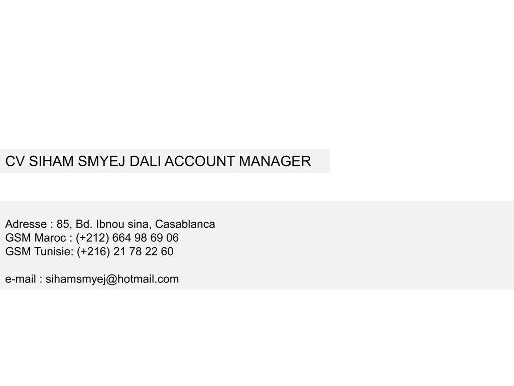 CV SIHAM SMYEJ DALI ACCOUNT MANAGER Adresse : 85, Bd. Ibnou sina, Casablanca GSM Maroc : (+212) 664 98 69 06 GSM Tunisie: (+216) 21 78 22 60 e-mail : [email protected] EXPERIENCES PROFESSIONNELLES Aout 2013 à ce jour Agence Conseil en Communication : 3SG BBDO Poste : Account Manager Senior Portefeuille de marques : • Grande distribution : MG groupe magasin general auchan • Alimentation : Groupe IAT ( KAISER, FROMY ) Descriptif de poste : Inter- agence • Garant de la performance commerciale, de la qualité des prestations et de la rentabilité du service. • Analyse des marchés et d’identification des potentiels. • Participation à la mise en œuvre de la politique commerciale au sein de l’agence, à la fidélisation, gestion et développement du portefeuille clients. . de marques Gestion •Accompagnement des marques dans la définition et le développement de leur stratégie de communication. • Gestion des budgets, des délais et de la qualité des projets. • Gestion des l’équipes de chef de pub. EXPERIENCES PROFESSIONNELLES Janvier 2012 à ce jour Agence Conseil en Communication : MMC DDB Poste : Account Manager Senior Portefeuille de marques : • Grande distribution : Meddis Géant • Automobile : Stafim Peugeot • Plateforme new business Octobre 2009 à Septembre 2011 Agence Conseil en Communication : FCA! Groupe Publicis Impact Poste : Business Director Portefeuille de marques : • Secteur financier : ATB “Arab Tunisian Bank” • Automobile : Kia Motors • Grande consommation : Henkel • Télephonie : Evertek • Corporate : Groupe Zouari • Plateforme new business EXPERIENCES PROFESSIONNELLES Novembre 2007 à Décembre 2008 Agence Conseil en Communication : PANORAMA Y&R Poste : Chef de publicité Senior Descriptif de poste : • Accompagnement et formation de l’équipe de chef de pub. •Supervision du bon déroulement des activités marketing et commercial et daytoday. •Développement de recommandation pour les marques clientes et en prospections. Portefeuille de marques : • Corporate: Henkel • Automobile : Ennakel ( Audi, Volkwagen, Porshe) • Pétrolier : Total • Grande conso : El mazraa EXPERIENCES PROFESSIONNELLES Juin 2004 à Novembre 2007 Agence Conseil en Communication : FCA! Poste : Chef de publicité Portefeuille de marques : • Secteur financier : ATB • Grande consommation : Henkel • Telephonie : LG mobile • Corporate : Groupe One tech Septembre 2004 à Juin 2004 Agence Conseil en Communication : Atlas Y&R Poste : Chef de publicité Portefeuille de marques : • Alimentaire : Délice Danone • Confiserie et Biscuiterie : ICT • Technologie : JVC EXPERIENCES PRE-PROFESSIONNELLES Juillet 2003 Septembre 2001 Juin 2001 Agence Conseil en Communication : TH COM Support presse : AUTO NEWS Stage AUTO NEWS Service rédaction Agence Conseil en Communication : Mosaïque FORMATION 2004 2002 ESIG (Ecole Supérieure Internationale de Gestion) Casablanca (école en partenariat avec l’université du Québec Chicoutimi) –Maîtrise en Communication Marketing –Bachelor en gestion commercial délivré de l’université de chicoutimie Québec. COM’SUP (Ecole supérieure de communication et de publicité) Casablanca .
