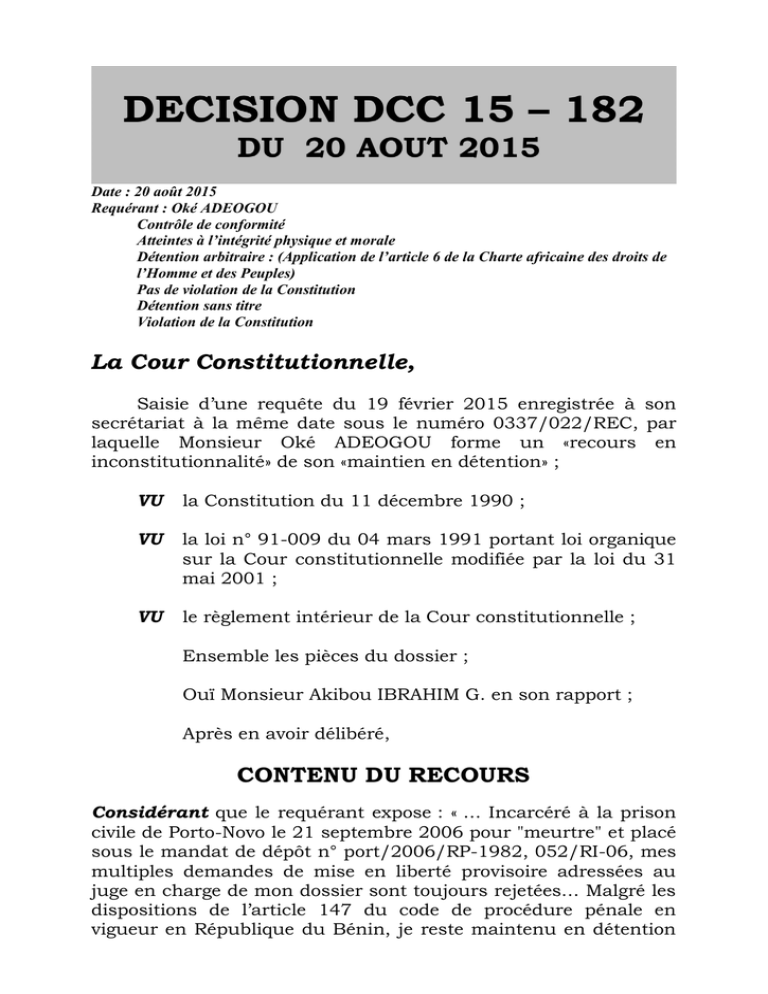 DECISION DCC 15 – 182 DU 20 AOUT 2015 Date : 20 août 2015 Requérant : Oké ADEOGOU Contrôle de conformité Atteintes à l’intégrité physique et morale Détention arbitraire : (Application de l’article 6 de la Charte africaine des droits de l’Homme et des Peuples) Pas de violation de la Constitution Détention sans titre Violation de la Constitution La Cour Constitutionnelle, Saisie d’une requête du 19 février 2015 enregistrée à son secrétariat à la même date sous le numéro 0337/022/REC, par laquelle Monsieur Oké ADEOGOU forme un «recours en inconstitutionnalité» de son «maintien en détention» ; VU la Constitution du 11 décembre 1990 ; VU la loi n° 91-009 du 04 mars 1991 portant loi organique sur la Cour constitutionnelle modifiée par la loi du 31 mai 2001 ; VU le règlement intérieur de la Cour constitutionnelle ; Ensemble les pièces du dossier ; Ouï Monsieur Akibou IBRAHIM G. en son rapport ; Après en avoir délibéré, CONTENU DU RECOURS Considérant que le requérant expose : « … Incarcéré à la prison civile de Porto-Novo le 21 septembre 2006 pour "meurtre" et placé sous le mandat de dépôt n° port/2006/RP-1982, 052/RI-06, mes multiples demandes de mise en liberté provisoire adressées au juge en charge de mon dossier sont toujours rejetées… Malgré les dispositions de l’article 147 du code de procédure pénale en vigueur en République du Bénin, je reste maintenu en détention provisoire depuis plus de huit (08) ans quatre (04) mois. Au regard des dispositions de l’article 147 alinéas 2, 3, 5 et 7 du code de procédure pénale en vigueur en République du Bénin, je vous prie … de déclarer contraire à la Constitution …, mon maintien en détention et d’exiger du tribunal de première Instance de Porto-Novo et de la cour d’Appel de Cotonou, ma mise en liberté …» ; Considérant qu’à son recours, il a joint une photocopie de son mandat de dépôt ; INSTRUCTION DU RECOURS Considérant que répondant à la mesure d’instruction diligentée par la Cour, le juge du premier cabinet d’instruction du tribunal de première Instance de Porto-Novo, Monsieur Pierre D. AHIFFON, écrit : « Soupçonné de meurtre, Oké ADEOGOU a été inculpé puis placé sous mandat de dépôt le 21 septembre 2006. Entre-temps, le cabinet en charge de la procédure est resté vacant pendant plusieurs mois. Lorsque j’ai pris la direction du cabinet et remarqué que Oké ADEOGOU a déjà passé plus de huit (08) ans de détention provisoire, j’ai pris, conformément à l’article 147 du code de procédure pénale, une ordonnance de soit communiqué le 02 octobre 2014, pour demander sa mise en liberté d’office … mais le parquet n’a pu prendre ses réquisitions favorables que le 19 janvier 2015, soit plus de trois (03) mois et demi après. Suivant l’ordonnance du juge des libertés et de la détention en date du 20 février 2015, le mandat de dépôt de l’inculpé Oké ADEOGOU a été levé. Cependant, ce n’est que le 03 avril 2015 que l’intéressé a recouvré sa liberté. Au total, dès que j’ai constaté que la détention provisoire de l’inculpé n’était plus conforme aux dispositions de l’article 147 du code de procédure pénale, j’ai pris immédiatement mes responsabilités en demandant la mainlevée d’office… » ; Considérant que pour sa part, le régisseur de la prison civile de Porto-Novo, le major Pierre S. AHOUEYA, écrit : « … La procédure tendant à la mise en liberté d’un inculpé se déroule uniquement entre le parquet et le tribunal. A la fin de cette procédure, le régisseur reçoit l’ordre de mise en liberté du parquet qu’il exécute aussitôt. Dans le cas d’espèce, l’ordre de mise en liberté de l’inculpé Oké ADEOGOU m’est parvenu dans la soirée du vendredi 03 avril 2 2015 à 21 heures 10 minutes. Les diligences ont été faites et l’inculpé a été mis en liberté le même jour… » ; Considérant qu’à sa réponse, il a joint une photocopie des pages du registre d’écrou ; Considérant que par contre, le procureur de la République près le tribunal de première Instance de Porto-Novo, invité par la mesure d’instruction n° 0688/CC/SG du 15 avril 2015 rappelée par les correspondances n° 0988/CC/SG du 1er juin 2015 et n° 1076/CC/SG du 22 juin 2015, à faire ses observations, n’a pas cru devoir y répondre ; ANALYSE DU RECOURS Considérant que les articles 6 de la Charte africaine des droits de l’Homme et des peuples et 119 de l’ordonnance n° 25 PR/M.J.L. du 07 août 1967 portant code de procédure pénale au Dahomey énoncent respectivement : « Tout individu a droit à la liberté et à la sécurité de sa personne. Nul ne peut être privé de sa liberté sauf pour des motifs et dans des conditions préalablement déterminés par la loi ; en particulier nul ne peut être arrêté ou détenu arbitrairement », « En matière correctionnelle, lorsque le maximum de la peine prévue par la loi est inférieur à un an d’emprisonnement, l’inculpé domicilié au Dahomey ne peut être détenu plus de quinze jours après sa première comparution devant le juge d’instruction, s’il n’a pas été déjà condamné pour crime ou délit de droit commun. En tout autre cas, aussi longtemps que le juge d’instruction demeure saisi de l’affaire, la détention préventive ne peut excéder six mois. Si le maintien en détention apparaît nécessaire, le juge d’instruction peut prolonger la détention par ordonnance spécialement motivée d’après les éléments de la procédure, rendue sur les réquisitions également motivées du procureur de le République. Aucune prolongation ne peut être prescrite pour une durée de plus de six mois » ; Considérant qu’il ressort des éléments du dossier que Monsieur Oké ADEOGOU, inculpé de meurtre, a été détenu en vertu d’un mandat de dépôt émis dans une procédure judiciaire ; qu’au moment d