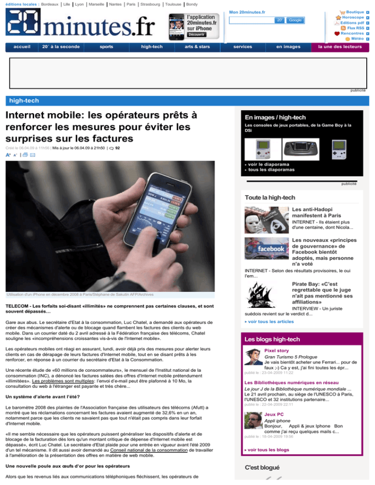 éditions locales : Bordeaux Lille Lyon Marseille Nantes Paris Strasbourg Toulouse Bondy Mon 20minutes.fr 20' accueil 20´ à la seconde sports high-tech arts & stars services Google en images Boutique Horoscope Editions pdf Flux RSS Rencontres Météo la une des lecteurs publicité high-tech Internet mobile: les opérateurs prêts à renforcer les mesures pour éviter les surprises sur les factures Créé le 06.04.09 à 11h56 | Mis à jour le 06.04.09 à 21h50 | En images / high-tech Les consoles de jeux portables, de la Game Boy à la DSi 92 | voir le diaporama tous les diaporamas publicité Toute la high-tech Les anti-Hadopi manifestent à Paris INTERNET - Ils étaient plus d'une centaine, dont Nicola... Les nouveaux «principes de gouvernance» de Facebook bientôt adoptés, mais personne n'a voté INTERNET - Selon des résultats provisoires, le oui l'em... Pirate Bay: «C'est regrettable que le juge n'ait pas mentionné ses affiliations» Utilisation d'un iPhone en décembre 2008 à Paris/Stéphane de Sakutin AFP/Archives TELECOM - Les forfaits soi-disant «illimités» ne comprennent pas certaines clauses, et sont souvent dépassés… Gare aux abus. Le secrétaire d'Etat à la consommation, Luc Chatel, a demandé aux opérateurs de créer des mécanismes d'alerte ou de blocage quand flambent les factures des clients du web mobile. Dans un courrier daté du 2 avril adressé à la Fédération française des télécoms, Chatel souligne les «incompréhensions croissantes vis-à-vis de l'Internet mobile». Les opérateurs mobiles ont réagi en assurant, lundi, avoir déjà pris des mesures pour alerter leurs clients en cas de dérapage de leurs factures d'Internet mobile, tout en se disant prêts à les renforcer, en réponse à un courrier du secrétaire d'Etat à la Consommation. Une récente étude de «60 millions de consommateurs», le mensuel de l'Institut national de la consommation (INC), a dénoncé les factures salées des offres d'Internet mobile prétendument «illimitées». Les problèmes sont multiples: l’envoi d’e-mail peut être plafonné à 10 Mo, la consultation du web à l'étranger est payante et très chère... Un système d’alerte avant l’été? Le baromètre 2008 des plaintes de l'Association française des utilisateurs des télécoms (Afutt) a montré que les réclamations concernant les factures avaient augmenté de 32,6% en un an, notamment parce que les clients ne savaient pas que tout n'était pas compris dans leur forfait d'Internet mobile. «Il me semble nécessaire que les opérateurs puissent généraliser les dispositifs d'alerte et de blocage de la facturation dès lors qu'un montant critique de dépense d'Internet mobile est dépassé», écrit Luc Chatel. Le secrétaire d'Etat plaide pour une entrée en vigueur avant l'été 2009 d'un tel mécanisme. Il dit aussi avoir demandé au Conseil national de la consommation de travailler à l'amélioration de la présentation des offres en matière de web mobile. Une nouvelle poule aux œufs d’or pour les opérateurs Alors que les revenus liés aux communications téléphoniques fléchissent, les opérateurs de télécom voient arriver avec bénédiction la généralisation de l’Internet mobile. Boostée par les ventes INTERVIEW - Un juriste suédois revient sur le verdict d... voir tous les articles Les blogs high-tech Pixel story Gran Turismo 5 Prologue Je vais bientôt acheter une Ferrari... pour de faux ;-) Ca y est, j'ai fini toutes les épr... publié le : 23-04-2009 11:22 Les Bibliothèques numériques en réseau Le jour J de la Bibliothèque numérique mondiale ... Le 21 avril prochain, au siège de l'UNESCO à Paris, l'UNESCO et 32 institutions partenaire... publié le : 22-04-2009 22:11 Jeux PC Appli iphone Bonjour, Appli & jeux Iphone Bon comme j'ai reçu quelques mails c... publié le : 18-04-2009 19:56 voir tous les blogs C'est blogué télécom voient arriver avec bénédiction la généralisation de l’Internet mobile. Boostée par les ventes de l’iPhone (plus de 800.000 en France), la navigation web sur téléphone portable s’annonce comme la nouvelle poule aux oeufs d’or pour Orange, SFR et Bouygues. 7 millions de Français ont consulté l'Internet sur leur téléphone (souvent un smartphone) l'an dernier. Ils devraient être 18 millions en 2012, selon l'Idate (Institut de l'audiovisuel et des télécoms en Europe). Rap geek Vous interviewez Avez-vous déjà eu des problèmes de facturation avec votre Internet mobile? La tarification est-elle assez claire? VOS QUESTIONS - Il vous a répondu sur le lancement de son nouveau site... 20minutes.fr Article précédent : Les LED, beauté intérieure des TV... Vous avez interviewé Dominique Farrugia Article suivant : Grande-Bretagne: altercation entre ... posez vos questions publicité publicité Les articles les plus commentés Partagez Recommandez cet article | Envoyez à un ami | Envoyez sur Vos réactions l Nicolas Sarkozy réélu? l Rachida Dati confuse et hilare: c'était «une parodie» l Zapatero estime qu'«il n'y aucun problème» avec Sarkozy l Une nouvelle proposition de loi sur le travail dominical lire tous les commentaires Si vous êtes inscrit, connectez-vous Réagissez à cet article Les articles recommandés Votre commentaire : Votre e-mail : l Macha Béranger est morte l Nicolas Sarkozy réélu? l Le meeting de Dati chez les jeunes UMP tourne au sketch l Crise: un député UMP veut réduire l'indemnité des élus et des ministres En ce moment à la Une Votre pseudo : lire les conditions d'utilisation Police et violence: un nouveau rapport qui fait mal Gerets vers l'Arabie saoudite? Mardi, c'est manif' chez les médecins et les universitaires Envoyez Vous n'êtes pas identifié(e) : votre commentaire apparaitra après modération Boutique Sony KDL-40W4500 De 990 € à 1607 € Nintendo Wii De 150 € à 352 € Comparer les prix Comparer les prix voir la boutique voir tous les articles publicité Votre progr