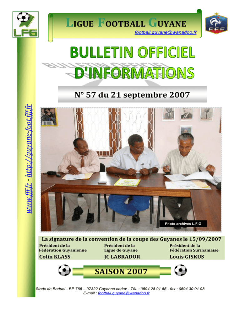 LIGUE FOOTBALL GUYANE [email protected] www.fff.fr - http://guyane-foot.fff.fr N° 57 du 21 septembre 2007 Photo archives L.F.G La signature de la convention de la coupe des Guyanes le 15/09/2007 Président de la Fédération Guyanienne Président de la Ligue de Guyane Président de la Fédération Surinamaise Colin KLASS JC LABRADOR Louis GISKUS SAISON 2007 Stade de Baduel - BP 765 – 97322 Cayenne cedex - Tél. : 0594 28 91 55 - fax : 0594 30 91 98 E-mail : [email protected] 0 SOMMAIRE Plannings des formations 2007/2008 .................................................... 3 Brevet d’État d’Éducateur Sportif - 1er degré ...................................................... 3 Recyclage .......................................................................................................... 3 Commission Régionale des Arbitres...................................................... 4 Enregistrement du courrier ................................................................................. 4 Coupe de France zone Guyane ......................................................................... 4 Désignations des officiels ........................................................................................... 4 Test de cooper ................................................................................................... 5 Informations diverses ......................................................................................... 5 Tours d’horizon sur les matchs de la coupe de L’UNAF ..................................... 5 Défraiement des arbitres .................................................................................... 5 Commission Régionale d’Homologation des Mutations et Licences ..... 6 Enregistrement du courrier ................................................................................. 6 Avis de démission .............................................................................................. 9 Acceptés ................................................................................................................... 10 Demande de licences....................................................................................... 10 Joueur nouveau (A) .................................................................................................. 10 Dirigeants (D)............................................................................................................ 12 Joueurs mutés (M) .................................................................................................... 12 Anomalies licences ................................................................................................... 12 Rencontre du weekend........................................................................ 14 Championnat de division d’honneur ................................................................. 14 Championnat de promotion d’honneur ............................................................. 14 Informations et notes aux clubs ........................................................... 15 Dérogations et demandes diverses .................................................................. 15 Conventions saison 2007 - 2008 ...................................................................... 16 Coupe des Guyanes......................................................................................... 18 Mise en place du coupon sport......................................................................... 19 Information ....................................................................................................... 20 1 Bulletin Officiel d’Information n° 57 du 21/09/2007 Liens utiles ........................................................................................... 21 Coordonnées de la Fédération et des Ligues...................................... 22 FEDERATION FRANCAISE DE FOOTBALL ....................................... 22 LIGUE DE FOOTBALL DE LA GUYANE.............................................. 22 LIGUE DE FOOTBALL DE LA MARTINIQUE ...................................... 22 2 Bulletin Officiel d’Information n° 57 du 21/09/2007 PLANNINGS DES FORMATIONS 2007/2008 Prière de vous rapprocher le plus rapidement possible auprès de la Ligue de Football pour les inscriptions. BREVET d’ÉTAT d’ÉDUCATEUR SPORTIF - 1er degré CYCLE II Inscription du 15 au 31 octobre 2007 Test de sélection du 4 au 5 décembre 2007 Réunion d’information avec tuteurs 18 janvier 2008 Ligue de Football de la Guyane à 19h00 UF4 à UF9 Semaine n°1 du 28 janvier 2008 Semaine n°2 du 19 mai au 23 mai 2008 Semaine n°3 du 10 mars au 14 mars 2008 du 02 juin au 30 juin 2008 UF5 – UF7 – UF8 a et b : CYCLE III du 1er septembre 2007 au 30 juin 2008 Stage en situation pédagogie en club RECYCLAGE Responsables des écoles de Football Iles de Cayenne. Samedi 29 septembre 2007 à la Ligue de Football à partir de 09H00 Responsables des écoles de Football Centre et Ouest. Samedi 06 octobre 2007 à Sinnamary Brevet d’État 1er degré Samedi 10 novembre et dimanche 11 novembre 2007, au stade de Baduel 3 Bulletin Officiel d’Information n° 57 du 21/09/2007 COMMISSION RÉGIONALE DES ARBITRES RÉUNION DU LUNDI 17 SEPTEMBRE 2007 DEBUT DE LA REUNION : 18:45 HEURES M EM B R ES PR ÉSE N T S FAUBERT G – POMPONNE B – VICTORIN TH – LINDOR.J-P – VICTORIN.TH CAYOL.A M EM B R ES C R A EX C U SES MADLON.A - BALMOKOUN -G. – JEAN - FRANCOIS A - MONTGENIE.R ARBITRES PRÉSENT DUJON – LETARD.F - PRÉVOT – GIOVINAZZO – EUGÉNIO –MADELEINE – JUBENOT– GARZON –GUSTAVE– NEMOUTHE ARBITRES EXCUSE DIBANDI ENREGISTREMENT DU COURRIER • Bulletin officiel d’information n°56 du 14 septemb re 2007 • Lettre de l’AS ST ELIE en date du 10/09/07 • Bordereau demande de licence LEOPOLDIE - EUGENIO – LETARD - ADELAIDE – JUBENOT - DURO - CEPRIKA - CUSSET - PREVOT • Feuille d’engagement ADELAIDE - LETARD - JUBENOT - DUR