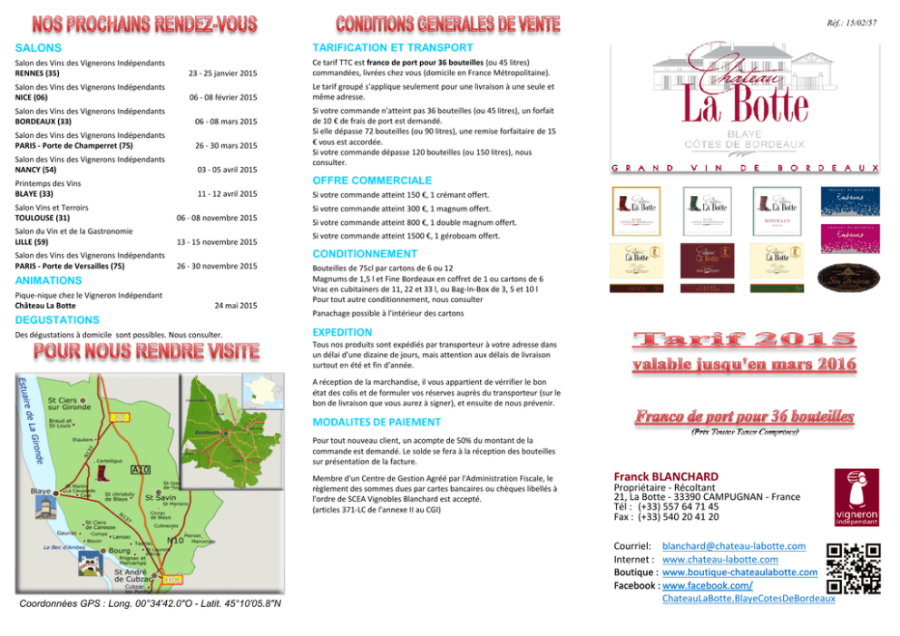 Réf.: 15/02/57 TARIFICATION ET TRANSPORT SALONS Salon des Vins des Vignerons Indépendants RENNES (35) 23 - 25 janvier 2015 Ce tarif TTC est franco de port pour 36 bouteilles (ou 45 litres) commandées, livrées chez vous (domicile en France Métropolitaine). Salon des Vins des Vignerons Indépendants NICE (06) 06 - 08 février 2015 Le tarif groupé s'applique seulement pour une livraison à une seule et même adresse. Salon des Vins des Vignerons Indépendants BORDEAUX (33) 06 - 08 mars 2015 Salon des Vins des Vignerons Indépendants PARIS - Porte de Champerret (75) 26 - 30 mars 2015 Salon des Vins des Vignerons Indépendants NANCY (54) 03 - 05 avril 2015 Printemps des Vins BLAYE (33) 11 - 12 avril 2015 OFFRE COMMERCIALE Salon Vins et Terroirs TOULOUSE (31) 06 - 08 novembre 2015 Salon du Vin et de la Gastronomie LILLE (59) 13 - 15 novembre 2015 Salon des Vins des Vignerons Indépendants PARIS - Porte de Versailles (75) 26 - 30 novembre 2015 Si votre commande atteint 150 €, 1 crémant offert. Si votre commande atteint 300 €, 1 magnum offert. Si votre commande atteint 800 €, 1 double magnum offert. Si votre commande atteint 1500 €, 1 géroboam offert. CONDITIONNEMENT ANIMATIONS Pique-nique chez le Vigneron Indépendant Château La Botte Si votre commande n'atteint pas 36 bouteilles (ou 45 litres), un forfait de 10 € de frais de port est demandé. Si elle dépasse 72 bouteilles (ou 90 litres), une remise forfaitaire de 15 € vous est accordée. Si votre commande dépasse 120 bouteilles (ou 150 litres), nous consulter. 24 mai 2015 DEGUSTATIONS Des dégustations à domicile sont possibles. Nous consulter. Bouteilles de 75cl par cartons de 6 ou 12 Magnums de 1,5 l et Fine Bordeaux en coffret de 1 ou cartons de 6 Vrac en cubitainers de 11, 22 et 33 l, ou Bag-In-Box de 3, 5 et 10 l Pour tout autre conditionnement, nous consulter Panachage possible à l'intérieur des cartons EXPEDITION Tous nos produits sont expédiés par transporteur à votre adresse dans un délai d'une dizaine de jours, mais attention aux délais de livraison surtout en été et fin d'année. A réception de la marchandise, il vous appartient de vérrifier le bon état des colis et de formuler vos réserves auprès du transporteur (sur le bon de livraison que vous aurez à signer), et ensuite de nous prévenir. MODALITES DE PAIEMENT Pour tout nouveau client, un acompte de 50% du montant de la commande est demandé. Le solde se fera à la réception des bouteilles sur présentation de la facture. Membre d'un Centre de Gestion Agréé par l'Administration Fiscale, le règlement des sommes dues par cartes bancaires ou chèques libellés à l'ordre de SCEA Vignobles Blanchard est accepté. (articles 371-LC de l'annexe II au CGI) Coordonnées GPS : Long. 00°34'42.0"O - Latit. 45°10'05.8"N (Prix Toutes Taxes Comprises) Franck BLANCHARD Propriétaire - Récoltant 21, La Botte - 33390 CAMPUGNAN - France Tél : (+33) 557 64 71 45 Fax : (+33) 540 20 41 20 Courriel: [email protected] Internet : www.chateau-labotte.com Boutique : www.boutique-chateaulabotte.com Facebook : www.facebook.com/ ChateauLaBotte.BlayeCotesDeBordeaux Blanc Prestige Rouge Etonnez-vous avec cette Cuvée Prestige vinifiée et élevée pendant 4 mois en barriques de chêne neuves. Appréciez sa rondeur en bouche, ses arômes de fruits exotiques agrémentés d'une légère sucrosité. Il accompagnera agréablement vos poissons en sauce, le foie gras; ou dégustez-le en apéritif. A boire dans les 5 ans. Vous recherchez un vin de tous les jours, alors cette Cuvée Tradition vous comblera. Ce vin est assemblé à partir de tous les cépages rouges présents sur la propriété (merlot, cabernet sauvignon, cabernet franc). Vin souple aux arômes de fruits rouges avec suivant les années une pointe de réglisse. A boire dans les 3 ans. 2012 2012 bouteille 75cl bouteille 75cl 5.50 € 7.00 € Crémant de Bordeaux Embruns de l'Estuaire Aucune hésitation pour ces crémants brut désaltérants aux fines bulles et à l'équilibre entre le fruité et l'acidité. Le Blanc avec son assemblage de Sémillon et de Sauvignon propose un arôme délicat. Le Rosé à base de Cabernet Franc sera tout en rondeur. Idéal en apéritif, nature ou accompagné d'une liqueur (cassis/pêche pour le classique, violette/poire pour l'originalité, armagnac pour le terroir). Conservez-le pendant 3-4 ans. Blanc sec Ce vin à majorité Sauvignon possède un bouquet fleuri aux notes d'agrumes ou de pêche. Son amplitude en bouche grâce à un élevage sur lies accompagnera aussi bien les fruits de mer que les poissons grillés. A boire maintenant. bouteille 75cl 3.00 € 5.50 € 2012 7.50 € magnum 150cl 16.00 € double mag 300cl 37.00 € jéroboam 500cl 58.50 € 3.75 € 7.00 € 15.00 € 35.00 € 55.00 € bouteille 75cl Rosé Ce vin issu de saignée de merlot et de pressée de Cabernet Franc présente une robe de couleur vive, du fruité et une bouche fraîche. Tombez sous son charme pour accompagner vos grillades et salades en été comme en hiver. A boire maintenant. 8.00 € bouteille 75cl 3L Hors d'Age bouteille 70cl Rouge Réserve - Cuvée Alexandre 5.50 € Découvrez notre Cuvée Réserve, à dominante de Cabernet Sauvignon et élevée pendant 12 mois en barriques de chêne neuves. Ce vin a une ampleur arômatique importante, orientée vers les fruits confits, le pruneau, légèrement toasté. Dégustez-le avec une cuisine goûteuse (plats en sauce, gibiers, sucré/salé, fromages affinés, …). Conservez-le pendant 8-10 ans. 5L 10 L 12.40 € 19.60 € 37.90 € 11 L 22 L 33 L 42.75 € Emerveillez-vous avec cette eau-de-vie élaborée grâce à une double distillation et un vieillissement en fûts de chêne depuis plus de 25 ans. Son parfum et sa douceur vont vous réconcilier avec les alcools. 36.00 € Distinctions et Médailles : 2013/2014 Cubitainers 8.00 € Fine Bordeaux 2011 1/2 btle 37.5cl Outres à Vin Rosé Laissez-vous tenter par cette Cuvée Prestige, à