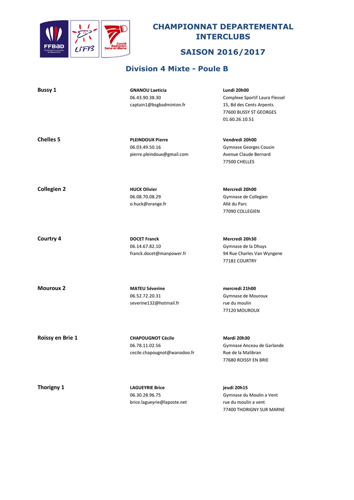 CHAMPIONNAT DEPARTEMENTAL INTERCLUBS SAISON 2016/2017 Division 4 Mixte - Poule B Bussy 1 GNANOU Laeticia 06.43.90.38.30 [email protected] Lundi 20h00 Complexe Sportif Laura Flessel 15, Bd des Cents Arpents 77600 BUSSY ST GEORGES 01.60.26.10.51 Chelles 5 PLEINDOUX Pierre 06.03.49.50.16 [email protected] Vendredi 20h00 Gymnase Georges Cousin Avenue Claude Bernard 77500 CHELLES Collegien 2 HUCK Olivier 06.08.70.08.29 [email protected] Mercredi 20h00 Gymnase de Collegien Allé du Parc 77090 COLLEGIEN Courtry 4 DOCET Franck 06.14.67.82.10 [email protected] Mercredi 20h30 Gymnase de la Dhuys 94 Rue Charles Van Wyngene 77181 COURTRY Mouroux 2 MATEU Séverine 06.52.72.20.31 [email protected] mercredi 21h00 Gymnase de Mouroux rue du moulin 77120 MOUROUX Roissy en Brie 1 CHAPOUGNOT Cécile 06.78.11.02.56 [email protected] Mardi 20h30 Gymnase Anceau de Garlande Rue de la Malibran 77680 ROISSY EN BRIE Thorigny 1 LAGUEYRIE Brice 06.30.28.96.75 [email protected] jeudi 20h15 Gymnase du Moulin a Vent rue du moulin a vent 77400 THORIGNY SUR MARNE