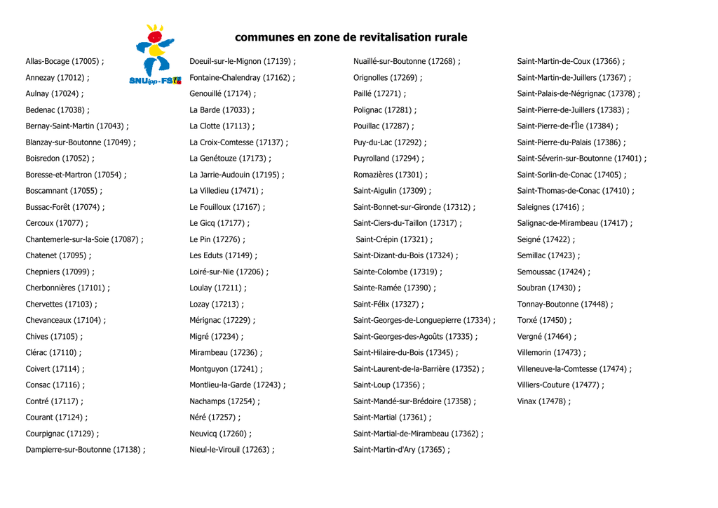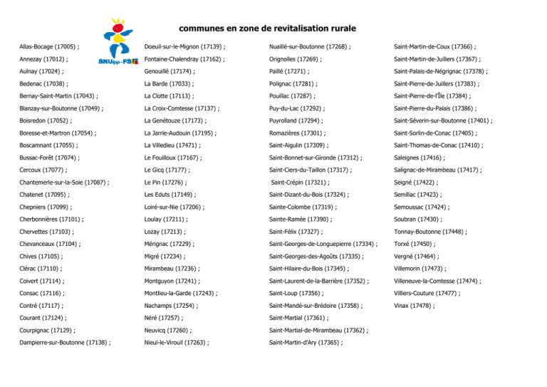 communes en zone de revitalisation rurale Allas-Bocage (17005) ; Doeuil-sur-le-Mignon (17139) ; Nuaillé-sur-Boutonne (17268) ; Saint-Martin-de-Coux (17366) ; Annezay (17012) ; Fontaine-Chalendray (17162) ; Orignolles (17269) ; Saint-Martin-de-Juillers (17367) ; Aulnay (17024) ; Genouillé (17174) ; Paillé (17271) ; Saint-Palais-de-Négrignac (17378) ; Bedenac (17038) ; La Barde (17033) ; Polignac (17281) ; Saint-Pierre-de-Juillers (17383) ; Bernay-Saint-Martin (17043) ; La Clotte (17113) ; Pouillac (17287) ; Saint-Pierre-de-l'Île (17384) ; Blanzay-sur-Boutonne (17049) ; La Croix-Comtesse (17137) ; Puy-du-Lac (17292) ; Saint-Pierre-du-Palais (17386) ; Boisredon (17052) ; La Genétouze (17173) ; Puyrolland (17294) ; Saint-Séverin-sur-Boutonne (17401) ; Boresse-et-Martron (17054) ; La Jarrie-Audouin (17195) ; Romazières (17301) ; Saint-Sorlin-de-Conac (17405) ; Boscamnant (17055) ; La Villedieu (17471) ; Saint-Aigulin (17309) ; Saint-Thomas-de-Conac (17410) ; Bussac-Forêt (17074) ; Le Fouilloux (17167) ; Saint-Bonnet-sur-Gironde (17312) ; Saleignes (17416) ; Cercoux (17077) ; Le Gicq (17177) ; Saint-Ciers-du-Taillon (17317) ; Salignac-de-Mirambeau (17417) ; Chantemerle-sur-la-Soie (17087) ; Le Pin (17276) ; Chatenet (17095) ; Les Eduts (17149) ; Saint-Dizant-du-Bois (17324) ; Semillac (17423) ; Chepniers (17099) ; Loiré-sur-Nie (17206) ; Sainte-Colombe (17319) ; Semoussac (17424) ; Cherbonnières (17101) ; Loulay (17211) ; Sainte-Ramée (17390) ; Soubran (17430) ; Chervettes (17103) ; Lozay (17213) ; Saint-Félix (17327) ; Tonnay-Boutonne (17448) ; Chevanceaux (17104) ; Mérignac (17229) ; Saint-Georges-de-Longuepierre (17334) ; Torxé (17450) ; Chives (17105) ; Migré (17234) ; Saint-Georges-des-Agoûts (17335) ; Vergné (17464) ; Clérac (17110) ; Mirambeau (17236) ; Saint-Hilaire-du-Bois (17345) ; Villemorin (17473) ; Coivert (17114) ; Montguyon (17241) ; Saint-Laurent-de-la-Barrière (17352) ; Villeneuve-la-Comtesse (17474) ; Consac (17116) ; Montlieu-la-Garde (17243) ; Saint-Loup (17356) ; Villiers-Couture (17477) ; Contré (17117) ; Nachamps (17254) ; Saint-Mandé-sur-Brédoire (17358) ; Vinax (17478) ; Courant (17124) ; Néré (17257) ; Saint-Martial (17361) ; Courpignac (17129) ; Neuvicq (17260) ; Saint-Martial-de-Mirambeau (17362) ; Dampierre-sur-Boutonne (17138) ; Nieul-le-Virouil (17263) ; Saint-Martin-d'Ary (17365) ; Saint-Crépin (17321) ; Seigné (17422) ;