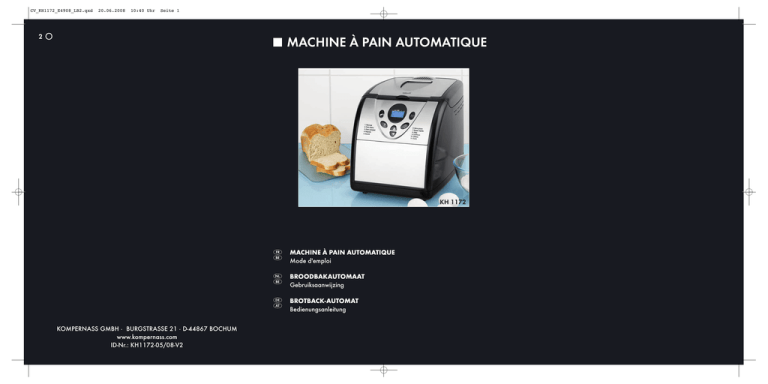 CV_KH1172_E4908_LB2.qxd 20.06.2008 10:40 Uhr Seite 1 2 MACHINE À PAIN AUTOMATIQUE KH 1172 MACHINE À PAIN AUTOMATIQUE Mode d'emploi BROODBAKAUTOMAAT Gebruiksaanwijzing BROTBACK-AUTOMAT Bedienungsanleitung KOMPERNASS GMBH · BURGSTRASSE 21 · D-44867 BOCHUM www.kompernass.com ID-Nr.: KH1172-05/08-V2 CV_KH1172_E4908_LB2.qxd 20.06.2008 10:40 Uhr Seite 4 KH 1172 q w e r t y u a i o s d f g IB_KH1172_E4980_LB2 20.06.2008 11:44 Uhr Seite 1 SOMMAIRE PAGE Consignes de sécurité 2 Présentation de l'appareil 3 Accessoires fournis 4 Usage conforme 4 Caractéristiques techniques 4 Propriétés 4 Avant la première utilisation 4 Avant la cuisson 5 Champ de commande 5 Fonctions de la machine à pain 7 Messages d'erreur 8 Faire cuire du pain 8 Ajouter les ingrédients . . . . . . . . . . . . . . . . . . . . . . . . . . . . . . . . . . . . . . . . . . . . . . . . . . . . . . . .8 Mise en place de la forme de cuisson . . . . . . . . . . . . . . . . . . . . . . . . . . . . . . . . . . . . . . . . . . .8 Mise en marche . . . . . . . . . . . . . . . . . . . . . . . . . . . . . . . . . . . . . . . . . . . . . . . . . . . . . . . . . . . . .8 Temporisateur/Fonction de minuterie . . . . . . . . . . . . . . . . . . . . . . . . . . . . . . . . . . . . . . . . . . . .8 Mélanger et pétrir la pâte . . . . . . . . . . . . . . . . . . . . . . . . . . . . . . . . . . . . . . . . . . . . . . . . . . . . .9 Laisser monter la pâte . . . . . . . . . . . . . . . . . . . . . . . . . . . . . . . . . . . . . . . . . . . . . . . . . . . . . . . .9 Cuisson . . . . . . . . . . . . . . . . . . . . . . . . . . . . . . . . . . . . . . . . . . . . . . . . . . . . . . . . . . . . . . . . . . .9 Maintien au chaud . . . . . . . . . . . . . . . . . . . . . . . . . . . . . . . . . . . . . . . . . . . . . . . . . . . . . . . . .10 Fin du programme . . . . . . . . . . . . . . . . . . . . . . . . . . . . . . . . . . . . . . . . . . . . . . . . . . . . . . . . . .10 Nettoyage et entretien 11 Mise au rebut 11 Garantie et service après-vente 12 Importateur 12 Déroulement des programmes 13 Dépannage de la machine à pain 15 Conservez ce mode d'emploi pour toutes questions ultérieures – et remettez-le également en même temps que l'appareil si vous le confiez à une autre personne. -1- IB_KH1172_E4980_LB2 20.06.2008 11:44 Uhr Seite 2 MACHINE À PAIN AUTOMATIQUE KH 1172 • Ne commencez un programme de cuisson qu'après avoir introduit une forme de cuisson. • Ne posez pas d'objets sur l'appareil et ne le recouvrez pas. Risque d'incendie ! • Ne mettez jamais de papier d'aluminium ou d'autres objets métalliques dans la machine à pain. Ceci peut entraîner un court-circuit. Risque d'incendie ! • Ne jamais utiliser l'appareil sans forme de cuisson ou avec une forme de cuisson vide. Consignes de sécurité • Lisez intégralement le mode d'emploi avant la première utilisation. • Danger d'asphyxie ! Les enfants peuvent étouffer en cas d'utilisation inappropriée de l'emballage. Mettez-le au rebut immédiatement après le déballage ou conservez-le hors de portée des enfants. • Suite au déballage, contrôlez la machine à pain en vue d'éventuels dommages de transport. Adressez-vous éventuellement à votre fournisseur. • Posez l'appareil sur une surface sèche, plane et non sensible à la chaleur. • N'installez pas l'appareil à proximité de becs de gaz, de cuisinières électriques ou d'autres sources de chaleur. • N'installez pas l'appareil à proximité de matériaux combustibles, explosifs et/ou de gaz combustibles. La distance par rapport aux autres appareils ne doit pas être inférieure de 10 cm. • N'utilisez pas la machine à pain pour conserver des aliments ou des ustensiles. • Ne pas utiliser de minuterie externe ou de dispositif de commande à distance pour faire fonctionner l'appareil. Danger d'électrocution ! • Contrôlez le cordon d'alimentation et la fiche avant toute utilisation. Si le cordon d'alimentation de cet appareil est endommagé, il doit impérativement être remplacé par le fabricant, son service après-vente ou une personne de qualification similaire afin d'éviter d'autres risques. • N'acheminez pas le câble au niveau d'arêtes vives ou à proximité de surfaces ou d'objets chauds. L'isolement du câble peut être endommagé. • Faites immédiatement remplacer la fiche secteur ou le cordon d'alimentation endommagé par un technicien spécialisé ou par le service clientèle afin d'éviter tout danger. • Si vous utilisez une rallonge, la puissance maximum autorisée du câble doit correspondre à la puissance de la machine à pain. • Lorsque l'appareil n'est pas utilisé et avant tout nettoyage, retirez la fiche secteur. • Laissez l'appareil refroidir et débranchez la fiche secteur avant de retirer ou de mettre en place les pièces accessoires. • Ne nettoyez pas l'appareil avec des éponges récurantes. Si des particules de l'éponge se désagrègent et entrent en contact avec des pièces électriques, il y a risque d'électrocution. Risque d'incendie. • Assurez-vous que les fentes d'aération de l'appareil ne sont pas recouvertes. • Avant le raccordement, contrôlez si le type de courant et la tension du réseau correspondent aux indications figurant sur la plaque signalétique. • Ne recouvrez jamais l'appareil avec une serviette ou tout autre matériau. La chaleur et la vapeur doivent pouvoir s'échapper. Un incendie peut se déclarer si l'appareil est recouvert d'un matériau inflammable tel que des rideaux ou qu'il entre en contact avec. Ne plongez pas la machine à pain dans de l'eau ou dans d'autres liquides. Danger d'électrocution ! -2- IB_KH1172_E4980_LB2 20.06.2008 11:44 Uhr Seite 3 Prudence! Dommages sur l'appareil ! • Ne déplacez pas la machine à pain si la forme de cuisson contient quelque chose de brûlant ou un liquide tel que de la confiture. Risque de brûlure ! • Lors de l'utilisation, évitez à tout prix de toucher les pétrins en rotat