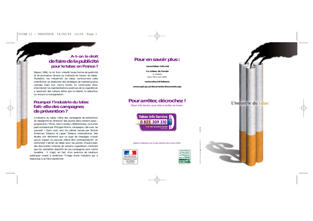 FICHE 11 - INDUSTRIE 14/06/04 14:05 Page 1 Pour en savoir plus : pour le tabac en France ? www.tabac-info.net Depuis 1991, la loi Evin interdit toute forme de publicité et de promotion directe ou indirecte en faveur du tabac. Toutefois, les industriels du tabac contournent cette interdiction en élaborant des stratégies de marketing plus cachées mais non moins fortes. Ils continuent donc d’alimenter les représentations positives de la cigarette en y associant des valeurs telles que la liberté, la séduction ou encore la transgression. Le rideau de fumée fait-elle des campagnes de prévention ? L’industrie du tabac mène des campagnes de prévention du tabagisme en direction des jeunes dans certains pays : programme « Think. Don’t smoke » (Réfléchissez, ne fumez pas) orchestré par Philippe Morris, campagne « Be cool, be yourself » (Sois cool, sois toi-même) lancée par British American Tobacco et Japan Tobacco International. Des études ont démontré que ce type de messages n’avait aucun impact ou pouvait même être contreproductif, en renforçant l’attrait du tabac pour les jeunes. D’autre part, des documents internes de certains cigarettiers montrent que les véritables objectifs de ces campagnes sont moins louables : il s’agit, en fait, d’un exercice de relations publiques visant à améliorer l’image d’une industrie qui a beaucoup à se faire pardonner. www.who.int/tobacco www.cqct.qc.ca/documents/documents.asp Pour arrêter, décrochez ! Tabac Info Service vous aide à arrêter de fumer. 01-03776-DE Pourquoi l’industrie du tabac G. Dubois Seuil, Paris, avril 2003 Réalisé en collaboration avec la Ligue nationale contre le cancer (LNCC) Artwork Raphaël Thierry de faire de la publicité Illustration & Conception graphique A-t-on le droit FICHE 11 - INDUSTRIE 14/06/04 14:05 Page 2 Quels sont les principaux fabricants de tabac ? L’industrie du tabac regroupe des compagnies internationales qui sont parmi les plus puissantes du monde. Six principaux fabricants de tabac se partagent 99 % du marché des cigarettes: • Altadis (Gauloises, News, Royale, Gitanes, Fortuna). Altadis est un groupe franco-espagnol issu de la fusion de la Seita avec Tabacalera. • Gallaher (Benson&Hedges). • Philip Morris, nouvellement renommé Altria (Marlboro, Philip Morris, Chesterfield, L&M). • British American Tobacco (Winfield, Peter Stuyvesant, Lucky Strike). Quel est le chiffre d’affaires de l'industrie du tabac ? En 2002, 80 milliards de cigarettes ont été vendues en France, ce qui représente un chiffre d’affaires de 13 milliards d’euros. Quels sont les liens entre l'industrie du tabac et l'Etat français ? L’Etat français a longtemps siégé au conseil d’administration de la Seita, qui détenait le monopole national de fabrication et de distribution des produits du tabac. La Seita a été privatisée en 1995 et l’Etat a cédé sa participation au capital de la société en octobre 2000. • Japan Tobacco International (Camel, Winston). • Imperial Tobacco (JPS, Route 66). Comment la distribution des cigarettes est-elle organisée ? Altadis détient un quasi-monopole de la distribution des produits du tabac ainsi que la quasi-totalité de la distribution des cigarettes en France. La vente au détail est confiée à l'administration des Douanes et Droits indirects, qui dépend du ministère des Finances. Elle est chargée de l'implantation et de la gestion d’un réseau de 33 600 buralistes. Que reproche-t-on à l’industrie du tabac ? Des procès lancés aux Etats-Unis contre des fabricants de tabac dans les années 1990 ont permis de découvrir des millions de documents internes et confidentiels révélant les comportements délinquants de l’industrie du tabac. Ces documents ont dévoilé les stratégies des industriels du tabac pour contrer les politiques de santé publique. Ils ont en effet délibérément caché qu'ils savaient depuis les années 1960 que la cigarette était nocive, que la nicotine engendrait une dépendance physique importante et qu’ils jouaient sur la teneur en nicotine des cigarettes pour en augmenter les effets. Est-il vrai que l'industrie du tabac organise la contrebande de cigarettes ? Il est désormais clairement établi que les industriels du tabac ont facilité plus ou moins directement la contrebande de cigarettes dans de nombreux pays. Cette contrebande va à l’encontre des efforts de santé publique et prive les Etats de revenus fiscaux. Des actions en justice contre la plupart des cigarettiers ont été lancées, notamment par l’Union européenne. Est-il vrai que l'industrie aurait "acheté" des acteurs de cinéma, des chercheurs, des hommes politiques ? D’après les documents internes de l’industrie, on sait que certains cigarettiers ont payé des acteurs pour fumer dans les films où ils jouaient. Par exemple, Sylvester Stallone a accepté d’être payé par Brown et Williamson pour fumer dans des films comme Rambo et Rocky IV. Dans une lettre du 28 avril 1983 signée de sa main, on peut lire : " Comme convenu, je garantis que j'utiliserai les produits du tabac de Brown et Williamson dans au moins cinq de mes films. J'ai bien compris que Brown et Williamson me versera un droit de 500 000 dollars. " On sait également qu’ils ont mis en œuvre des stratégies pour saper l’action de l’Organisation mondiale de la santé : paiement d’experts, organisation de campagnes de communication pour semer le doute dans la communauté scientifique, modification de résultats d’études, etc. Enfin, dans certains pays (Allemagne, Etats-Unis, etc.), des partis politiques sont financés par l’industrie du tabac, pratique qui influe directement ou indirectement sur les stratégies nationales et internationales de prévention du tabagisme. « La nicotine est toxicomanogène. Ce que nous faisons donc, c'est vendre de la nicotine, une drogue toxicomanogène. » (Addison Yeaman de la société Brown et Wil