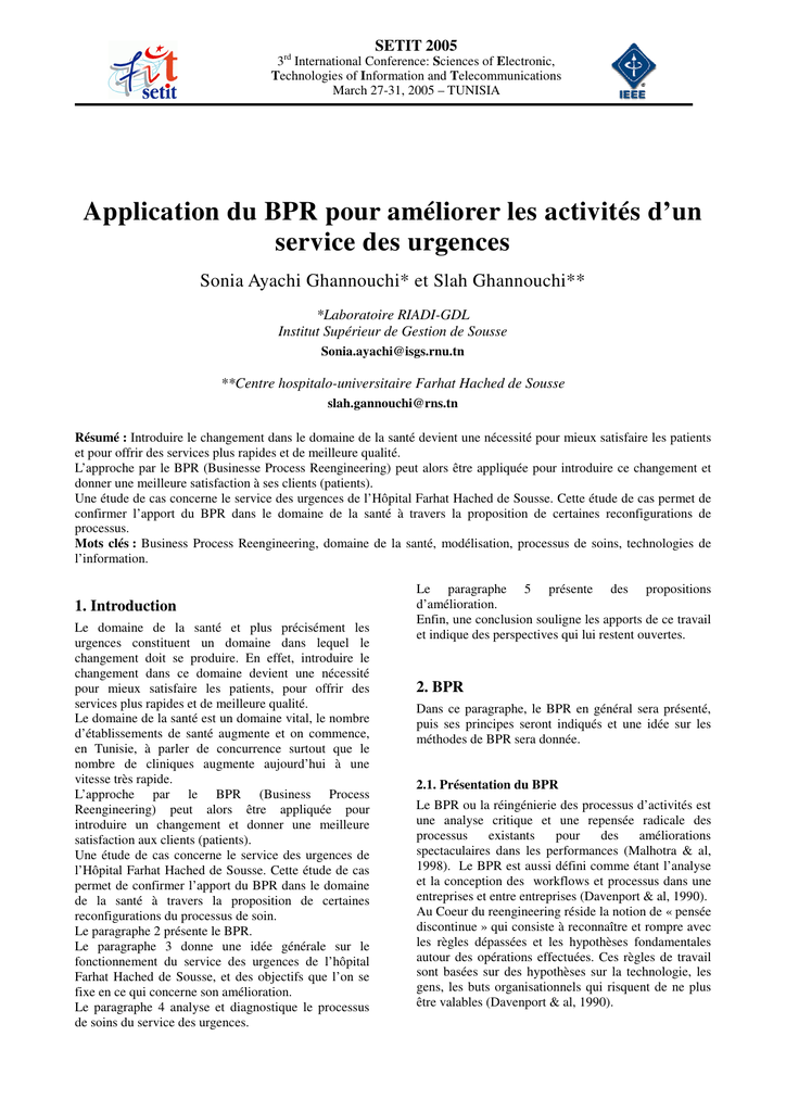 SETIT 2005 3rd International Conference: Sciences of Electronic, Technologies of Information and Telecommunications March 27-31, 2005 – TUNISIA Application du BPR pour améliorer les activités d’un service des urgences Sonia Ayachi Ghannouchi* et Slah Ghannouchi** *Laboratoire RIADI-GDL Institut Supérieur de Gestion de Sousse [email protected] **Centre hospitalo-universitaire Farhat Hached de Sousse [email protected] Résumé : Introduire le changement dans le domaine de la santé devient une nécessité pour mieux satisfaire les patients et pour offrir des services plus rapides et de meilleure qualité. L’approche par le BPR (Businesse Process Reengineering) peut alors être appliquée pour introduire ce changement et donner une meilleure satisfaction à ses clients (patients). Une étude de cas concerne le service des urgences de l’Hôpital Farhat Hached de Sousse. Cette étude de cas permet de confirmer l’apport du BPR dans le domaine de la santé à travers la proposition de certaines reconfigurations de processus. Mots clés : Business Process Reengineering, domaine de la santé, modélisation, processus de soins, technologies de l’information. 1. Introduction Le domaine de la santé et plus précisément les urgences constituent un domaine dans lequel le changement doit se produire. En effet, introduire le changement dans ce domaine devient une nécessité pour mieux satisfaire les patients, pour offrir des services plus rapides et de meilleure qualité. Le domaine de la santé est un domaine vital, le nombre d’établissements de santé augmente et on commence, en Tunisie, à parler de concurrence surtout que le nombre de cliniques augmente aujourd’hui à une vitesse très rapide. L’approche par le BPR (Business Process Reengineering) peut alors être appliquée pour introduire un changement et donner une meilleure satisfaction aux clients (patients). Une étude de cas concerne le service des urgences de l’Hôpital Farhat Hached de Sousse. Cette étude de cas permet de confirmer l’apport du BPR dans le domaine de la santé à travers la proposition de certaines reconfigurations du processus de soin. Le paragraphe 2 présente le BPR. Le paragraphe 3 donne une idée générale sur le fonctionnement du service des urgences de l’hôpital Farhat Hached de Sousse, et des objectifs que l’on se fixe en ce qui concerne son amélioration. Le paragraphe 4 analyse et diagnostique le processus de soins du service des urgences. Le paragraphe 5 présente des propositions d’amélioration. Enfin, une conclusion souligne les apports de ce travail et indique des perspectives qui lui restent ouvertes. 2. BPR Dans ce paragraphe, le BPR en général sera présenté, puis ses principes seront indiqués et une idée sur les méthodes de BPR sera donnée. 2.1. Présentation du BPR Le BPR ou la réingénierie des processus d’activités est une analyse critique et une repensée radicale des processus existants pour des améliorations spectaculaires dans les performances (Malhotra & al, 1998). Le BPR est aussi défini comme étant l’analyse et la conception des workflows et processus dans une entreprises et entre entreprises (Davenport & al, 1990). Au Coeur du reengineering réside la notion de « pensée discontinue » qui consiste à reconnaître et rompre avec les règles dépassées et les hypothèses fondamentales autour des opérations effectuées. Ces règles de travail sont basées sur des hypothèses sur la technologie, les gens, les buts organisationnels qui risquent de ne plus être valables (Davenport & al, 1990). SETIT2005 2.2. Principes du BPR Hammer suggère les principes suivants pour le reengineering (Hammer & al, 1993) : (a) Organiser autour de résultats et non pas de tâches ; (b) Avoir ceux qui utilisent le résultat du processus parmi ceux qui l’accomplissent ; (c) Considérer le travail de traitement de l’information dans le vrai travail qui produit l’information ; (d) Traiter les ressources géographiquement dispersées comme si elles étaient centralisées ; (e) Relier les activités parallèles au lieu d’intégrer leurs résultats ; (f) Mettre les points de décision là où le travail est fait et effectuer le contrôle dans le processus ; (g) Saisir l’information une seule fois et à la source. 2.3. Méthode de BPR Les méthodes de BPR comportent généralement les étapes de vision, diagnostic, re-conception, implantation et évaluation (Akoka & al, 2000). Par exemple, Davenport et Short prescrivent une approche de BPR en cinq étapes (Davenport & al, 1990): - Développer une vision et les objectifs des processus : le BPR est guidé par une vision qui implique des objectifs spécifiques tels que la réduction des coûts, la réduction du temps et l’amélioration de la qualité des produits ou des services… - Identifier les processus à améliorer : la majorité des entreprises utilisent l’approche “High-Impact » qui focalise sur les processus les plus importants et ceux présentant le plus de conflit avec la vision. D’autres, moins nombreuses utilisent l’approche exhaustive qui cherche à identifier tous les processus dans une entreprise puis à les classer selon un ordre de priorité en ce qui concerne l’urgence de leur reconception. - Comprendre et mesurer les processus existants : ce qui offre un point de départ pour les futures améliorations et évite la répétition des anciennes erreurs. - Identifier les leviers TI : prendre conscience des possibilités offertes par les TI peut et devrait influencer la conception des nouveaux processus. Nous présentons dans ce qui suit le déroulement de chacune des étapes par lesquelles nous avons pu passer : de la définition des objectifs jusqu’à l’identification des moyens technologiques pouvant supporter les propositions d’amélioration faîtes. 3. Contexte du travail et vision du futur Au sein du service des urgences de Farhat Hached, il existe plusieurs processus com