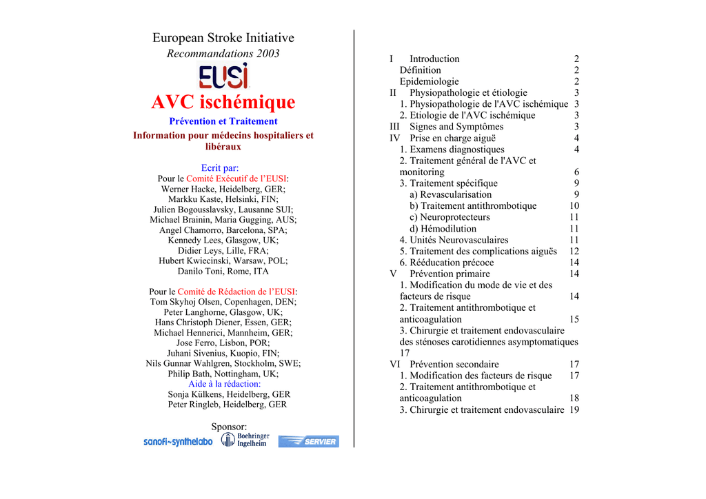European Stroke Initiative Recommandations 2003 AVC ischémique Prévention et Traitement Information pour médecins hospitaliers et libéraux Ecrit par: Pour le Comité Exécutif de l’EUSI: Werner Hacke, Heidelberg, GER; Markku Kaste, Helsinki, FIN; Julien Bogousslavsky, Lausanne SUI; Michael Brainin, Maria Gugging, AUS; Angel Chamorro, Barcelona, SPA; Kennedy Lees, Glasgow, UK; Didier Leys, Lille, FRA; Hubert Kwiecinski, Warsaw, POL; Danilo Toni, Rome, ITA Pour le Comité de Rédaction de l’EUSI: Tom Skyhoj Olsen, Copenhagen, DEN; Peter Langhorne, Glasgow, UK; Hans Christoph Diener, Essen, GER; Michael Hennerici, Mannheim, GER; Jose Ferro, Lisbon, POR; Juhani Sivenius, Kuopio, FIN; Nils Gunnar Wahlgren, Stockholm, SWE; Philip Bath, Nottingham, UK; Aide à la rédaction: Sonja Külkens, Heidelberg, GER Peter Ringleb, Heidelberg, GER Sponsor: I Introduction 2 Définition 2 Epidemiologie 2 II Physiopathologie et étiologie 3 1. Physiopathologie de l'AVC ischémique 3 2. Etiologie de l'AVC ischémique 3 III Signes and Symptômes 3 IV Prise en charge aiguë 4 1. Examens diagnostiques 4 2. Traitement général de l'AVC et monitoring 6 3. Traitement spécifique 9 a) Revascularisation 9 b) Traitement antithrombotique 10 c) Neuroprotecteurs 11 d) Hémodilution 11 4. Unités Neurovasculaires 11 5. Traitement des complications aiguës 12 6. Rééducation précoce 14 V Prévention primaire 14 1. Modification du mode de vie et des facteurs de risque 14 2. Traitement antithrombotique et anticoagulation 15 3. Chirurgie et traitement endovasculaire des sténoses carotidiennes asymptomatiques 17 VI Prévention secondaire 17 1. Modification des facteurs de risque 17 2. Traitement antithrombotique et anticoagulation 18 3. Chirurgie et traitement endovasculaire 19 I Introduction L’accident vasculaire cérébral (AVC) est une des premières causes de morbidité et de mortalité dans le monde. Encore récemment, la prise en charge aiguë était caractérisée par un « nihilisme » thérapeutique. Toutefois, une meilleure connaissance de la physiopathologie et de nouveaux traitements pour la phase aiguë ont changé la prise en charge des AVC. L’AVC aigu est de plus en plus reconnu comme une urgence médicale. La prise en charge des AVC aigus dans des unités spécialisées (unités neurovasculaires) a prouvé son efficacité dans l’AVC ischémique aigu. Bien que pas disponible dans tous les centres, le traitement thrombolytique offre une option thérapeutique supplémentaire. Dans cette brochure, nous présentons un résumé actualisé des aspects cliniques de l’AVC ischémique en accordant une importance particulière au traitement et à la prévention selon les recommandations proposées par l’ European Stroke Initiative Définition L’AVC est défini par un déficit neurologique d’apparition brutale, dû à une ischémie ou une hémorragie cérébrale. Nous nous concentrons ici sur l’AVC ischémique, qui représente environ 75% de tous les AVC. L’AVC ischémique est causé par l’occlusion localisée d’un vaisseau conduisant à un arrêt de l’apport en oxygène et en glucose du cerveau, entraînant un effondrement des processus métaboliques dans le territoire affecté. Epidémiologie L’AVC est, après la pathologie cardiovasculaire et tumorale, la troisième cause de décès dans les pays industrialisés. Il est la première cause de morbidité et de handicap au long cours en Europe comme dans d’autres pays industrialisés. L’incidence des AVC varie entre les différents pays européens. Elle est estimée entre 100 and 200 nouveaux AVC / 100.000 habitants / an. Ceci représente un poids économique énorme. II Physiopathologie et Etiologie 1. Physiopathologie de l’AVC ischémique Après interruption de l’apport sanguin, suite à l’occlusion ou l’hypoperfusion d’un vaisseau cérébral, survient, en l’espace de quelques minutes, la mort neuronale au centre de l’aire infarcie. A la périphérie de l’aire infarcie, appelée pénombre ischémique, le tissu cérébral est fonctionnellement altéré mais encore viable, l’apport sanguin se faisant par des vaisseaux collatéraux. Cette zone de pénombre ischémique peut se transformer en tissue infarci suite à des lésions neuronales secondaires induites par une cascade biochimique délétère conduisant à des effets cytotoxiques et excitotoxiques. 2. Etiologie de l’AVC ischémique Alors que les processus biochimiques dans le tissu cérébral ischémié sont uniformes, il existe différentes causes d’AVC ischémique, incluant : • Des lésions sténosantes artériosclérotiques et athérothrombotiques des artères cervicales extracrâniennes et des artères de gros calibre de la base du cerveau, conduisant à une hypoperfusion critique en aval de sténoses de haut grade • Des embolies d’artère à artère provenant de lésions athérothrombotiques et conduisant à une occlusion de vaisseaux intracrâniens • Des embolies systémiques (source cardiaque, telle qu’une valve prothétique, une fibrillation auriculaire, un thrombus intracardiaque, une cardiomyopathie dilatée, un infarctus du myocarde récent, ou shunts intracardiaques) • Une lipohyalinose des petits vaisseaux, conduisant à des lésions lacunaires microangiopathiques Les causes plus rares incluent • Dissection artérielle cervicale • Vascularite • Thrombose due à une coagulopathie III Signes et Symptômes Les signes et symptômes varient en fonction du territoire cérébral concerné. Cependant, certains symptômes fréquemment. Ils incluent: sont retrouvés • • • • • Un déficit moteur et/ou une perte de sensibilité controlatérale Une aphasie, une apraxie, une dysarthrie Une hémianopsie partielle ou complète De troubles de la conscience et une confusion Une diplopie, une vertige, un nystagmus, une ataxie • La prévention et le traitement de complications, soit médicales (telles que: inhalation, infection, ulc