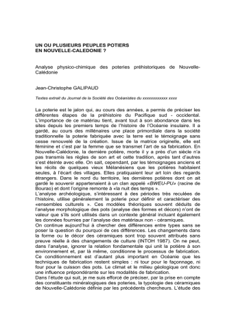 UN OU PLUSIEURS PEUPLES POTIERS EN NOUVELLE-CALEDONIE ? Analyse physico-chimique des poteries préhistoriques de NouvelleCalédonie Jean-Christophe GALIPAUD Textes extrait du Journal de la Société des Océanistes du xxxxxxxxxxxx xxxx La poterie est le jalon qui, au cours des années, a permis de préciser les différentes étapes de la préhistoire du Pacifique sud - occidental. L’importance de ce matériau tient, avant tout à son abondance dans les sites depuis les premiers temps de l’histoire de l’Océanie insulaire. Il a gardé, au cours des millénaires une place primordiale dans la société traditionnelle la poterie fabriquée avec la terre est le témoignage sans cesse renouvelé de la création. Issue de la matrice originelle, elle est féminine et c’est par la femme que se transmet l’art de sa fabrication. En Nouvelle-Calédonie, la dernière potière, morte il y a près d’un siècle n’a pas transmis les règles de son art et cette tradition, après tant d’autres s’est éteinte avec elle. On sait, cependant, par les témoignages anciens et les récits de quelques vieux Mélanésiens que les potières habitaient seules, à l’écart des villages. Elles pratiquaient leur art loin des regards étrangers. Dans le nord du territoire, les dernières potières dont on ait gardé le souvenir appartenaient à un clan appelé «BWEU-PU» (racine de Bourao) et dont l’origine remonte à «la nuit des temps ». L’analyse archéologique, s’intéressant à des périodes très reculées de l’histoire, utilise généralement la poterie pour définir et caractériser des «ensembles culturels ». Ces modèles théoriques souvent déduits de l’analyse morphologique des pots (analyse des formes et décors) n’ont de valeur que s’ils sont utilisés dans un contexte général incluant également les données fournies par l’analyse des matériaux non - céramiques. On continue aujourd’hui à chercher des différences entre types sans se poser la question du pourquoi de ces différences. Les changements dans la forme ou le décor des céramiques sont trop souvent attribués sans preuve réelle à des changements de culture (INTOH 1987). On ne peut, dans l’analyse, ignorer la relation fondamentale qui unit la potière à son environnement et, par là même, conditionne le processus de fabrication. Ce conditionnement est d’autant plus important en Océanie que les techniques de fabrication restent simples : ni tour pour le façonnage, ni four pour la cuisson des pots. Le climat et le milieu géologique ont donc une influence prépondérante sur les modalités de fabrication. Dans l’étude qui suit, je me suis efforcé de préciser, par la prise en compte des constituants minéralogiques des poteries, la typologie des céramiques de Nouvelle-Calédonie définie par les précédents chercheurs. L’étude des stratégies de fabrication m’amènera ensuite à proposer une nouvelle interprétation de l’évolution culturelle de l’île en relation avec celle des îles avoisinantes. LA RECHERCHE ARCHÉOLOGIQUE EN NOUVELLE-CALÉDONIE. Jacques Avias, en 1950 pose les bases de la première classification typologique des poteries de Nouvelle-Calédonie. Il utilise, pour cela, les nombreux tessons qu’il récolte en différents points du Territoire lors de ses missions de prospection géologique. Cette classification axée sur le décor ou les éléments remarquables a une valeur chronologique très limitée. L’auteur considère sept types de poterie qu’il associe à deux traditions A. B. — Poteries canaques classiques. — Poteries proto ou préhistorique. Par «poteries canaques classiques », l’auteur entend celles que l’on trouve encore dans certains lieux sacrés de brousse et dont la fabrication a cessé peu après l’arrivée des premiers Européens. Par «poteries proto ou préhistoriques », j. Avias entend toutes les poteries trouvées dans un contexte archéologique ancien village, alluvions de rivière, zones remaniées de bord de mer. Il distingue dans ce groupe important a. b. c. d. e. f. g. Les poteries à faciès «mélanésien sensu stricto >. Les poteries de la presqu’île de Foué près de Koné. Les poteries à «pustules ». Les poteries à anses rondes. Les poteries à anses plates. Les poteries à «guirlandes» de Moindou. Les poteries de St. François près Vao. Il est intéressant de donner le détail de cette première classification dont les termes ont été réutilisés jusqu’à la période présente. Deux types de poterie dont on verra plus loin l’importance n’apparaissent pas dans cette typologie : la poterie décorée «au battoir» et la poterie décorée de chevrons incisés. La poterie décorée au battoir — dénommée aujourd’hui poterie décorée de reliefs imprimés côtelés —, difficile à reconnaître au premier coup d'œil, fait son apparition dans la typologie néo-calédonienne six ans plus tard à l’occasion des travaux réalisés par Gifford et Shutler (1956). La poterie décorée de chevrons incisés, déjà connue du temps de J. Avias fut d’abord attribuée par ce dernier au groupe des poteries «faciès mélanésien» comme la plupart des poteries décorées d’incisions. Par ailleurs l’auteur ne se hasarde pas à attribuer les poteries de Koné et de St. François (plus connues maintenant sous la dénominations de poteries Lapita) à une unique tradition. Il note cependant la relation qui unit les poteries de St. François et celles de Watom (Nouvelle-Bretagne) et émet l’hypothèse d’une relation possible entre les poteries de St. François et celles de Foué (Koné). Ce travail dont l’unique mérite est d’avoir le premier tenté une approche scientifique du problème posé par la poterie en Nouvelle-Calédonie reste très fragmentaire. Avias (1950 : p. 136, fig. J) conclut en discutant des affinités probables des poteries néo-calédoniennes avec d’autres poteries de Méla