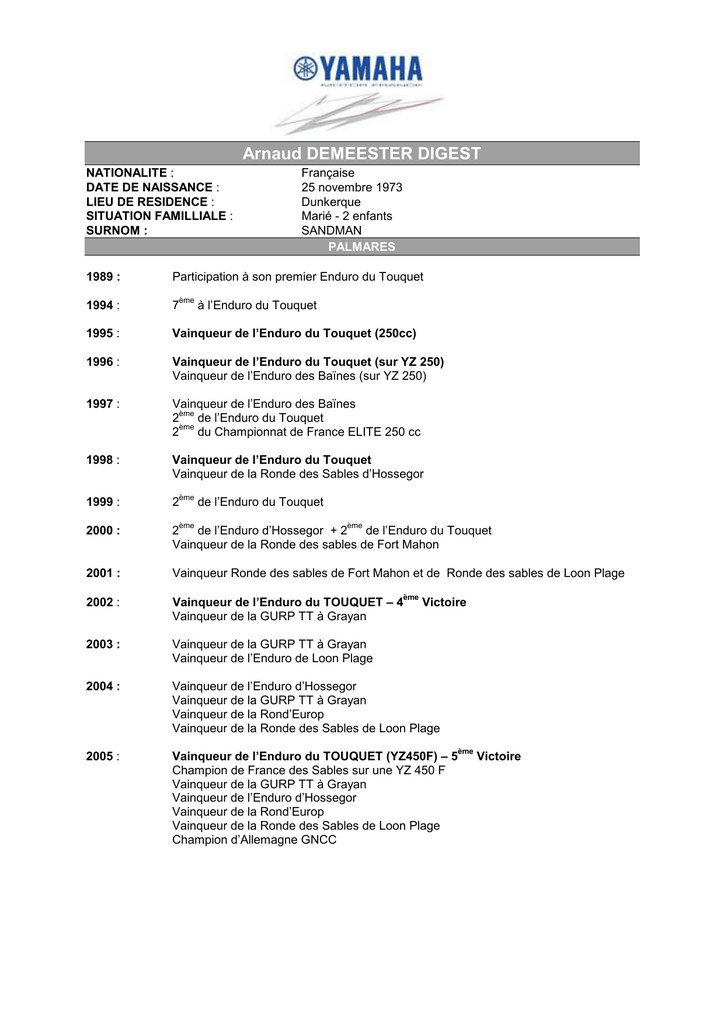 Arnaud DEMEESTER DIGEST NATIONALITE : DATE DE NAISSANCE : LIEU DE RESIDENCE : SITUATION FAMILLIALE : SURNOM : Française 25 novembre 1973 Dunkerque Marié - 2 enfants SANDMAN PALMARES 1989 : Participation à son premier Enduro du Touquet 1994 : 7 1995 : Vainqueur de l’Enduro du Touquet (250cc) 1996 : Vainqueur de l’Enduro du Touquet (sur YZ 250) Vainqueur de l’Enduro des Baïnes (sur YZ 250) 1997 : Vainqueur de l’Enduro des Baïnes ème 2 de l’Enduro du Touquet ème 2 du Championnat de France ELITE 250 cc 1998 : Vainqueur de l’Enduro du Touquet Vainqueur de la Ronde des Sables d’Hossegor 1999 : 2 2000 : de l’Enduro d’Hossegor + 2 de l’Enduro du Touquet 2 Vainqueur de la Ronde des sables de Fort Mahon 2001 : Vainqueur Ronde des sables de Fort Mahon et de Ronde des sables de Loon Plage 2002 : Vainqueur de l’Enduro du TOUQUET – 4 Vainqueur de la GURP TT à Grayan 2003 : Vainqueur de la GURP TT à Grayan Vainqueur de l’Enduro de Loon Plage 2004 : Vainqueur de l’Enduro d’Hossegor Vainqueur de la GURP TT à Grayan Vainqueur de la Rond’Europ Vainqueur de la Ronde des Sables de Loon Plage 2005 : Vainqueur de l’Enduro du TOUQUET (YZ450F) – 5 Champion de France des Sables sur une YZ 450 F Vainqueur de la GURP TT à Grayan Vainqueur de l’Enduro d’Hossegor Vainqueur de la Rond’Europ Vainqueur de la Ronde des Sables de Loon Plage Champion d’Allemagne GNCC ème ème ème à l’Enduro du Touquet de l’Enduro du Touquet ème ème Victoire ème Victoire 2006 : Vainqueur de la GURP TT à Grayan Vainqueur de la Rond’Europe – Fort Mahon Champion d’Allemagne GNCC 2007 : Vainqueur de l’Enduro du Touquet (YZF 450 (6 Champion de France des sables 2007 Vainqueur de la Ronde des sable de Fort Mahon 2008 : Vainqueur de l'Enduro du Touquet (YZF 450) (7ème victoire- record absolu) ème victoire)