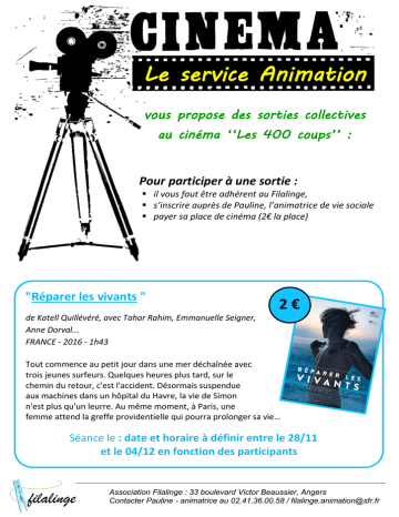 Le service Animation vous propose des sorties collectives au cinéma ‘‘Les 400 coups’’ : Pour participer à une sortie : il vous faut être adhérent au Filalinge, s’inscrire auprès de Pauline, l’animatrice de vie sociale payer sa place de cinéma (2€ la place) "Réparer les vivants " 2€ de Katell Quillévéré, avec Tahar Rahim, Emmanuelle Seigner, Anne Dorval... FRANCE - 2016 - 1h43 Tout commence au petit jour dans une mer déchaînée avec trois jeunes surfeurs. Quelques heures plus tard, sur le chemin du retour, c'est l'accident. Désormais suspendue aux machines dans un hôpital du Havre, la vie de Simon n'est plus qu'un leurre. Au même moment, à Paris, une femme attend la greffe providentielle qui pourra prolonger sa vie… Séance le : date et horaire à définir entre le 28/11 et le 04/12 en fonction des participants Association Filalinge : 33 boulevard Victor Beaussier, Angers Contacter Pauline - animatrice au 02.41.36.00.58 / [email protected] "Captain Fantastic " de Matt Ross, avec Viggo Mortensen, Frank Langella, George Mackay... USA - 2016 - 2h00 - version originale sous-titrée Prix du Jury & Prix du public Deauville 2016 / Un Certain Regard – Prix de la mise en scène Cannes 2016 2€ Dans les forêts reculées du nord-ouest des Etats-Unis, vivant isolé de la société, un père dévoué a consacré sa vie toute entière à faire de ses six jeunes enfants d'extraordinaires adultes. Mais quand le destin frappe sa famille, ils doivent abandonner ce paradis qu'il avait créé pour eux. La découverte du monde extérieur va l'obliger à questionner ses méthodes d'éducation et remettre en cause tout ce qu'il leur a appris. Séance le : mardi 22 novembre à 17h30 Nous pourrons envisager une autre date à venir " Moi, Daniel Blake " de Ken Loach, avec Dave Johns, Hayley Squires, Dylan McKiernan... ANGLETERRE, FRANCE, BELGIQUE - 2016 - 1h40 version originale sous-titrée Palme d'or Cannes 2016 2€ Pour la première fois de sa vie, Daniel Blake, un menuisier anglais de 59 ans, est contraint de faire appel à l'aide sociale à la suite de problèmes cardiaques. Mais bien que son médecin lui ait interdit de travailler, il se voit signifier l'obligation d'une recherche d'emploi sous peine de sanction. Au cours de ses rendez-vous réguliers au « job center », Daniel va croiser la route de Rachel, mère célibataire de deux enfants qui a été contrainte d'accepter un logement à 450km de sa ville natale pour ne pas être placée en foyer d'accueil. Pris tous deux dans les filets des aberrations administratives de la Grande-Bretagne d'aujourd'hui, Daniel et Rachel vont tenter de s'entraider. Séance le : date et horaire à définir en fonction des participants Association Filalinge : 33 boulevard Victor Beaussier, Angers Contacter Pauline - animatrice au 02.41.36.00.58 / [email protected]