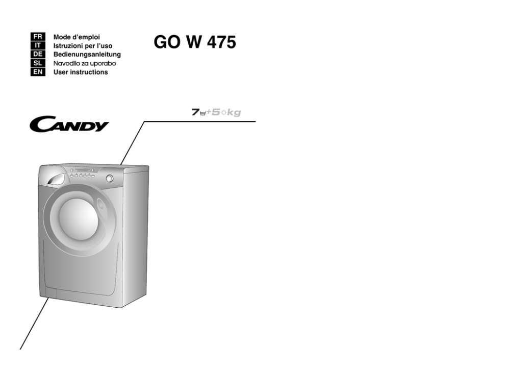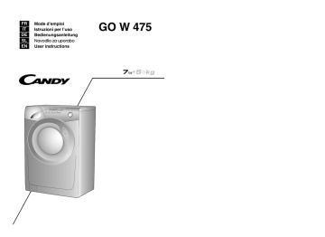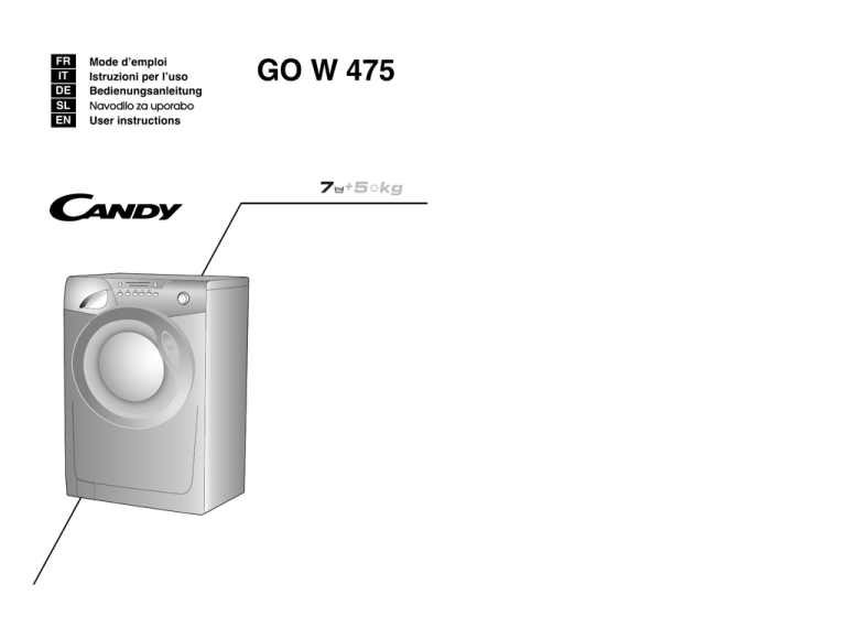 FR IT DE SL EN Mode d’emploi Istruzioni per l’uso Bedienungsanleitung Navodilo za uporabo User instructions GO W 475 FR 2 IT DE SL EN TOUS NOS COMPLIMENTS COMPLIMENTI HERZLICHEN GLÜCKWUNSCH! âESTITAMO! OUR COMPLIMENTS En achetant cet appareil ménager Candy, vous avez démontré que vous n’acceptez aucun compromis: vous voulez toujours ce qu’il y a de mieux. Con l’acquisto di questo elettrodomestico Candy; Lei ha dimostrato di non accettare compromessi: Lei vuole il meglio. Mit dem Kauf dieses Candy Elektrogerätes haben Sie bewiesen, daß Sie stets nur das Beste wählen - ohne Kompromisse. Z nakupom na‰ega stroja ste pokazali, da ne i‰ãete kompromisnih re‰itev in da ste kupec, ki hoãe le najbolj‰e. With the purchase of this Candy household appliance, you have shown that you will not accept compromises: you want only the best. Candy a le plaisir de vous proposer cette nouvelle machine à laver qui est le résultat d’années de recherches et d’études des besoins du consommateur. Vous avez fait le choix de la qualité, de la fiabilité et de l’efficacité. Candy é lieta di proporLe questa nuova lavatrice frutto di anni di ricerche e di esperienze maturate sul mercato, a contatto diretto con i Consumatori. Lei ha scelto la qualità, la durata e le elevate prestazioni che questa lavatrice Le offre. Z velikim zadovoljstvom vam ponujamo nov pralni stroj, rezultat dolgoletnih raziskovanj in izku‰enj, ki smo jih pridobili na trÏi‰ãu v neposrednem stiku s kupci. Izbrali ste kakovost, vzdrÏljivost in zanimivo obliko. Candy is happy to present their new washing machine, the result of years of research and market experience through direct contact with Consumers. You have chosen the quality, durability and high performance that this washing machine offers. Candy vous propose une large gamme d’appareils électroménagers: machines à laver la vaisselle, machines à laver et sécher le linge, cuisinières, fours à microondes, fours et tables de cuisson, hottes, réfrigerateurs et congélateurs. Candy Le propone inoltre una vasta gamma di elettrodomestici: lavatrici, lavastoviglie, lavasciuga, cucine, forni a microonde, forni e piani di cottura, frigoriferi e congelatori. Candy freut sich, Ihnen diese neue Waschmaschine anbieten zu können. Sie ist das Ergebnis jahrelanger Forschung und einer Markterfahrung, die im ständigen direkten Kontakt mit dem Verbraucher gereift ist. Sie haben mit diesem Gerät Qualität, lange Lebensdauer und einen hohen Leistungsstandard gewählt. Chieda al Suo Rivenditore il catalogo completo dei prodotti Candy Razen stroja, ki ste ga izbrali, pa imamo na izbiro ‰e pomivalne in su‰ilne stroje, prostostojeãe ‰tedilnike, kuhalne plo‰ãe, mikrovalovne peãice, vgradne peãice in ‰tedilnike ter hladilnike in zamrzovalnike. Pri svojem prodajalcu zahtevajte najnovej‰i Candyjev katalog. Candy is also able to offer a vast range of other household appliances: washing machines, dishwashers, washer-dryers, cookers, microwave ovens. Traditional ovens and hobs, refrigerators and freezers. Demandez à votre Revendeur le catalogue complet des produits Candy. Candy bietet Ihnen darüber hinaus eine breite Palette weiterer elektrischer Haushaltsgeräte: Waschmaschinen, Geschirrspüler, Wäschetrockner, Elektroherde, Mikrowellenherde, Backöfen und Kochfelder, Kühl - und Gefrierschränke. Nous vous prions de lire attentivement les conseils contenus dans ce livret. Il contient d’importantes indications concernant les procédures d’installation, d’emploi, d’entretien et quelques suggestions utiles en vue d’améliorer l’utilisation de la machine à laver. La preghiamo di leggere attentamente le avvertenze contenute nel presente libretto in quanto forniscono importanti indicazioni riguardanti la sicurezza di installazione, d’uso, di manutenzione e alcuni utili consigli per il migliore utilizzo della lavatrice. Conservez avec soin ce livret: vous pourrez le consulter bien souvent. Conservi con cura questo libretto per ogni ulteriore consultazione. Quand vous communiquez avec Candy, ou avec ses centres d’assistance, veuillez citer le Modèle, le n° et le numéro G (éventuellement). Quando comunica con la Candy o con i suoi centri di assistenza citi sempre il Modello, il n° e il numero G (se c’è). Praticamente tutto ciò che é citato nel riquadro. Fragen Sie Ihren Fachhändler nach dem kompletten Candy Katalog. Lesen Sie bitte aufmerksam die Anweisungen, die Sie in diesem Heft finden. Sie finden dort wichtige Hinweise zur sicheren Installation, zur Bedienung, zur Pflege und zur optimalen Verwendung der Waschmaschine. Uporaba tega novega pralnega stroja je enostavna, vendar pa vas prosimo, da skrbno preberete NAVODILO ZA UPORABO in ga v celoti upo‰tevate. V navodilu so navedene vse pomembne informacije v zvezi s prikljuãitvijo, vzdrÏevanjem in uporabo stroja. Ask your local retailer for the complete catalogue of Candy products. Please read this booklet carefully as it provides important guide lines for safe installation, use and maintenance and some useful advise for best results when using your washing machine. Bewahren Sie das Heft für eine spätere Nutzung gut auf. Priporoãamo, da skrbno shranite to knjiÏico z navodili, da jo boste lahko prebrali tudi kdaj kasneje, ãe bo potrebno. Keep this booklet in a safe place for further consultation. Geben Sie bitte in allen Mitteilungen an Candy oder an Ihre zuständige Kundendienststelle stets das Modell, die Nummer und die G-Nummer (falls vorhanden),also praktisch alle Angaben des Typenschildes -, an. Kadar boste morali zaradi morebitne okvare pralnega stroja poklicati enega od na‰ih serviserjev mu obvezno sporoãite oznako modela, ‰t. stroja in ‰t. G, ãe je navedena na plo‰ãici s tehniãnimi podatki, ki je pritrjena na stroju. When contacting Candy or a Customer Services Centre always refer to the Model, No., and G number (if applicable of the appliance see pane
