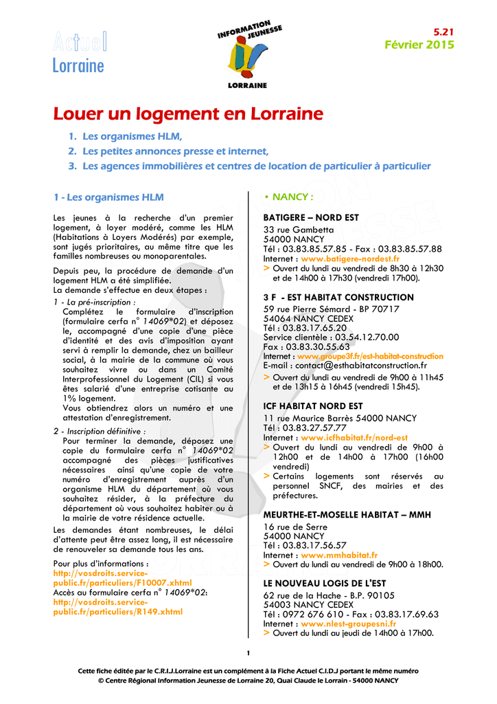 5.21 Février 2015 Lorraine Louer un logement en Lorraine 1. Les organismes HLM, 2. Les petites annonces presse et internet, 3. Les agences immobilières et centres de location de particulier à particulier 1 - Les organismes HLM • NANCY : Les jeunes à la recherche d’un premier logement, à loyer modéré, comme les HLM (Habitations à Loyers Modérés) par exemple, sont jugés prioritaires, au même titre que les familles nombreuses ou monoparentales. BATIGERE – NORD EST 33 rue Gambetta 54000 NANCY Tél : 03.83.85.57.85 - Fax : 03.83.85.57.88 Internet : www.batigere-nordest.fr > Ouvert du lundi au vendredi de 8h30 à 12h30 et de 14h00 à 17h30 (vendredi 17h00). Depuis peu, la procédure de demande d’un logement HLM a été simplifiée. La demande s’effectue en deux étapes : 1 - La pré-inscription : Complétez le formulaire d’inscription (formulaire cerfa n° 14069*02) et déposez le, accompagné d’une copie d’une pièce d’identité et des avis d’imposition ayant servi à remplir la demande, chez un bailleur social, à la mairie de la commune où vous souhaitez vivre ou dans un Comité Interprofessionnel du Logement (CIL) si vous êtes salarié d’une entreprise cotisante au 1% logement. Vous obtiendrez alors un numéro et une attestation d’enregistrement. 2 - Inscription définitive : Pour terminer la demande, déposez une copie du formulaire cerfa n° 14069*02 accompagné des pièces justificatives nécessaires ainsi qu’une copie de votre numéro d’enregistrement auprès d’un organisme HLM du département où vous souhaitez résider, à la préfecture du département où vous souhaitez habiter ou à la mairie de votre résidence actuelle. Les demandes étant nombreuses, le délai d’attente peut être assez long, il est nécessaire de renouveler sa demande tous les ans. 3 F - EST HABITAT CONSTRUCTION 59 rue Pierre Sémard - BP 70717 54064 NANCY CEDEX Tél : 03.83.17.65.20 Service clientèle : 03.54.12.70.00 Fax : 03.83.30.55.63 Internet : www.groupe3f.fr/est-habitat-construction E-mail : [email protected] > Ouvert du lundi au vendredi de 9h00 à 11h45 et de 13h15 à 16h45 (vendredi 15h45). ICF HABITAT NORD EST 11 rue Maurice Barrès 54000 NANCY Tél : 03.83.27.57.77 Internet : www.icfhabitat.fr/nord-est > Ouvert du lundi au vendredi de 9h00 à 12h00 et de 14h00 à 17h00 (16h00 vendredi) > Certains logements sont réservés au personnel SNCF, des mairies et des préfectures. MEURTHE-ET-MOSELLE HABITAT – MMH 16 rue de Serre 54000 NANCY Tél : 03.83.17.56.57 Internet : www.mmhabitat.fr > Ouvert du lundi au vendredi de 9h00 à 18h00. Pour plus d’informations : http://vosdroits.servicepublic.fr/particuliers/F10007.xhtml Accès au formulaire cerfa n° 14069*02: http://vosdroits.servicepublic.fr/particuliers/R149.xhtml LE NOUVEAU LOGIS DE L'EST 62 rue de la Hache - B.P. 90105 54003 NANCY CEDEX Tél : 0972 676 610 - Fax : 03.83.17.69.63 Internet : www.nlest-groupesni.fr > Ouvert du lundi au jeudi de 14h00 à 17h00. 1 Cette fiche éditée par le C.R.I.J.Lorraine est un complément à la Fiche Actuel C.I.D.J portant le même numéro © Centre Régional Information Jeunesse de Lorraine 20, Quai Claude le Lorrain - 54000 NANCY 5.21 Février 2015 Lorraine OPH DE NANCY 32 rue Saint Léon – CS 95418 54054 NANCY CEDEX Tél : 03.83.85.71.40 E-mail : [email protected] Internet : www.ophnancy.fr > Ouvert du lundi au vendredi de 8h30 à 12h15 et de 13h30 à 17h30. LOGIEST 15 rue Sente à My – B.P. 80785 57012 METZ CEDEX 01 Tél : 03.87.65.63.11 - Fax : 03.87.65.80.52 Internet : www.logiest.fr > Agences de proximité : - METZ - 191 avenue André Malraux 57000 Metz Tél. 03 87 65 80 55 - WOIPPY - 16 place Jean Perrin 57140 Woippy Tél. 03 87 30 17 91 - THIONVILLE - 1 rue de l'Equerre 57100 Thionville Tél. 03 82 59 59 80 - SAINT-AVOLD 13 avenue Georges Clémenceau 57500 Saint-Avold Tél. 03 87 91 04 34 > Ouvert du lundi au jeudi de 10h à 12h et de14h à 16h, le vendredi de 10h à 12h. SOCIETE LORRAINE D’HABITAT - SLH 2 passage Sébastien Bottin - BP 90150 54003 NANCY CEDEX Tél : 03.83.39.62.00 - Fax : 03.83.39.62.26 E-mail : [email protected] Internet : www.lorraine-habitat.fr > Ouvert du lundi au vendredi de 9h à 12h et de 13h30 à 17h30 (17h le vendredi). • EN MEUSE : OPH DE MEUSE - 2 rue d’Alsace, côte sainte Catherine 55000 BAR-LE-DUC - 4 rue Jean Bouin 55100 VERDUN - 36 place Charles de Gaulle 55200 COMMERCY Tél : 03.29.45.12.22 - Fax : 03.29.79.14.01 Internet : www.oph-meuse.fr > Ouvert du lundi au vendredi de 8h30 à 12h et de 13h30 à 17h (vendredi 16h). MOSELIS 1 bis rue du Pré Chaudron 57070 METZ Tél : 03.87.55.75.00 - Fax : 03.87.74.71.01 E-mail : [email protected] Internet : www.moselis.fr > Accueil du public : du lundi au vendredi de 9h à 12h et de 14h à 17h (vendredi 16h). • METZ : METZ HABITAT TERRITOIRE 10 rue du Chanoine Collin 57000 METZ Tél : 03.87.75.03.40 - Fax : 03.87.37.02.40 E-mail : [email protected] Internet : www.metz-habitat-territoire.fr > Ouvert du lundi au jeudi de 8h00 à 12h00 et de 13h00 à 17h00, le vendredi de 8h00 à 12h00. BATIGERE 6 place Saint-Martin 57000 METZ Tél : 03.87.18.41.60 - Fax : 03.87.18.41.79 Internet : www.batigere-sarel.fr > Ouvert du lundi au vendredi de 8h30 à 12h et de 13h30 à 17h30, le samedi de 9h à 12h (accueil téléphonique aux mêmes horaires). ICF HABITAT NORD-EST 2 bis rue Lafayette – BP 90572 57010 METZ CEDEX 01 Tél : 03.87.63.96.21 E-mail : [email protected] Internet : www.icfhabitat.fr/nord-est > Ouvert du lundi au vendredi de 9h00 à 12h00 et de 13h30 à 17h00 (16h00 vendredi) 3F - EST HABITAT CONSTRUCTION 2 place de la nation – BP 50808 57953 MONTIGNY-LES-METZ CEDEX Tél service clientèle : 03.54.12.70.00 - Fax : 03.87.63.05.95 > Ouvert du lundi au vendredi de 9h à 11h45 et de 13h15 à 16h45 (15h45 vendredi). 2 Cette fiche éditée par le C.R.I.J.Lorraine est un complément à la Fiche Actuel C.I.D.J portant le même numéro © Centre Régional Information Jeunesse de L