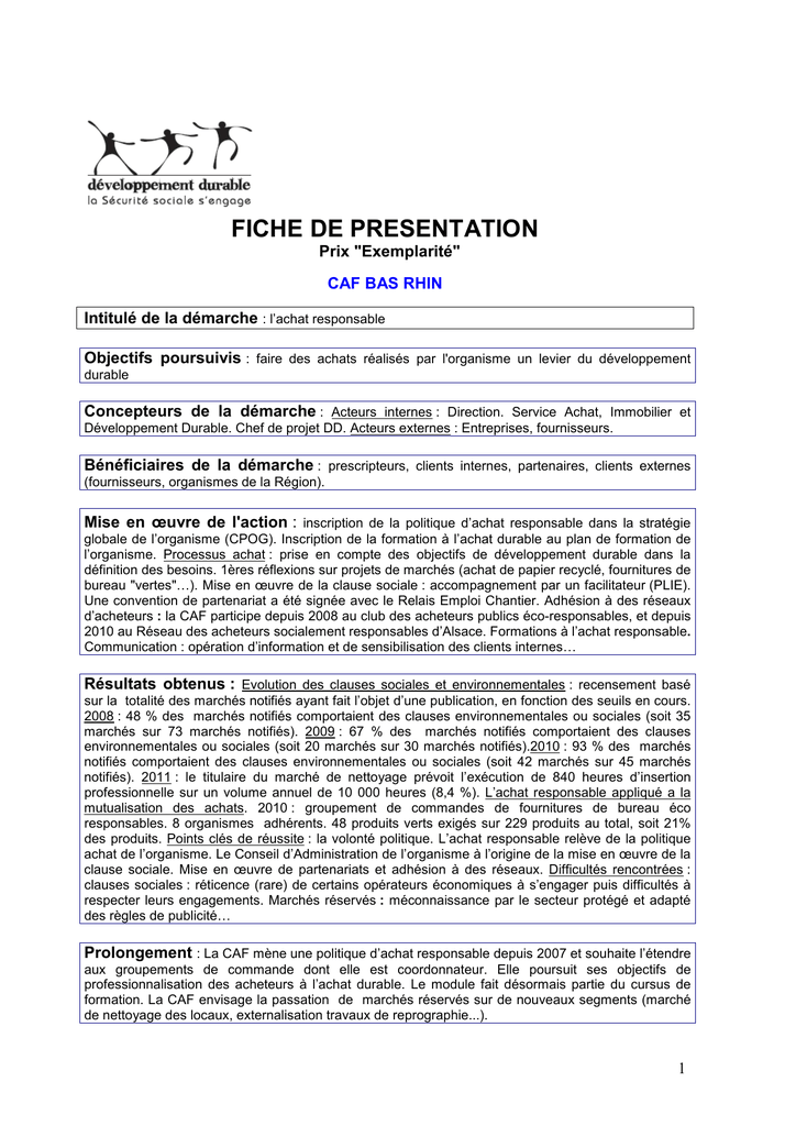 FICHE DE PRESENTATION Prix "Exemplarité" CAF BAS RHIN Intitulé de la démarche : l’achat responsable Objectifs poursuivis : faire des achats réalisés par l'organisme un levier du développement durable Concepteurs de la démarche : Acteurs internes : Direction. Service Achat, Immobilier et Développement Durable. Chef de projet DD. Acteurs externes : Entreprises, fournisseurs. Bénéficiaires de la démarche : prescripteurs, clients internes, partenaires, clients externes (fournisseurs, organismes de la Région). Mise en œuvre de l'action : inscription de la politique d’achat responsable dans la stratégie globale de l’organisme (CPOG). Inscription de la formation à l’achat durable au plan de formation de l’organisme. Processus achat : prise en compte des objectifs de développement durable dans la définition des besoins. 1ères réflexions sur projets de marchés (achat de papier recyclé, fournitures de bureau "vertes"…). Mise en œuvre de la clause sociale : accompagnement par un facilitateur (PLIE). Une convention de partenariat a été signée avec le Relais Emploi Chantier. Adhésion à des réseaux d’acheteurs : la CAF participe depuis 2008 au club des acheteurs publics éco-responsables, et depuis 2010 au Réseau des acheteurs socialement responsables d’Alsace. Formations à l’achat responsable. Communication : opération d’information et de sensibilisation des clients internes… Résultats obtenus : Evolution des clauses sociales et environnementales : recensement basé sur la totalité des marchés notifiés ayant fait l’objet d’une publication, en fonction des seuils en cours. 2008 : 48 % des marchés notifiés comportaient des clauses environnementales ou sociales (soit 35 marchés sur 73 marchés notifiés). 2009 : 67 % des marchés notifiés comportaient des clauses environnementales ou sociales (soit 20 marchés sur 30 marchés notifiés).2010 : 93 % des marchés notifiés comportaient des clauses environnementales ou sociales (soit 42 marchés sur 45 marchés notifiés). 2011 : le titulaire du marché de nettoyage prévoit l’exécution de 840 heures d’insertion professionnelle sur un volume annuel de 10 000 heures (8,4 %). L’achat responsable appliqué a la mutualisation des achats. 2010 : groupement de commandes de fournitures de bureau éco responsables. 8 organismes adhérents. 48 produits verts exigés sur 229 produits au total, soit 21% des produits. Points clés de réussite : la volonté politique. L’achat responsable relève de la politique achat de l’organisme. Le Conseil d’Administration de l’organisme à l’origine de la mise en œuvre de la clause sociale. Mise en œuvre de partenariats et adhésion à des réseaux. Difficultés rencontrées : clauses sociales : réticence (rare) de certains opérateurs économiques à s’engager puis difficultés à respecter leurs engagements. Marchés réservés : méconnaissance par le secteur protégé et adapté des règles de publicité… Prolongement : La CAF mène une politique d’achat responsable depuis 2007 et souhaite l’étendre aux groupements de commande dont elle est coordonnateur. Elle poursuit ses objectifs de professionnalisation des acheteurs à l’achat durable. Le module fait désormais partie du cursus de formation. La CAF envisage la passation de marchés réservés sur de nouveaux segments (marché de nettoyage des locaux, externalisation travaux de reprographie...). 1