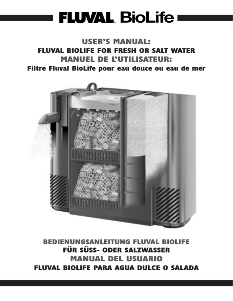 USER’S MANUAL: FLUVAL BIOLIFE FOR FRESH OR SALT WATER MANUEL DE L’UTILISATEUR: Filtre Fluval BioLife pour eau douce ou eau de mer BEDIENUNGSANLEITUNG FLUVAL BIOLIFE FÜR SÜSS- ODER SALZWASSER MANUAL DEL USUARIO FLUVAL BIOLIFE PARA AGUA DULCE O SALADA USER’S MANUAL: FLUVAL BIOLIFE FOR FRESH OR SALT WATER POWERFUL, SPACE-SAVING WATER MANAGEMENT BioLife is a fully integrated multi-stage filter system that contains the first complete internal "trickle" filter with superb mechanical pre-filtering. As water flows through BioLife, solids are captured in the pre-filtering stage, leaving it free of particulates. The water then "trickles" into the "dry" chamber where colonies of beneficial bacteria, which thrive on powerful BioMAX biological rings, effectively remove harmful toxins. BioLife is a powerful filtering system that mechanically and biologically cleans aquarium water. BioLife is ideal for: • fresh or salt water • small or medium aquariums Stage 1: Heater Chamber (Heater sold separately) The first part of the filter case has a large number of slots for water to enter. Water gently flows into the system through the slotted surface area. There is little danger for small or weakened fish to be pulled into the filter by accident. In addition, the gentle water flow through the chamber allows efficient heating if a heater (optional - sold separately) is installed in the supplied bracket. If a heater is installed in the first chamber, the "dry" biological chamber receives warm water, increasing bacterial efficiency during the removal of ammonia and nitrite. Warm water ultimately flows back into the filter and provides major benefits to the entire aquarium. Stage 2: Mechanical Filtration Chamber Standard "wet/dry" systems normaly provide very weak solid removal. Organic waste particles entering the trickle chamber often get lodged and rot. This reduces the efficiency of the beneficial bacteria. BioLife employs a double layer of foam in front of the passing water flow to effectively remove large, medium and many fine particles from the water flow. The foam is reusable and has a large capture capacity. As the water passes through the foam, it loses a large percentage of suspended solids. After most of the solids are removed, water then passes through the very fine mesh of a carbon-impregnated polyester pad, which removes any remaining solid particles and many dissolved liquefied impurities. BioLife does not require unsightly hoses or tubes, making it the perfect choice for installation where standard filtration cannot be used. BioLife is the first true multi-stage filter that can be installed easily anywhere along the inside perimeter of an aquarium. Its advanced design makes installing filter media fast and simple. Understanding Trickle Filtration Trickle filtration is a powerful form of biological filtration that provides the correct environment for beneficial bacteria to cultivate populations large enough to remove all ammonia and nitrite from water. Traditionally, biological filtration is performed in a submerged media, either in an undergravel filter or as water passes through the media of a power filter. Beneficial bacteria also grow on all exposed hard surfaces in the aquarium, such as glass aquarium sides and back. Bacteria that remove ammonia and nitrite are aerobic, which means they require oxygen to survive. Water flowing through the "dry" area not only brings ammonia and nitrite, but also carries vital oxygen to the bacterial colonies. By comparison, water passing through the gravel in undergravel filtration loses most of its oxygen to the bacteria in the gravel. This limits the depth of the living biological bed. As water is expelled in an undergravel filter or through biologically active media in a power filter, it often contains less oxygen than when it entered. A trickle filter does not deprive bacteria of essential oxygen. Water trickling through the "dry" chamber gets oxygen from the surrounding atmosphere, which has a much higher concentration than the passing water. With no oxygen-limiting factor, the population of beneficial bacteria expands to fill the entire available surface area. The trickle filter method increases the efficiency of ammonia and nitrite reduction well beyond oxygen-limiting systems. Trickle filtration also vastly improves water quality since beneficial bacteria do not draw oxygen from the passing water. Oxygen quality is actually improved since the water stream is broken into small droplets as it falls, increasing the exposure to atmospheric oxygen. Oxygen is added to the passing droplets and carbon dioxide is stripped. Therefore, since outgoing water contains more oxygen than incoming water, there is more oxygen available for fish and plant life. True Multi-Stage Internal Filtration BioLife separates filtration tasks into distinct areas to ensure high efficiency and superb overall water purity. Each filtering stage is performed in a segregated area of the filter case. 1 Stage 3: Trickle Chamber After stage 2, water flow is directed to the pump chamber where it returns to the aquarium or is directed by the biological input diverter back to the biological chamber—a mainly dry, air-filled area. Water flows onto the final mechanical strainer, the drip tray screen, which is the last defense for the elimination of any remaining solid particles before water enters the BioMAX rings. Water dripping through the drip tray falls into the BioMAX rings, an inert ceramic bacterial substrate that provides maximum surface area and breeding sites for beneficial bacteria to colonize. The extremely porous rings have ideal diameter tunnels and crevices that enable powerful bacterial populations to grow. These beneficial bacteria remove harmful ammonia and nitrite. As it drips through the "dry" chamber, water is oxygenated by the surrounding air. When the water finally falls into the running channel below, it joins the rest of the water flow returning to the aquariu