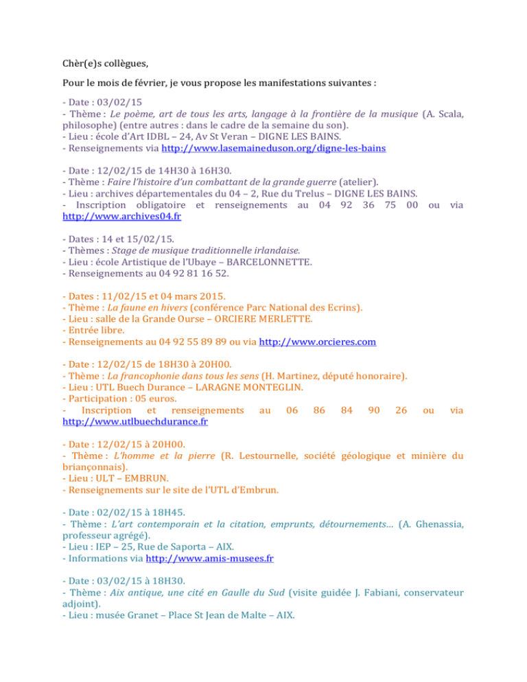 Chèr(e)s collègues, Pour le mois de février, je vous propose les manifestations suivantes : - Date : 03/02/15 - Thème : Le poème, art de tous les arts, langage à la frontière de la musique (A. Scala, philosophe) (entre autres : dans le cadre de la semaine du son). - Lieu : école d’Art IDBL – 24, Av St Veran – DIGNE LES BAINS. - Renseignements via http://www.lasemaineduson.org/digne-les-bains - Date : 12/02/15 de 14H30 à 16H30. - Thème : Faire l’histoire d’un combattant de la grande guerre (atelier). - Lieu : archives départementales du 04 – 2, Rue du Trelus – DIGNE LES BAINS. - Inscription obligatoire et renseignements au 04 92 36 75 00 ou via http://www.archives04.fr - Dates : 14 et 15/02/15. - Thèmes : Stage de musique traditionnelle irlandaise. - Lieu : école Artistique de l’Ubaye – BARCELONNETTE. - Renseignements au 04 92 81 16 52. - Dates : 11/02/15 et 04 mars 2015. - Thème : La faune en hivers (conférence Parc National des Ecrins). - Lieu : salle de la Grande Ourse – ORCIERE MERLETTE. - Entrée libre. - Renseignements au 04 92 55 89 89 ou via http://www.orcieres.com - Date : 12/02/15 de 18H30 à 20H00. - Thème : La francophonie dans tous les sens (H. Martinez, député honoraire). - Lieu : UTL Buech Durance – LARAGNE MONTEGLIN. - Participation : 05 euros. - Inscription et renseignements au 06 86 84 90 26 http://www.utlbuechdurance.fr ou via - Date : 12/02/15 à 20H00. - Thème : L’homme et la pierre (R. Lestournelle, société géologique et minière du briançonnais). - Lieu : ULT – EMBRUN. - Renseignements sur le site de l’UTL d’Embrun. - Date : 02/02/15 à 18H45. - Thème : L’art contemporain et la citation, emprunts, détournements… (A. Ghenassia, professeur agrégé). - Lieu : IEP – 25, Rue de Saporta – AIX. - Informations via http://www.amis-musees.fr - Date : 03/02/15 à 18H30. - Thème : Aix antique, une cité en Gaulle du Sud (visite guidée J. Fabiani, conservateur adjoint). - Lieu : musée Granet – Place St Jean de Malte – AIX. - Participation : 06 euros. - Renseignements au 04 42 21 29 12. - Date : 06/02/15 à 12H30. - Thème : De la renaissance au XXème siècle : dix artistes qui ont changé la vision du monde ((JN. Bret). - Lieu : bibliothèque l’Alcazar – 58, Cours Belzunce – MARSEILLE. - Entrée libre. - Renseignements via http://www.avf-marseille.com - Date : 12/02/15 à 17H30. - Thème : L’histoire du handicap à travers les âges et les civilisations (J. Cottalorda, professeur en chirurgie infantile CHU Montpellier). - Lieu : amphithéâtre HA1 – rdc – hôpital de la Timone Adultes – MARSEILLE. - Entrée libre. - Renseignements via http://www.patrimoinemedical.univmed.fr/conferences - Date : 17/02/15 à 18H30. - Thème : Les avant-gardes : radicalité, originalité et utopies (A. Ghenassia, historienne d’Art). - Lieu : cité du Livre – Salle A. Lunel – 8/10, Rue des Allumettes – AIX. - Entrée libre. - Renseignements au 04 42 21 29 12. - Date : 19/02/15 de 14H00 à 17H00. - Thème : Ecouter et prévenir le suicide (V. Clavier, présidente SOS Amitié) – Un homme seul est en mauvaise compagnie (P. Le Coz, philosophe) – Suicide : modèles et inquiétude (J. Testart, psychiatre). - Lieu : salle de conférence de l’Espace Ethique Méditerranéen – Hôpital Adultes de la Timone – 264, Rue St Pierre – MARSEILLE. - Date : 31/01/15 de 9H00 à 17H00. - Thème : Journées portes ouvertes des écoles de la CCI - Lieu : Campus CCI – Allée des Fenaisons – AVIGNON. - Informations au 04 90 55 92 12 ou via http://www.vaucluse.cci.fr/agenda - Dates : 02, 03 et 04/02/15 de 9H00 à 17H00. - Thème : Prendre en compte les questions de sexualité, de contraception et les phénomènes d’hypersexualisation chez les jeunes (formation). - Lieu : CAVAILLON. - Gratuit mais inscription obligatoire. - Inscription et renseignements au 04 90 81 02 11 ou via www.codes84.fr - Date : 05/02/15 à 18H45. - Thème : Autour de la prévention du suicide des adolescents (projection débat MDA84). - Lieu : cinéma Utopia – 4, Rue des Escaliers – AVIGNON. - Participation : 6,50 euros. - Renseignements au 04 90 84 01 88 ou via http://www.infosuicide.eu - Date : 09/02/15 à 18H00. - Thème : Les liens de Molière en Provence (B. Rey-Flaud, professeur honoraire Université). - Lieu : salle F. Martin – Allée PL. Loisil – VILLENEUVE LEZ AVIGNON. - Renseignements au 04 90 25 99 67. - Date : 09/02/15 à 19H00. - Thème : La justice dans la chanson italienne : le cas de Pier Paolo Pasolini (D. Luglio et F. Pisanelli). - Lieu : cinéma Utopia – 4, Rue des Escaliers – AVIGNON. - Renseignements http://www.univ-avignon.fr - Date : 18/02/15 de 14H00 à 17H00. - Thème : Monter un projet d’échange européen avec E.Twinning (atelier du numérique animé par M. Happe, professeur d’allemand et T.Nadal, correspondant académique). - Lieu : CDDP – 140, Route de Tarascon – AVIGNON. - Gratuit mais inscription obligatoire. - Inscription et renseignements au 04 90 14 04 24 ou via le site du CDDP84. - Date : 18/02/15 à 20H30. - Thème : Les maladies émergentes : à qui le tour ? (café des sciences). - Lieu : restaurant Françoise – 6, Rue du Général Leclerc – AVIGNON. - Entrée libre. - Renseignements via http://cafesciences-avignon.fr - Date : 20/02/15 à 21H00. - Thème : Les phénomènes spatiaux non identifiés (X. Passot, chercheur et directeur Geipan – conférence suivie d’une observation au téléscope). - Lieu : parc du Cosmos – Av C. de Gaulle – LES ANGLES. - Participation : 10 euros. - Inscription obligatoire et renseignements au 04 90 25 66 82 ou via www.parcducosmos.eu J’attire aussi votre attention sur le site http://www.cairn.info/publications-deblanchard-laville où se trouvent des articles intéressants. Je vous suggère enfin les trois livres suivants : - Peut-on encore éduquer à l’école ? (Loïc Clavier – L’Harmattan 2013). - El uso de imàgenes como recurso did