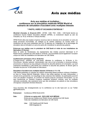 Avis aux médias Titre 1 Avis aux médias et invitation : conférence sur la simulation médicale HPSN World et scénario de simulation d’accident avec multiples blessés ~ PHOTO, VIDÉO ET OCCASION D'ENTREVUE ~ Montréal (Canada), le 26 janvier 2016 – (NYSE : CAE; TSX : CAE) – CAE Santé tiendra sa conférence Human Patient Simulation Network (HPSN), un événement réputé au sein de l'industrie, du 16 au 18 février à Tampa (Floride). HPSN World attire des leaders d’opinion reconnus dans le domaine de la simulation en soins de santé provenant d'universités, de collèges et de centres médicaux du monde entier. La conférence de trois jours présentera plus de 70 séances sur l'intégration de la technologie de simulation dans la formation en soins de santé afin d’améliorer la sécurité des patients. Entrevues aux médias avec le président de CAE Santé et visite de nos installations de fabrication (15 février) Dans le cadre de l'événement, les représentants des médias pourront interviewer le Dr Robert Amyot, président de CAE Santé le 15 février. Les journalistes auront également l’occasion unique de visiter les installations de fabrication de CAE Santé. Conférenciers principaux (16 au 18 février) Dr Robert Amyot, président de CAE Santé, débutera la conférence le 16 février à 9 h. Chris Broom, directeur général, Administration des vols et de la formation à American Airlines, prononcera un discours sur les pratiques entourant la sécurité aérienne et la formation, qui sont maintenant transférées à CAE Santé pour améliorer la sécurité des patients. M. Broom gère la formation de plus de 14 000 pilotes et instructeurs. Simulation d’accident avec multiples blessés (16 février à 11 h 15) CAE Santé présentera un scénario de collision automobile faisant plusieurs victimes à l'extérieur, en face du Tampa Marriott Waterside. Grâce à des effets spéciaux de style hollywoodien, y compris de la pyrotechnie, du maquillage et des costumes très réalistes, les participants pourront vivre une situation d'urgence, du moment de l’impact jusqu’au processus d'évacuation. La rue sera transformée en scénario d'urgence impliquant plusieurs victimes, avec de multiples véhicules accidentés, des explosions ainsi que des simulateurs de patients et des simulateurs chirurgicaux comportant diverses blessures. Vous trouverez des renseignements sur la conférence sur le site hpsn.com ou sur Twitter @HPSNWorld16. Événement : Conférence HPSN World 2016 Date : 15 février en après-midi : EXCLUSIF AUX MÉDIAS Entrevues aux médias avec Robert Amyot, président de CAE Santé Visite des installations de fabrication de CAE Santé Lieu : CAE Healthcare/CAE Santé 6300 Edgelake Dr. Sarasota, Floride, 34240 Du 16 au 18 février 2016 : Conférence HPSN Séance d'ouverture avec conférenciers principaux à 9 h – Les portes ouvrent à 8 h 45 Lieu : Tampa Marriott Waterside 700 South Florida Avenue Tampa, Floride, 33602 Si vous prévoyez participer, veuillez répondre à : Catherine Thibault [email protected] +1-514-340-5305 À propos de CAE Santé CAE Santé fournit des outils d’apprentissage de pointe aux étudiants et aux professionnels de la santé, ce qui leur permet de s’exercer sans risque à l’aide d’une plateforme de simulation avant de mettre en application leurs aptitudes sur des patients réels. La gamme complète de solutions de simulation de CAE Santé inclut la simulation chirurgicale et la simulation de l’échographie, les programmes, la plateforme audiovisuelle de gestion de centres LearningSpace et les simulateurs de patients (nourrisson, enfant et adulte) hautement réalistes. À l’heure actuelle, près de 9 000 simulateurs et solutions audiovisuelles de CAE Santé sont utilisés dans le monde par des écoles de médecine, des écoles de soins infirmiers, des hôpitaux, des forces de défense et d’autres entités. À propos de CAE CAE est un chef de file mondial en prestation de formation dans les domaines de l’aviation civile, de la défense et sécurité, et des soins de santé. Nous concevons et intégrons les solutions de formation les plus complètes de l’industrie, grâce aux connaissances et au savoir-faire de nos 8 000 employés, de nos technologies de simulation de renommée mondiale et de notre réputation en matière de service et d’innovation technologique s’échelonnant sur sept décennies. Notre présence mondiale est la plus vaste de l’industrie, avec 160 établissements et centres de formation situés dans 35 pays, y compris les activités de nos coentreprises, et le plus important parc de simulateurs de vol au monde. Chaque année, nous formons plus de 120 000 membres d’équipage civils et militaires, ainsi que des milliers de professionnels de la santé. www.cae.com Suivez-nous sur Twitter @CAE_Inc - 30 Personnes-ressources à CAE : Hélène V. Gagnon Vice-présidente, Affaires publiques et Communications mondiales 1-514-340-5536 [email protected] Catherine Thibault Chef de service, Communications mondiales +1-514-340-5305 [email protected]