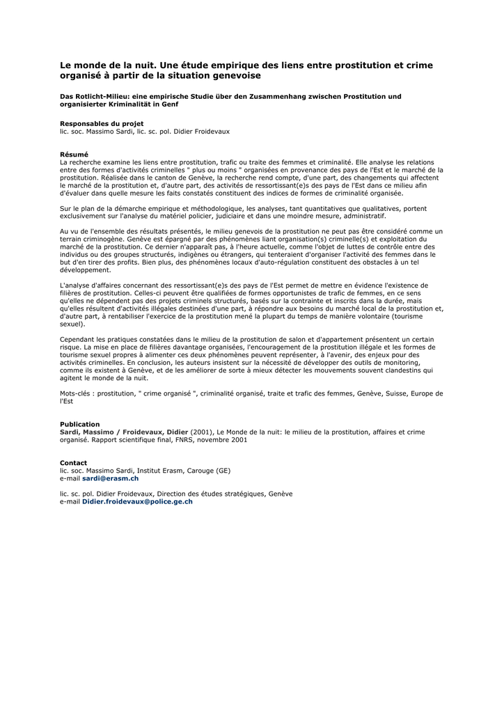 Le monde de la nuit. Une étude empirique des liens entre prostitution et crime organisé à partir de la situation genevoise Das Rotlicht-Milieu: eine empirische Studie über den Zusammenhang zwischen Prostitution und organisierter Kriminalität in Genf Responsables du projet lic. soc. Massimo Sardi, lic. sc. pol. Didier Froidevaux Résumé La recherche examine les liens entre prostitution, trafic ou traite des femmes et criminalité. Elle analyse les relations entre des formes d'activités criminelles " plus ou moins " organisées en provenance des pays de l'Est et le marché de la prostitution. Réalisée dans le canton de Genève, la recherche rend compte, d'une part, des changements qui affectent le marché de la prostitution et, d'autre part, des activités de ressortissant(e)s des pays de l'Est dans ce milieu afin d'évaluer dans quelle mesure les faits constatés constituent des indices de formes de criminalité organisée. Sur le plan de la démarche empirique et méthodologique, les analyses, tant quantitatives que qualitatives, portent exclusivement sur l'analyse du matériel policier, judiciaire et dans une moindre mesure, administratif. Au vu de l'ensemble des résultats présentés, le milieu genevois de la prostitution ne peut pas être considéré comme un terrain criminogène. Genève est épargné par des phénomènes liant organisation(s) criminelle(s) et exploitation du marché de la prostitution. Ce dernier n'apparaît pas, à l'heure actuelle, comme l'objet de luttes de contrôle entre des individus ou des groupes structurés, indigènes ou étrangers, qui tenteraient d'organiser l'activité des femmes dans le but d'en tirer des profits. Bien plus, des phénomènes locaux d'auto-régulation constituent des obstacles à un tel développement. L'analyse d'affaires concernant des ressortissant(e)s des pays de l'Est permet de mettre en évidence l'existence de filières de prostitution. Celles-ci peuvent être qualifiées de formes opportunistes de trafic de femmes, en ce sens qu'elles ne dépendent pas des projets criminels structurés, basés sur la contrainte et inscrits dans la durée, mais qu'elles résultent d'activités illégales destinées d'une part, à répondre aux besoins du marché local de la prostitution et, d'autre part, à rentabiliser l'exercice de la prostitution mené la plupart du temps de manière volontaire (tourisme sexuel). Cependant les pratiques constatées dans le milieu de la prostitution de salon et d'appartement présentent un certain risque. La mise en place de filières davantage organisées, l'encouragement de la prostitution illégale et les formes de tourisme sexuel propres à alimenter ces deux phénomènes peuvent représenter, à l'avenir, des enjeux pour des activités criminelles. En conclusion, les auteurs insistent sur la nécessité de développer des outils de monitoring, comme ils existent à Genève, et de les améliorer de sorte à mieux détecter les mouvements souvent clandestins qui agitent le monde de la nuit. Mots-clés : prostitution, " crime organisé ", criminalité organisé, traite et trafic des femmes, Genève, Suisse, Europe de l'Est Publication Sardi, Massimo / Froidevaux, Didier (2001), Le Monde de la nuit: le milieu de la prostitution, affaires et crime organisé. Rapport scientifique final, FNRS, novembre 2001 Contact lic. soc. Massimo Sardi, Institut Erasm, Carouge (GE) e-mail [email protected] lic. sc. pol. Didier Froidevaux, Direction des études stratégiques, Genève e-mail [email protected]