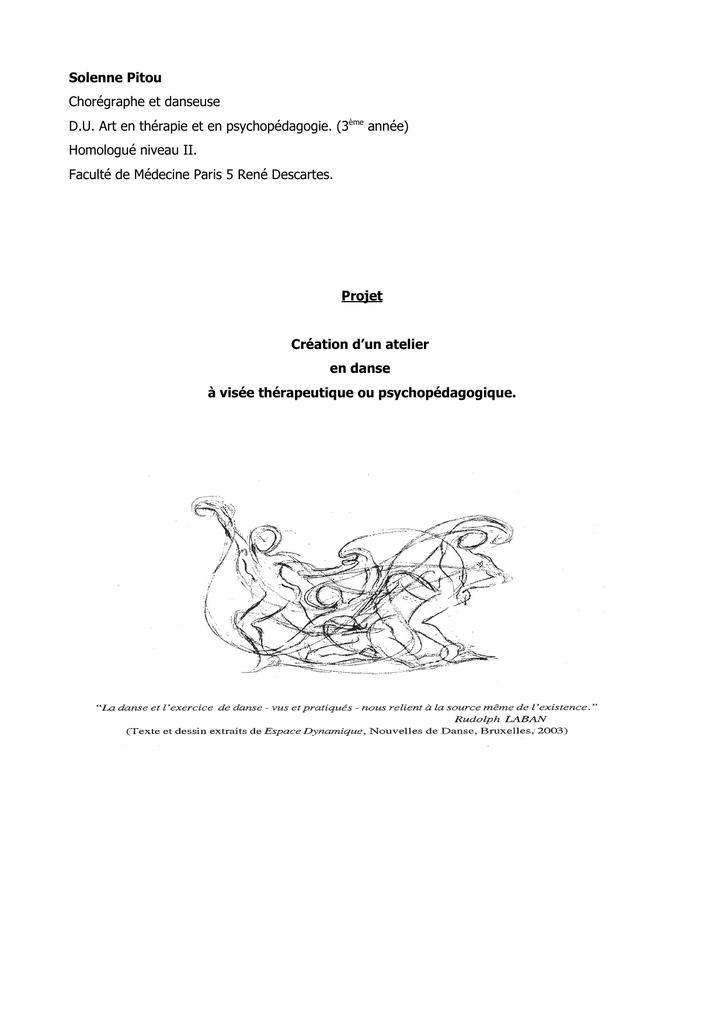 Solenne Pitou Chorégraphe et danseuse D.U. Art en thérapie et en psychopédagogie. (3ème année) Homologué niveau II. Faculté de Médecine Paris 5 René Descartes. Projet Création d’un atelier en danse à visée thérapeutique ou psychopédagogique. Sommaire 1 Introduction. 2 Objectifs spécifiques. 3 Déroulement de l’atelier. 3.1 Cadre. 3.2 Méthode et découpage. 3.3 Moyens nécessaires. 4 Indications thérapeutiques. 5 Transmissions ciblées à l’institution. 6 Conclusion. 1.Introduction. De nombreuses activités peuvent revendiquer des vertus thérapeutiques au regard des plus de quatre cents sortes de psychothérapies que nous pouvons recenser. Pourtant, on ne peut pas nier les effets positifs d’un atelier à médiation artistique tels que la danse, le théâtre, la musique ou les arts plastiques. Ce type d’atelier est un outil supplémentaire dans un processus psychothérapeutique, à condition d’établir, un solide cadre prédéfini, de choisir un dispositif approprié et de dégager des objectifs fiables, pertinents et cohérents. L’outil « danse» peut faire apparaître chez les participants une capacité de création et d’expression jusqu’alors discrète ou inconnue, à condition d’être stimulés d’une manière bien précise dans un solide cadre contenant. Ce projet a donc pour but de proposer dans un établissement relevant du secteur « clinique » ou « éducatif et social » un atelier psychothérapeutique ou pédagogique. en danse thérapie s’inscrivant dans un processus 2. Objectifs spécifiques. Les objectifs de ces ateliers dépendent bien entendu du public concerné, mais également de la demande venant de l'institution. Cependant, les objectifs cités ci-après me semblent être valables dans tous les cas: - Expérimenter un nouveau moyen d’expression. - Créer un lieu d’étayage et de support. - Donner un espace de « jeu » au sens propre, dans un cadre et avec des consignes précis. - Diminuer les tensions corporelles. - Développer une plus grande conscience corporelle. - Créer une dynamique de groupe indispensable à la pérennité de l’atelier. - Faire appel à des fonctions cognitives moins utilisées (mémoire, concentration, imagination). - Favoriser un processus de : Resocialisation des participants, dû à une activité de groupe. Restauration narcissique. Stimulation sensorielle et motrice. 3. Déroulement de l’atelier. 3.1 Cadre. Le nombre de participants se situe entre six et douze à chaque séance. Chaque séance se déroule sur une durée de deux heures entrecoupées d’une pause. La fréquence de cette activité dépend de la volonté des responsables de la structure. Cependant à moins d'une fois par semaine, l'efficacité thérapeutique ne pourra pas se mettre en place. Les groupes désirant participer aux séances seront formés au préalable avec l’équipe de prise en charge et devront rester les mêmes durant le nombre de séances prévues au préalable. Un minimum de 10 séances me semblent nécessaires pour pouvoir atteindre quelques objectifs et noter certains changements. Le cadre est censé être fermé, mais l’établissement a un droit évident de regard et de participation éventuelle aux ateliers. ( voir nécessaire en fonction des patients ) 3. Méthode et découpage. La méthode que j’utilise ne s’appuie pas sur une technique unique mais elle résulte de l’expérience que j’ai pu acquérir tout au long de mon parcours professionnel de danseuse, chorégraphe et pédagogue. Ma technique de départ est celle de la danse contemporaine, associée à la danse contact, au travail avec des objets, avec une grande part réservée à l'improvisation et au travail de composition. Voici une définition succinte de la danse contemporaine et de la danse contact: - La danse contact ou le contact improvisation est une danse improvisée dont la forme basique est le duo et qui résulte directement d'un « contact », synonyme d'échange de poids entre les partenaires. C'est Steve Paxton qui a développé le contact dans les années 70. Très ludique et parfois acrobatique la danse contact engage un corps à corps des danseurs. Il existe des éducatifs, mais aucune forme n'est jamais fixée. La danse contact est un excellent travail sur la vigilance et l'accordage tonique; elle constitue en outre un outil de choix pour travailler avec des personnes ayant très peu d'autonomie motrice. Je tiens à préciser ici qu'il existe beaucoup d'étapes intermédiaires avant de pouvoir réellement entrer en contact dont de nombreux exercices utilisant un objet . - Le terme de danse contemporaine est en usage dans les années 70 , et continue à être utilisé aujourd'hui. De manière rétroactive on nomme aussi de danse contemporaine les artistes de 1950 comme Cunningham, Nikolaïs.Cette danse contemporaine voit le jour en réaction à la danse moderne qui en voulant sortir des codes de la danse classique s'en est fabriquée de nouveaux. Les contemporains vont donc renoncer à la répétition du moderne, en excluant pas un éventuel retour au classique. Les contemporains vont s'intéresser au travail sur les limites du présentable, vont remettre en doute la forme elle même du spectacle, vont abandonner les certitudes ( il ne s'agit plus d'une danse militante). La danse contemporaine prône un comportement d’anomalie, une volonté de désordre apparent, un goût très fort pour le concept, et l' importance des nouvelles technologies. La gestuelle de la danse contemporaine ne répond pas à un code. Tout est à explorer, à trouver; il y a un véritable travail de recherche. Les gestes sont libres, même si aujourd'hui il existe des techniques de danse contemporaine. Avant de décrire plus précisemment une séance, je tiens à préciser ici qu'il ne s'agit nullement d'un cours où les patients apprendraient une technique; chaque patient sera amené à trouver sa propre danse. J'attache également beaucoup d'i