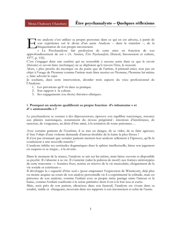 Mona Chahoury Charabaty Être psychanalyste – Quelques réflexions E tre analyste c’est utiliser sa propre personne dans ce qui en est advenu, à partir de son expérience sur le divan d’un autre Analyste – dans le transfert –, de la fréquentation de son propre inconscient. « Le Psychanalyste fait profession de cette mise en fonction de son approfondissement de soi » (A. Anzieu, Être Psychanalyste, Dunod, Inconscient et culture, 1977, p. 152). C’est s’engager dans une carrière qui ne ressemble à aucune autre dans ce que le savoir (théorie) et savoir-faire (technique) ne se déploient qu’à travers l’être, le ressenti. Alors, « plus proche du mystique ou du poète que de l’artiste, il prétend créer, non pas un objet à l’usage de l’homme comme l’artiste mais bien recréer en l’homme, l’homme lui-même », faire advenir le sujet. Je souhaite, dans cette intervention, aborder trois aspects du vécu professionnel de l’Analyste. 1. Les privations qu’il vit dans sa pratique. 2. Son rapport à la culture. 3. Ses engagements (ou choix) théorico-cliniques. I- Pourquoi un analyste qualifierait sa propre fonction d’« inhumaine » et d’ « antinaturelle » ? Le psychanalyste se soumet à des dépossessions, éprouve son équilibre narcissique, renonce aux plaisirs narcissiques, notamment du niveau prégénital : émotions d’intolérance, de rancœur, de vengeance, au désir d’être aimé, à la tentation de toute puissance… Avec certains patients de l’extrême, il se met en danger, de se vider, de se faire agresser, d ‘être l’objet d’une violente demande d’amour doublée de la haine la plus féroce ! Il n’est pas étonnant que certains patients mettent leur analyste tellement à l’épreuve, qu’ils le conduisent à une nouvelle tranche ! L’analyste inhibe ses certitudes dogmatiques dans la sphère intellectuelle, laisse son jugement en suspens et se risque... à la rêverie. Dans le moment de la séance, l’analyste se tait sur lui-même, mais laisse ouverte et disponible sa psyché. Il s’absente à sa vie. Il s’astreint (salut la pulsion de mort!) aux formes stéréotypées de cette rencontre : « horaires fixes, remise en réserve de la vie musculaire, éloignement de la vie sociale et extérieure ». Il développe la « capacité d’être seul » (pour emprunter l’expression de Winnicott), déjà plus ou moins acquise au cours de son analyse personnelle où il a expérimenté la solitude, mais en présence de son analyste, comme l’enfant avec sa propre mère partagé entre l’amour et la haine, comme l’enfant confronté à la scène primitive dont il est à la fois issu et exclu. Mais, assis près de son patient, silencieux dans son fauteuil, l’analyste est vivant dans sa totalité, stable et changeant, mouvant dans ses rapports à son inconscient et celui de l’autre. 1 Mona Chahoury Charabaty Être psychanalyste – Quelques réflexions L’analyste vit un paradoxe. Il va écouter, traduire et interpréter le matériel du patient sans réagir émotionnellement. En même temps, c’est uniquement à travers sa propre activité émotionnelle qu’il peut effectuer une interprétation et une traduction satisfaisante de ce matériel. Un mouvement d’introjection et de projection orienté vers le matériel fourni par le patient crée une situation équivalente à la relation entre l’artiste et le monde extérieur sur lequel il travaille. Tout comme l’artiste, l’analyste doit être capable de se laisser profondément toucher et déstabiliser, pour que surgissent (puisqu’elles s’improvisent) les paroles qui feront effet d’ouverture, de « vérité ». II- L’analyste et l’artiste Heureusement que le psychanalyste s’inscrit dans une filiation qui pour avoir commencé avec le père de la psychanalyse (Freud) n’en est pas moins dans la continuité des humanistes, philosophes, écrivains, artistes, qui à leur façon, ont été les pèlerins de la vérité, la leur, celle de l’homme et du monde. « Nous, les Psychanalystes, – dit Gérard Bonnet –, sommes des effets de culture, on pourrait même dire des perles de culture… » Le créateur de la psychanalyse a été l’infatigable « explorateur de la culture». Il disait que le travail de l’analyste consisterait à redécouvrir ce que les écrivains ou les artistes ont mis à jour. Il va loin en établissant une véritable analogie de structure entre le symptôme et l’œuvre d’art ; profitant de ce que lui offre le patrimoine des civilisations ( en particulier de la mythologie) pour déchiffrer et décoder les productions symptomatiques . D’ailleurs l’interprétation ne fait-elle pas meilleur effet de résonnance en usant de métaphores que lui offre un renvoi à la culture : « boite de Pandore », « complexe d’Hamlet », « d’ Othello »... ? Lacan à l’occasion d’un contrôle conseillait d’aller voir une pièce de théâtre qu’il estimait plus utile que ses propres commentaires. Mais, avec le temps, une culture se dégrade en références toutes faites, en maximes, obligations, que l’inconscient rigidifie encore plus – comment rester capable d’émotion esthétique ? Comment retrouver accès à l’objet esthétique ? G. Bonnet écrit : « si Freud est parvenu à brasser en lui autant de cultures différentes, ce n’est pas uniquement en raison du fait culturel lui-même, mais parce qu’il avait en lui une capacité de contemplation et de recherche acquise dans les premiers jours au contact de sa mère, Amalia qu’il n’a jamais cessé d’investir dans sa conquête des profondeurs ». Meltzer évoque le « conflit esthétique » dans l’impression indicible que l’enfant ressent en voyant le visage de sa mère. 2 Mona Chahoury Charabaty Être psychanalyste – Quelques réflexions L’accès à la culture commence dès nos premiers pas dans la vie, et l’objet esthétique n’est pas à découvrir, m