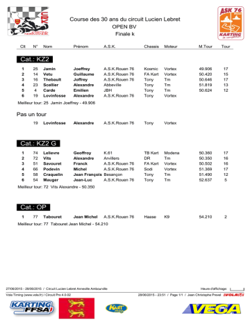 Course des 30 ans du circuit Lucien Lebret OPEN BV Finale k Clt N° Nom Prénom A.S.K. Chassis Moteur M.Tour Tour Joeffrey Guillaume Joffrey Alexandre Emilien Alexandre A.S.K.Rouen 76 A.S.K.Rouen 76 A.S.K.Rouen 76 Abbeville JBH A.S.K.Rouen 76 Kosmic FA Kart Tony Tony Tony Tony Vortex Vortex Tm Tm Tm Vortex 49.906 50.420 50.646 51.819 50.624 17 15 17 13 12 Alexandre A.S.K.Rouen 76 Tony Vortex Geoffroy Alexandre Franck Michel Jean François Jean-Luc K.61 Arvillers A.S.K.Rouen 76 A.S.K.Rouen 76 Besançon A.S.K.Rouen 76 TB Kart DR FA Kart Sodi Tony Tony Modena Tm Vortex Vortex Tm Tm 50.360 50.350 50.502 51.369 51.490 52.637 17 16 16 17 12 5 A.S.K.Rouen 76 Haase K9 54.210 2 Cat.: KZ2 1 2 3 4 5 6 25 14 16 23 4 19 Jamin Vetu Thebault Scellier Carde Lovinfosse Meilleur tour: 25 Jamin Joeffrey - 49.906 Pas un tour 19 Lovinfosse Cat.: KZ2 G 1 2 3 4 5 6 74 72 51 66 58 54 Lelievre Vits Savouret Podevin Craquelin Mauger Meilleur tour: 72 Vits Alexandre - 50.350 Cat.: OP 1 77 Tabouret Jean Michel Meilleur tour: 77 Tabouret Jean Michel - 54.210 27/06/2015 - 28/06/2015 / Circuit Lucien Lebret Anneville Ambourville Vola Timing (www.vola.fr) / Circuit Pro 4.0.02 Heure d'affichage: 28/06/2015 - 23:51 / Page 1/1 / Jean Christophe Prevel VolaSoftControlPdf