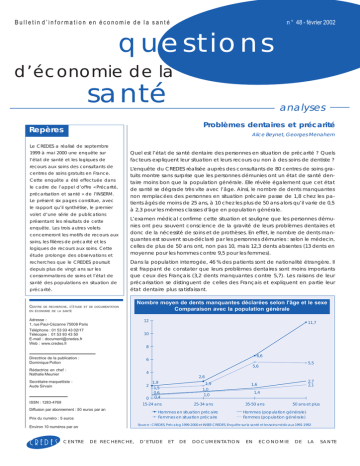 Bulletin d’information en économie de la santé n ° 48 - février 2002 questions d’économie de la santé analyses Problèmes dentaires et précarité Repères Alice Beynet, Georges Menahem Le CREDES a réalisé de septembre 1999 à mai 2000 une enquête sur l’état de santé et les logiques de recours aux soins des consultants de centres de soins gratuits en France. Cette enquête a été effectuée dans le cadre de l’appel d’offre « Précarité, précarisation et santé » de l’INSERM. Le présent six pages constitue, avec le rapport qu’il synthétise, le premier Quel est l’état de santé dentaire des personnes en situation de précarité ? Quels facteurs expliquent leur situation et leurs recours ou non à des soins de dentiste ? L'enquête du CREDES réalisée auprès des consultants de 80 centres de soins gratuits montre sans surprise que les personnes démunies ont un état de santé dentaire moins bon que la population générale. Elle révèle également que cet état de santé se dégrade très vite avec l’âge. Ainsi, le nombre de dents manquantes non remplacées des personnes en situation précaire passe de 1,8 chez les patients âgés de moins de 25 ans, à 10 chez les plus de 50 ans alors qu’il varie de 0,5 à 2,3 pour les mêmes classes d'âge en population générale. volet d’une série de publications présentant les résultats de cette enquête. Les trois autres volets concerneront les motifs de recours aux soins, les filières de précarité et les logiques de recours aux soins. Cette étude prolonge des observations et recherches que le CREDES poursuit depuis plus de vingt ans sur les consommations de soins et l’état de santé des populations en situation de précarité. CENTRE L’examen médical confirme cette situation et souligne que les personnes démunies ont peu souvent conscience de la gravité de leurs problèmes dentaires et donc de la nécessité de soins et de prothèses. En effet, le nombre de dents manquantes est souvent sous-déclaré par les personnes démunies : selon le médecin, celles de plus de 50 ans ont, non pas 10, mais 12,3 dents absentes (13 dents en moyenne pour les hommes contre 9,5 pour les femmes). Dans la population interrogée, 46 % des patients sont de nationalité étrangère. Il est frappant de constater que leurs problèmes dentaires sont moins importants que ceux des Français (3,2 dents manquantes contre 5,7). Les raisons de leur précarisation se distinguent de celles des Français et expliquent en partie leur état dentaire plus satisfaisant. DE RECHERCHE, D’ ÉTUDE ET DE DOCUMENTATION EN ÉCONOMIE DE LA SANTÉ Adresse : 1, rue Paul-Cézanne 75008 Paris Nombre moyen de dents manquantes déclarées selon l'âge et le sexe Comparaison avec la population générale 12 Téléphone : 01 53 93 43 02/17 Télécopie : 01 53 93 43 50 E-mail : [email protected] Web : www.credes.fr 11,7 10 8 6,6 Directrice de la publication : Dominique Polton 6 5,5 5,6 Rédactrice en chef : Nathalie Meunier 4 2,6 Secrétaire-maquettiste : Aude Sirvain 1,9 2 1,5 0,6 0 0,4 ISSN : 1283-4769 1,9 1,0 1,0 15-24 ans Diffusion par abonnement : 50 euros par an Prix du numéro : 5 euros 1,4 35-50 ans 50 ans et plus Hommes (population générale) Femmes (population générale) Source : CREDES, Précalog 1999-2000 et INSEE-CREDES, Enquête sur la santé et les soins médicaux 1991-1992 Environ 10 numéros par an CENTRE 25-34 ans Hommes en situation précaire Femmes en situation précaire 2,7 2,1 1,6 DE RECHERCHE, D’ETUDE ET DE D O C U M E N TAT I O N EN ECONOMIE DE LA SANTE Problèmes dentaires et précarité L’état de santé dentaire des personnes démunies se dégrade fortement avec l’âge Un nombre important de dents absentes Daprès notre enquête menée auprès des consultants de centres de soins gratuits (voir encadré ci-dessous), trois personnes sur quatre (76 %) déclarent avoir au moins une dent manquante non remplacée, soit deux fois plus souvent quen population générale, à structure dâge et de sexe égale. Si avant 25 ans, les personnes démunies nont que 1,3 dent absente de plus que la moyenne de la population, lécart augmente vite avec lâge : 4,8 dents en moyenne de 35 à 50 ans, et 7,7 dents après 50 ans. Lexamen du médecin permet de constater que les patients sous-estiment dautant 2 plus le nombre de leurs dents manquan- dau moins un traitement de caries ou tes quils sont âgés. dautres soins dentaires courants et, pour deux personnes examinées sur cinq Parmi les consultants, les hommes dé- (43 %), le médecin juge nécessaire la clarent en moyenne plus de dents man- mise en place dune prothèse dentaire quantes non remplacées que les femmes ou dun appareil (voir graphique p. 3). (5 contre 3,7 soit 36 % de plus). Mais Au total, un patient sur trois a besoin à cet écart se réduit quand nous prenons la fois de soins dentaires et de prothèen compte les observations du méde- ses, nécessité qui croît avec lâge : de cin. Selon lexamen médical, il manque 26 % pour les moins de 35 ans à 37 % 5,2 dents aux hommes contre 4,6 aux pour les plus de 44 ans. femmes. Ainsi, plus les femmes sont jeunes, plus elles semblent avoir de réti- Une première conclusion importante cence à parler de leurs dents absentes. découle de cet examen proposé à tous les consultants. Parmi eux, moins de 6 % seulement ont déclaré être venus au Un besoin de soins dentaires centre pour un problème de dents. Ainsi, jugé important par le médecin les usagers des centres de soins gratuits mais souvent ignoré par ne semblent pas considérer comme le patient prioritaire la nécessité de soigner leurs Lexamen dentaire effectué par le mé- dents. Cest une des raisons expliquant decin révèle un besoin de soins dentai- la faiblesse de leur recours au dentiste res pour plus de sept consultants sur dix et donc laggravation de leurs problè(72 %). Trois sur cinq (62 %) ont besoin mes dentaires. Source des données : l’enquêt