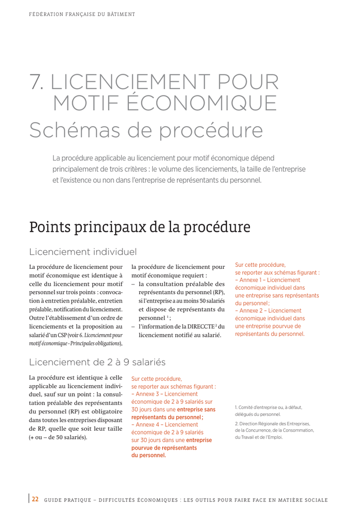 FÉDÉRATION FRANÇAISE DU BÂTIMENT 7. LICENCIEMENT POUR MOTIF ÉCONOMIQUE Schémas de procédure La procédure applicable au licenciement pour motif économique dépend principalement de trois critères : le volume des licenciements, la taille de l’entreprise et l’existence ou non dans l’entreprise de représentants du personnel. Points principaux de la procédure Licenciement individuel La procédure de licenciement pour motif économique est identique à celle du licenciement pour motif personnel sur trois points : convocation à entretien préalable, entretien préalable, notification du licenciement. Outre l’établissement d’un ordre de licenciements et la proposition au salarié d’un CSP (voir 6. Licenciement pour motif économique - Principales obligations), la procédure de licenciement pour motif économique requiert : – la consultation préalable des représentants du personnel (RP), si l’entreprise a au moins 50 salariés et dispose de représentants du personnel 1 ; – l’information de la DIRECCTE 2 du licenciement notifié au salarié. Sur cette procédure, se reporter aux schémas figurant : – Annexe 1 – Licenciement économique individuel dans une entreprise sans représentants du personnel; – Annexe 2 – Licenciement économique individuel dans une entreprise pourvue de représentants du personnel. Licenciement de 2 à 9 salariés La procédure est identique à celle applicable au licenciement individuel, sauf sur un point : la consultation préalable des représentants du personnel (RP) est obligatoire dans toutes les entreprises disposant de RP, quelle que soit leur taille (+ ou – de 50 salariés). Sur cette procédure, se reporter aux schémas figurant : – Annexe 3 – Licenciement économique de 2 à 9 salariés sur 30 jours dans une entreprise sans représentants du personnel; – Annexe 4 – Licenciement économique de 2 à 9 salariés sur 30 jours dans une entreprise pourvue de représentants du personnel. 1. Comité d’entreprise ou, à défaut, délégués du personnel. 2. Direction Régionale des Entreprises, de la Concurrence, de la Consommation, du Travail et de l’Emploi. 22 guide pratique – difficultés économiques : les outils pour faire face en matière sociale FÉDÉRATION FRANÇAISE DU BÂTIMENT Licenciement d’au moins 10 salariés Compte tenu de l’importance du nombre de licenciements envisagés, la loi a institué une procédure plus contraignante pour les entreprises (on parle de procédure « lourde » de licenciement pour motif économique). En premier lieu, les entreprises de 50 salariés et plus sont tenues d’élaborer un plan de sauvegarde de l’emploi (PSE, ex-plan social) destiné notamment à faciliter le reclassement des salariés dont la réinsertion professionnelle est jugée difficile. Par ailleurs, la consultation des représentants du personnel sur le projet de licenciements est doublée, voire triplée (lorsqu’un expert-comptable est désigné par les RP dans les entreprises de 50 salariés et plus). Enfin, il y a lieu de notifier à la DIRECCTE le projet de licenciement pour motif économique (intégrant le PSE) en amont, c’est-à-dire avant la notification aux salariés de leur licenciement. Sur la procédure applicable, selon le cas, se reporter aux schémas figurant : – Annexe 5 – Licenciement économique d’au moins 10 salariés sur 30 jours dans une entreprise de moins de 50 salariés sans délégués du personnel; – Annexe 6 – Licenciement économique d’au moins 10 salariés sur 30 jours dans une entreprise de moins de 50 salariés pourvue de délégués du personnel; – Annexe 7 – Licenciement économique d’au moins 10 salariés sur 30 jours dans une entreprise de 50 salariés et plus sans représentants du personnel; – Annexe 8 – Licenciement économique d’au moins 10 salariés sur 30 jours dans une entreprise de 50 salariés et plus pourvue de représentants du personnel; – Annexe 9 – Licenciement économique d’au moins 10 salariés sur 30 jours dans une entreprise de 50 salariés et plus pourvue de représentants du personnel (avec désignation par les RP d’un expert-comptable). Détermination de la procédure applicable (entreprise de 50 salariés et plus) Le licenciement d’au moins 10 salariés déclenche la procédure dite « lourde » de licenciement pour motif économique. Il convient d’apprécier ce nombre (10) sur une même période de 30 jours. Toutefois, d’autres périodes d’appréciation (trimestrielle et annuelle) sont prévues pour les entreprises d’au moins 50 salariés. Succession de licenciements collectifs sur une période de trois mois Lorsqu’une entreprise de 50 salariés et plus a procédé pendant trois mois consécutifs à des licenciements pour motif économique de plus de 10 personnes au total, sans atteindre 10 personnes dans une même période de 30 jours, tout nouveau licenciement envisagé au cours des trois mois suivants est soumis à la procédure de licenciement d’au moins 10 salariés sur 30 jours (avec PSE). Exemple – 5 licenciements sont notifiés le 15 mai 2012. – 5 licenciements sont notifiés le 21 juin 2012. – 5 licenciements sont notifiés le 26 juillet 2012. Un licenciement est envisagé le 15 septembre 2012 : l’employeur est tenu d’appliquer la procédure de licenciement économique d’au moins dix salariés sur 30 jours. guide pratique – difficultés économiques : les outils pour faire face en matière sociale 23 FÉDÉRATION FRANÇAISE DU BÂTIMENT Succession de plus de 18 licenciements au cours d’une même année Lorsque plus de 18 licenciements pour motif économique sont prononcés dans une entreprise de 50 salariés et plus au cours d’une année civile, sans avoir à présenter un plan de sauvegarde de l’emploi (PSE), tout nouveau licenciement envisagé au cours des trois premiers mois de l’année civile suivante sera soumis à la procédure de licenciement économique