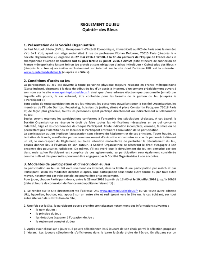 REGLEMENTDUJEU Quinté+desBleus 1.PrésentationdelaSociétéOrganisatrice LePariMutuelUrbain(PMU),Groupementd’IntérêtEconomique,immatriculéauRCSdeParissouslenuméro 775 671 258, ayant son siège social situé 2 rue du professeur Florian Delbarre, 75015 Paris (ci-après la « SociétéOrganisatrice»),organisedu27mai2016à12h00,àlafinduparcoursdel’EquipedeFrancedansle championnatd’Europedefootballsoitauplustardle10juillet2016à20h59(dateetheuredeconnexionde Francemétropolitainefaisantfoi)unjeugratuitetsansobligationd’achatintituléJeu«QuintéplusdesBleus» (ci-après le « Jeu ») accessible exclusivement sur internet sur le site dont l’adresse URL est la suivante : www.quinteplusdesbleus.fr(ci-aprèsle«Site»). 2.Conditionsd’accèsauJeu La participation au Jeu est ouverte à toute personne physique majeure résidant en France métropolitaine (Corseincluse),disposantàladatedudébutduJeud'unaccèsàInternet,d’uncomptepréalablementouvertà son nom sur le site www.quinteplusdesbleus.fr ainsi que d'une adresse électronique personnelle (email) par laquelle elle pourra, le cas échéant, être contactée pour les besoins de la gestion du Jeu (ci-après le «Participant»). SontexclusdetouteparticipationauJeulesmineurs,lespersonnestravaillantpourlaSociétéOrganisatrice,les membresdel’EtudeDarricauPecastaing,huissiersdejustice,située4placeConstantinPecqueur75018Paris et,defaçonplusgénérale,touteslespersonnesayantparticipédirectementouindirectementàl’élaboration duJeu. Seules seront retenues les participations conformes à l’ensemble des stipulations ci-dessus. A cet égard, la Société Organisatrice se réserve le droit de faire toutes les vérifications nécessaires en ce qui concerne l’identité́,l’âgeetlescoordonnéesdechaqueParticipant.Touteindicationincomplète,erronée,falsifiéeoune permettantpasd’identifieroudelocaliserleParticipantentraîneral’annulationdesaparticipation. LaparticipationauJeuimpliquel’acceptationsansréserveduRèglementetdesesprincipes.Toutefraude,ou tentativedefraude,manifestéeparuncommencementd’exécutionetcommiseenvuedepercevoirindûment un lot, le non-respect du Règlement, ou toute intention malveillante de perturber le déroulement du Jeu, pourra donner lieu à l’éviction de son auteur, la Société Organisatrice se réservant le droit d’engager à son encontre des poursuites judiciaires. De même, s’il estavéré que le déroulement du Jeu est perturbé par des tiers, mais qu’un Participant est complice de ces agissements, sa participation sera également considérée commenulleetdespoursuitespourrontêtreengagéesparlaSociétéOrganisatriceàsonencontre. 3.Modalitésdeparticipationetd’inscriptionauJeu La participation au Jeu se fait exclusivement via internet, dans la limite d’une participation par match et par Participant,selonlesmodalitésdécritesci-après.Uneparticipationsoustouteautreformeoupartoutautre moyen,notammentparvoiepostale,nepourraêtrepriseencompte. Pourjouer,chaqueParticipantdevra,entrele23mai2016àpartirde12h00etle10juillet2016jusqu’à20h59 (dateetheuredeconnexiondeFrancemétropolitainefaisantfoi): 1. Se rendre sur le Site directement via l’adresse URL www.quinteplusdesbleus.fr ou via toute autre adresse URL, hyperlien, bouton, etc. apposé sur un autre site et redirigeant vers le Site ou, le cas échéant, sur tout autresitewebdesubstitutionduSite; 2.UnefoissurleSite,leparticipantpourraprendreconnaissancenotammentdesinformationssuivantes: • lenomduJeu; • leprincipedujeu; • lesdotationsàgagneràl’occasionduJeu; • lerèglementcompletduJeu 3.Aprèsavoircliquésur«jouer»,ilpourrasélectionnerles5joueursdesonchoixparmilasélectionproposée à l’écran. Les joueurs sélectionnés s’afficheront dans la barre latérale droite de l’écran. En cliquant sur un joueur,ilpourraconsulterunefichederenseignementdujoueurindiquant,pourchaquejoueurdelasélection nationale:sonétatdeforme,sacote,sanotecalculéesurlabasedes2dernièresnotationsattribuéesparla RédactiondesSportsdeRMCetunavissurlejoueurdonnéparl’AgenceRMCSport.. 4.Aprèsavoircliquésurlebouton«Valider»situéenbasdanslabarrelatéraledroite,leQuinté+desBleus seraenregistré. 5. Il accédera à un écran récapitulatif du Quinté+ des Bleus sélectionné, afin de confirmer son choix ou de reveniràl’étapeprécédentedesélection. 6.Aprèsavoircliquésur«Confirmer»,ilnepourraplusreveniràl’étapeprécédenteetlechoixseraenregistré. 7.UnefoissonQuinté+desBleusconfirmé,ildevras’inscrireencomplétantleformulaired’inscriptionauJeu. Tousleschampssuivantssontobligatoiresafindepouvoirenregistrerlaparticipation: • Nom; • Prénom; • Né(e)le; • Adressemail; • Motdepasse&confirmer • Téléphone; 8. Cocher, à la fin du formulaire d’inscription, la case suivante : « J’accepte le règlement et les conditions généralesd’utilisation»; 9.Cocher,s’illesouhaitelescasessuivantes: • «JesuisparieurPMU» • «JesouhaiterecevoirlesinformationsdeRMC» • «Jesouhaiteêtreinformé(e)desjeuxconcoursPMUetrecevoirlaNewsletterClubHousePMU» 10.Cliquersurlebouton«Valider»figurantàlafinduformulaired’inscriptionpourquesaparticipationsoit définitivementvalidéeetacceptéeparlaSociétéOrganisatrice.LeParticipantobtiendraalorsconfirmationque son inscription a bien été enregistrée en voyant s’afficher le message suivant : « Votre Quinté + des Bleus a bienétéenregistré»;sisoninscriptionnepouvaitêtrepriseencompteenl’étatparlaSociétéOrganisatrice auvudeschampsrenseignéset/oudeschampslaissésvierges,ilenseraalorsinforméparl’affichagedel’un et/oul’autredesmessagessuivants: • «E-mailnonvalide» • «Motdepassetropcourt» • «Motdepassedifférent» • «Datedenaissancenonvalide» • «Téléphonenonvalide» • «E-maildéjàutilisé» 4.Modalitésdejeu Lors de chaque match international de l’Equipe de France de football (ci-après le « Match»), soit 9 Matchs maxim