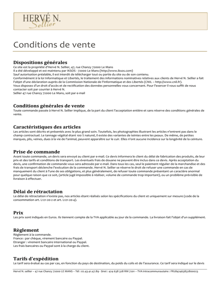 Toute commande passée { Hervé N. Sellier implique, de la part du client l’acceptation entière et sans réserve des conditions générales de