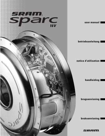 user manual 16 V betriebsanleitung notice d’utilisation handleiding brugsanvisning bruksanvisning Sparc · July 2004 These instructions contain important information on your Sparc system. Cycling with Sparc is easy. It’s true. It may surprise you just how many features your Sparc system has. To make the best possible use of your Sparc please take the time to read these operating instructions carefully. Your Sparc system is almost maintenance-free. Should you have any queries that are not answered in these operating instructions, your qualified bicycle specialist will be pleased to help you. Have a nice time and enjoy ”sparcing”. Please take particular note of the following: Precautionary measures, which protect from possible accident, injury or danger to life, or which prevent possible damage to the bicycle. Special advice to assist in the better handling of the operation, control and adjustment procedures. © Copyright SRAM Corporation 2004 Publ. No. 5203 E/D/F/Nl/Dk/Sv Information may be enhanced without prior notice. Released July 2004 SRAM Technical Documentation Schweinfurt/Germany 2 Sparc · July 2004 CONTENTS E THE SPARC SYSTEM 4 O P E R AT I O N 6 MAINTENANCE AND CARE » Battery 8 » Adjust gears 10 » Remove and fit rear wheel 10 » Wear parts 10 » Cleaning / Repair work 11 T E C H N I C A L D ATA 12 Sparc · July 2004 3 T H E S PA R C S Y S T E M W H AT I S S PA R C 1 6 V RANGE No matter whether you encounter headwinds, rain or hills, with Sparc as your backup you will always have the upper hand. Sparc, the new light electric drive with TwinDrive, gives you that extra boost whenever you need it. Depending on the mode selected, Sparc allows a range of action of 25 – 40 km (15 – 25 miles). This means increased mobility with little effort. Sparc was designed and built to make life easier and more pleasant for cyclists. Sparc is a solution that does not change the character of the bicycle – its light weight, features, simple maintenance and comfort ideally complement modern lifestyles. Its user-friendliness and superior help function make Sparc the No. 1 product on the market. The range achieved by a single battery charge depends on various factors. These include drive mode, the condition of the battery, the road conditions and particularly the cyclist’s own effort. Range SPEED mode up to 25 km up to 40 km ECON mode O P E R AT I N G P R I N C I P L E Sparc allows cyclists to choose between two supplementary drive options. By simply pressing a button on the control unit mounted on the handlebars, you can toggle between the fast SPEED mode and the ECON mode, which offers increased range. Average speed 20 km/h in the plain using a 28-inch wheel and assuming 75-watt input by the rider. (US version: SPEED = 15 miles, ECON = 25 miles) Motor drive 25 km/h SPEED mode ECON mode 20 km/h US version: SPEED = 20 mph, ECON = 16 mph 4 Sparc · July 2004 T H E S PA R C S Y S T E M E 5-gear hub with electric drive TwinDrive system, 200 Watt, allows effective use of energy. 5-gear twist-grip Changing gears is convenient and requires little effort. Handling is simple and intuitive. Sparc control unit All control functions are integrated into one unit with a switch for OFF, ECON and SPEED mode. Battery box 16 V Excellent performance, simple to use, no memory effect, Battery NiMH, 16,8 Volt, 8 Ah. Sparc · July 2004 Charger 16 V Charge time 4.5 hours, light indicates charging in progress. 5 O P E R AT I O N 1 Off The bicycle can be ridden with or without the help of the electric drive. Riding without the help of your Sparc is like riding any ordinary bike and requires no extra effort. Ec on Spe ed When the system is switched on, you start off as usual. The electric drive actively supports you whilst you pedal. » ECON mode works up to a speed of approx. 20 km/h (US version 16 mph). » SPEED mode works up to a speed of approx. 25 km/h (US version 20 mph). Off Once these speeds are reached, the electric drive switches off and you continue under your own muscle power. Reducing speed causes the system to come on again. Ec on Spe ed Please charge the battery before your first trip. 2 In SPEED mode the red light gleams. 2 Off Set the mode required, ECON or SPEED. The system only becomes active once the bicycle moves. 1 Ec on Spe ed The condition of the battery is indicated by 3 green lights. 6 Sparc · July 2004 O P E R AT I O N When only 1 green light gleams, the battery needs to be recharged. E 3 S TA N D B Y M O D E Your Sparc system has an energy saving feature. Approximately 1 minute after you stop using the system it will automatically switch off and the lights on the control unit will go out. When you continue, the electronic system will automatically come on again. 3 5-GEARSHIFTING A 5-gear hub shift is integrated into the Sparc system. You shift gears by turning the right twist-grip on the handlebars through positions 1 to 5. » Whilst shifting gear continue pedalling without exerting force. » If the desired gear does not engage immediately, briefly stop pedalling. » When approaching inclines shift down in good time. » You can also shift gears when the bike has stopped. Sparc · July 2004 Your Sparc bicycle is not for children! » Only switch on the Sparc system when you want to travel on your bicycle. » Always switch off the Sparc system before you stand your bicycle upside down or hang it up, also before you carry out cleaning or maintenance work. 7 MAINTENANCE AND CARE B AT T E R Y C H A R G I N G T H E B AT T E R Y You can either charge the battery whilst it is attached to the bicycle or you can remove the battery box to enable you to recharge it at home. » Insert the plug of the charger into the socket of the battery box. » Insert the charger into an electric mains socket. The LED will glow during charging, changing to green when the battery is fully recharged. Yellow – Battery is not connected or battery test stage Red – Battery charge process Green with Red – Char