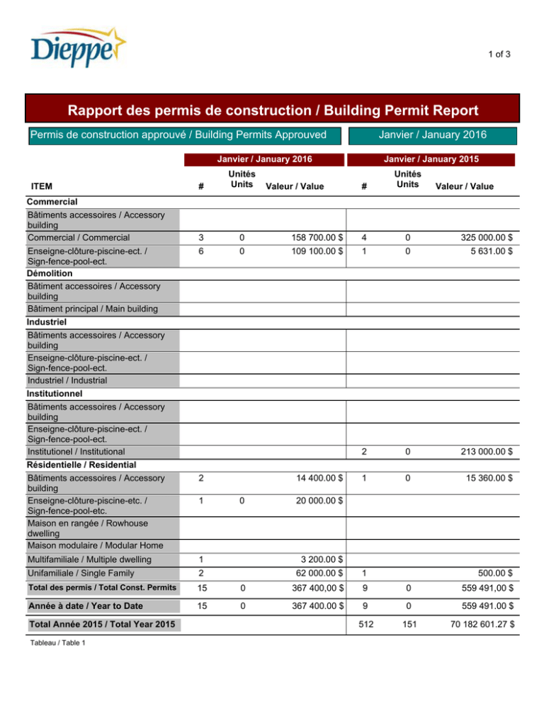1 of 3 Rapport des permis de construction / Building Permit Report Permis de construction approuvé / Building Permits Approuved Janvier / January 2016 Janvier / January 2016 ITEM Commercial Bâtiments accessoires / Accessory building Commercial / Commercial Enseigne-clôture-piscine-ect. / Sign-fence-pool-ect. Démolition Bâtiment accessoires / Accessory building Bâtiment principal / Main building # Unités Units 3 0 6 0 Janvier / January 2015 # Unités Units 158 700.00 $ 4 0 325 000.00 $ 109 100.00 $ 1 0 5 631.00 $ 2 0 213 000.00 $ 1 0 15 360.00 $ Valeur / Value Valeur / Value Industriel Bâtiments accessoires / Accessory building Enseigne-clôture-piscine-ect. / Sign-fence-pool-ect. Industriel / Industrial Institutionnel Bâtiments accessoires / Accessory building Enseigne-clôture-piscine-ect. / Sign-fence-pool-ect. Institutionel / Institutional Résidentielle / Residential Bâtiments accessoires / Accessory building Enseigne-clôture-piscine-etc. / Sign-fence-pool-etc. Maison en rangée / Rowhouse dwelling Maison modulaire / Modular Home 2 1 14 400.00 $ 0 20 000.00 $ Multifamiliale / Multiple dwelling 1 3 200.00 $ Unifamiliale / Single Family 2 62 000.00 $ 1 Total des permis / Total Const. Permits 15 0 367 400,00 $ 9 0 559 491,00 $ Année à date / Year to Date 15 0 367 400.00 $ 9 0 559 491.00 $ 512 151 Total Année 2015 / Total Year 2015 Tableau / Table 1 500.00 $ 70 182 601.27 $ 2 of 3 Rapport des permis de construction / Building Permit Report Janvier / January 2016 Janvier / January 2016 ITEM Commercial # Unités Units 9 0 6 0 Année / Year to Date # Unités Units 267 800.00 $ 9 0 267 800.00 $ 99 600.00 $ 6 0 99 600.00 $ Valeur / Value Valeur / Value Démolition Industriel Institutionnel Résidentielle / Residential Tableau / Table 2 État Comparatif des Quinze Dernières Années / Fifteen-Year Comparative Statement Janvier / January 2016 # Unités Units Janvier / January 2001 21 9 Janvier / January 2002 13 Janvier / January 2003 Année / Year to Date # Unités Units 3 333 900.00 $ 21 9 3 333 900.00 $ 8 536 740.00 $ 13 8 536 740.00 $ 20 7 1 400 600.00 $ 20 7 1 400 600.00 $ Janvier / January 2004 17 11 701 395.00 $ 17 11 701 395.00 $ Janvier / January 2005 6 0 465 499.99 $ 6 0 465 499.99 $ Janvier / January 2006 10 1 661 500.00 $ 10 1 661 500.00 $ Janvier / January 2007 25 8 1 367 540.00 $ 25 8 1 367 540.00 $ Janvier / January 2008 18 4 10 559 259.00 $ 18 4 10 559 259.00 $ Janvier / January 2009 9 6 1 200 536.15 $ 9 6 1 200 536.15 $ Janvier / January 2010 11 4 613 384.00 $ 11 4 613 384.00 $ Janvier / January 2011 17 0 786 212.00 $ 17 0 786 212.00 $ Janvier / January 2012 20 3 2 428 183.00 $ 20 3 2 428 183.00 $ Janvier / January 2013 20 1 6 994 653.00 $ 20 1 6 994 653.00 $ Janvier / January 2014 8 1 1 018 775.00 $ 8 1 1 018 775.00 $ Janvier / January 2015 9 0 559 491.00 $ 9 0 559 491.00 $ Janvier / January 2016 15 0 367 400.00 $ 15 0 367 400.00 $ Mois & Année / Month & Year Tableau / Table 3 Valeur / Value Valeur / Value 3 of 3 Rapport des constructions par unités créées Construction année 2016 Tableau / Table 4 Total final pour l'année: 0 Rapport des constructions par unités créées Construction année 2015 Bâtiments accessoires / Accessory building Commercial / Commercial Maison modulaire / Modular Home Multifamiliale / Multiple dwelling Février Unifamiliale / Single Family 1 Mars 1 Avril 1 2 5 Mai 11 48 10 2 4 1 2 11 4 7 2 2 4 16 Juin 1 2 Juillet 1 Août 3 Septembre 2 Octobre 1 3 Novembre Total unités 4 1 7 20 66 Tableau / Table 5 Total final pour l'année: 151 57