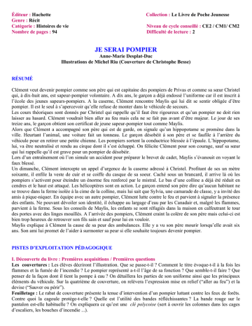 Éditeur : Hachette Genre : Récit Catégorie : Histoires de vie Nombre de pages : 94 Collection : Le Livre de Poche Jeunesse Niveau de cycle conseillé : CE2 / CM1/ CM2 Difficulté de lecture : 2 JE SERAI POMPIER Anne-Marie Desplat-Duc Illustrations de Michel Riu (Couverture de Christophe Besse) RÉSUMÉ Clément veut devenir pompier comme son père qui est capitaine des pompiers de Privas et comme sa sœur Christel qui, à dix-huit ans, est sapeur-pompier volontaire. A dix ans, le garçon a déjà endossé l’uniforme car il est inscrit à l’école des jeunes sapeurs-pompiers. A la caserne, Clément rencontre Maylis qui lui dit se sentir obligée d’être pompier. Il est le seul à s’apercevoir qu’elle refuse de monter dans le véhicule de secours. Les cours théoriques sont donnés par Christel qui rappelle qu’il faut être rigoureux et qu’un pompier ne doit rien laisser au hasard. Clément voudrait bien aller au feu mais cela ne se fait pas avant d’être majeur. Le jour de ses treize ans, le garçon obtient son certificat de jeune sapeur-pompier tout comme Maylis. Alors que Clément a accompagné son père qui est de garde, on signale qu’un hippopotame se promène dans la ville. Heurtant l’animal, une voiture fait un tonneau. Le garçon désobéit à son père et se faufile à l’arrière du véhicule pour en retirer une petite chienne. Les pompiers sortent la conductrice blessée à l’épaule. L’hippopotame, lui, va être neutralisé et rendu au cirque dont il s’est échappé. On félicite Clément pour son courage, sauf sa sœur qui lui rappelle qu’il est grave pour un pompier de désobéir. Lors d’un entraînement où l’on simule un accident pour préparer le brevet de cadet, Maylis s’évanouit en voyant le faux blessé. Un dimanche, Clément intercepte un appel d’urgence de la caserne adressé à Christel. Profitant de ses un mètre soixante, il enfile la veste de cuir et se coiffe du casque de sa soeur. Caché sous un brancard, il arrive là où les pompiers s’activent pour éteindre un énorme feu renforcé par le mistral. Le bas d’une colline a déjà été réduit en cendres et le haut est attaqué. Les hélicoptères sont en action. Le garçon entend son père dire qu’aucun habitant ne se trouve dans la ferme isolée à la cime de la colline, mais lui sait que Sylvia, une camarade de classe, y a invité des amis à pique-niquer. En équipe avec un autre pompier, Clément lutte contre le feu et parvient à signaler la présence des enfants. Ne pouvant dévoiler son identité, il échappe au largage d’eau par les Canadair et, malgré les flammes, parvient à la ferme. Sous les conseils de Maylis, les enfants se sont réfugiés dans la maison en calfeutrant le tour des portes avec des linges mouillés. A l’arrivée des pompiers, Clément craint la colère de son père mais celui-ci est bien trop heureux de retrouver son fils sain et sauf pour lui en vouloir. Maylis explique à Clément la cause de sa peur des ambulances. Elle y a vu son père mourir lorsqu’elle avait six ans. Son ami lui promet de l’aider à surmonter sa peur si elle souhaite toujours devenir pompier. PISTES D’EXPLOITATION PÉDAGOGIQUE I. Découverte du livre : Premières acquisitions / Premières questions Les couvertures : Les élèves décriront l’illustration. Que se passe-t-il ? Comment le titre évoque-t-il à la fois les flammes et la fumée de l’incendie ? Le pompier représenté a-t-il l’âge de sa fonction ? Que semble-t-il faire ? Que penser de la façon dont il tient la pompe à eau ? On détaillera les parties de son uniforme ainsi que les principaux éléments du véhicule. Sur la quatrième de couverture, on relèvera l’expression mise en relief (“aller au feu”) et la devise (“Sauver ou périr”). Feuilletage : Le rabat de couverture présente la tenue d’intervention d’un pompier luttant contre les feux de forêts. Contre quoi la cagoule protège-t-elle ? Quelle est l’utilité des bandes réfléchissantes ? La bande rouge sur le pantalon est-elle habituelle ? On expliquera ce qu’est une clé polycoise (sert à ouvrir les colonnes dans les cages d’escaliers, les bouches d’incendie ...). En observant les illustrations pleine page à l’intérieur de chaque chapitre, peut-on imaginer quelques épisodes du récit ? II. Premières lectures / Découverte du texte / Sensibilisation aux thèmes En cours de lecture : Dès la première page du livre, on apprend que le père du héros est capitaine des pompiers à Privas. En situant cette ville sur la carte, on établira le lien avec la région où est née l’auteure. On relèvera, au fur et à mesure de la lecture, les sigles cités et leur signification : J.S.P. p.10, F.P.T. V.S.R. V.R.M. É.P.A. V.S.A.B. p. 13, C.T.A. p.19, etc. Suffit-il d’être attiré par le sport pour devenir sapeur-pompier ? Est-il compréhensible que Vincent et Hugues aient raté leur examen (p. 17) ? Comment les enfants qui vont passer leur brevet de cadet sont-ils entraînés à réagir dans le cas d’un passager bloqué dans sa voiture (pp. 40 à 44) ? Quels gestes doivent-ils effectuer (noyer le moteur, parler au blessé…), quel matériel est indispensable (trousse de premiers secours, écarteur, cisaille…), quels renseignements sont à fournir à l’hôpital… ? De quelle façon Clément a-t-il appris comment se passe une intervention sur feu de forêt (p. 50) ? N’y-a-t-il que la pratique qui soit enseignée pour devenir pompier (p.15) ? Échanges / Argumentation et Débats : Les lecteurs seront sensibilisés au fait que sans esprit d’équipe et sans discipline, il n’y a pas de sauvetage possible. Christel a-t-elle raison de rappeler à son frère que désobéir pour un pompier est un acte grave (p. 40) ? Quelle faute fait-elle à son tour (p. 48) ? Pourquoi Clément est-il honteux de n’avoir pas vu qu’un arbre allait s’abattre (p. 61) ? On commentera les paroles du père du g