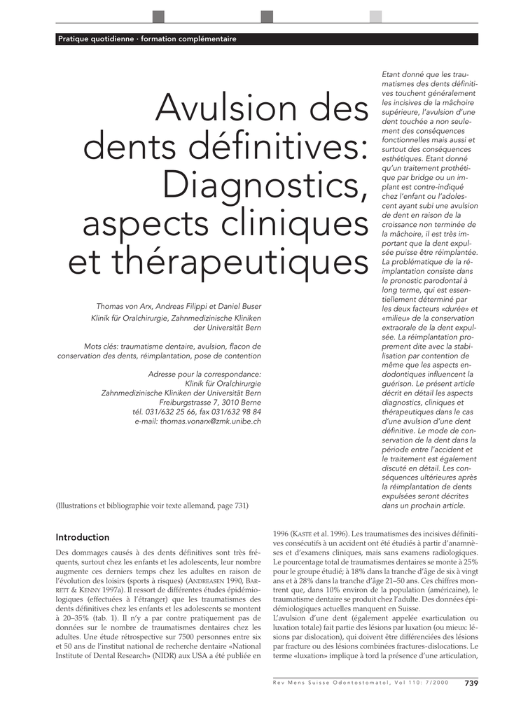 Avulsion des dents définitives: Diagnostics, aspects cliniques et