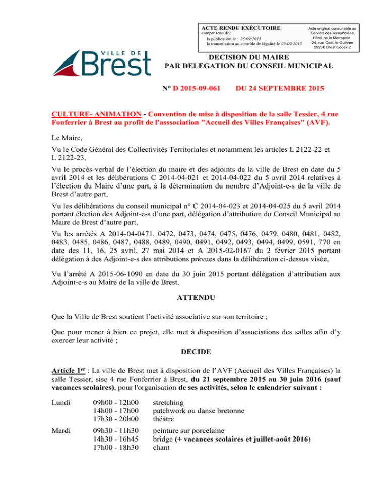 ACTE RENDU EXÉCUTOIRE compte tenu de : la publication le : 25/09/2015 la transmission au contrôle de légalité le :25/09/2015 Acte original consultable au Service des Assemblées, Hôtel de la Métropole 24, rue Coat Ar Guéven 29238 Brest Cedex 2 DECISION DU MAIRE PAR DELEGATION DU CONSEIL MUNICIPAL N° D 2015-09-061 DU 24 SEPTEMBRE 2015 CULTURE- ANIMATION - Convention de mise à disposition de la salle Tessier, 4 rue Fonferrier à Brest au profit de l'asssociation "Accueil des Villes Françaises" (AVF). Le Maire, Vu le Code Général des Collectivités Territoriales et notamment les articles L 2122-22 et L 2122-23, Vu le procès-verbal de l’élection du maire et des adjoints de la ville de Brest en date du 5 avril 2014 et les délibérations C 2014-04-021 et 2014-04-022 du 5 avril 2014 relatives à l’élection du Maire d’une part, à la détermination du nombre d’Adjoint-e-s de la ville de Brest d’autre part, Vu les délibérations du conseil municipal n° C 2014-04-023 et 2014-04-025 du 5 avril 2014 portant élection des Adjoint-e-s d’une part, délégation d’attribution du Conseil Municipal au Maire de Brest d’autre part, Vu les arrêtés A 2014-04-0471, 0472, 0473, 0474, 0475, 0476, 0479, 0480, 0481, 0482, 0483, 0485, 0486, 0487, 0488, 0489, 0490, 0491, 0492, 0493, 0494, 0499, 0591, 770 en date des 11, 16, 25 avril, 27 mai 2014 et A 2015-02-0167 du 2 février 2015 portant délégation à des Adjoint-e-s des attributions prévues dans la délibération ci-dessus visée, Vu l’arrêté A 2015-06-1090 en date du 30 juin 2015 portant délégation d’attribution aux Adjoint-e-s au Maire de la ville de Brest. ATTENDU Que la Ville de Brest soutient l’activité associative sur son territoire ; Que pour mener à bien ce projet, elle met à disposition d’associations des salles afin d’y exercer leur activité ; DECIDE Article 1er : La ville de Brest met à disposition de l’AVF (Accueil des Villes Françaises) la salle Tessier, sise 4 rue Fonferrier à Brest, du 21 septembre 2015 au 30 juin 2016 (sauf vacances scolaires), pour l'organisation de ses activités, selon le calendrier suivant : Lundi 09h00 - 12h00 14h00 - 17h00 17h30 - 20h00 stretching patchwork ou danse bretonne théâtre Mardi 09h30 - 11h30 14h30 - 16h45 17h00 - 18h30 peinture sur porcelaine bridge (+ vacances scolaires et juillet-août 2016) chant Mercredi 09h00 - 13h30 13h30 - 17h30 18h00 - 20h00 initiation à la tapisserie bridge (+ vacances scolaires et juillet-août 2016) atelier Ephémère Jeudi 10h00 - 14h00 14h00 - 16h30 art floral orthographe 2e-4e / toponymie ou histoire bretonne 1er – 3e Vendredi 09h00 - 12h30 tapisserie Samedi 10h00 - 11h30 13h30 - 16h00 halta-yoga peinture à l’huile Article 2 : Cette mise à disposition est consentie à titre gracieux. Les autres conditions d’occupation de la salle sont définies dans la convention. Article 3 : Le Directeur Général des Services, le Trésorier Principal Municipal, sont chargés, chacun en ce qui le concerne, de l'exécution de la présente décision. BREST, le vingt-quatre septembre deux mille quinze Pour le Maire, L’Adjoint au Maire Délégué, Yann MASSON