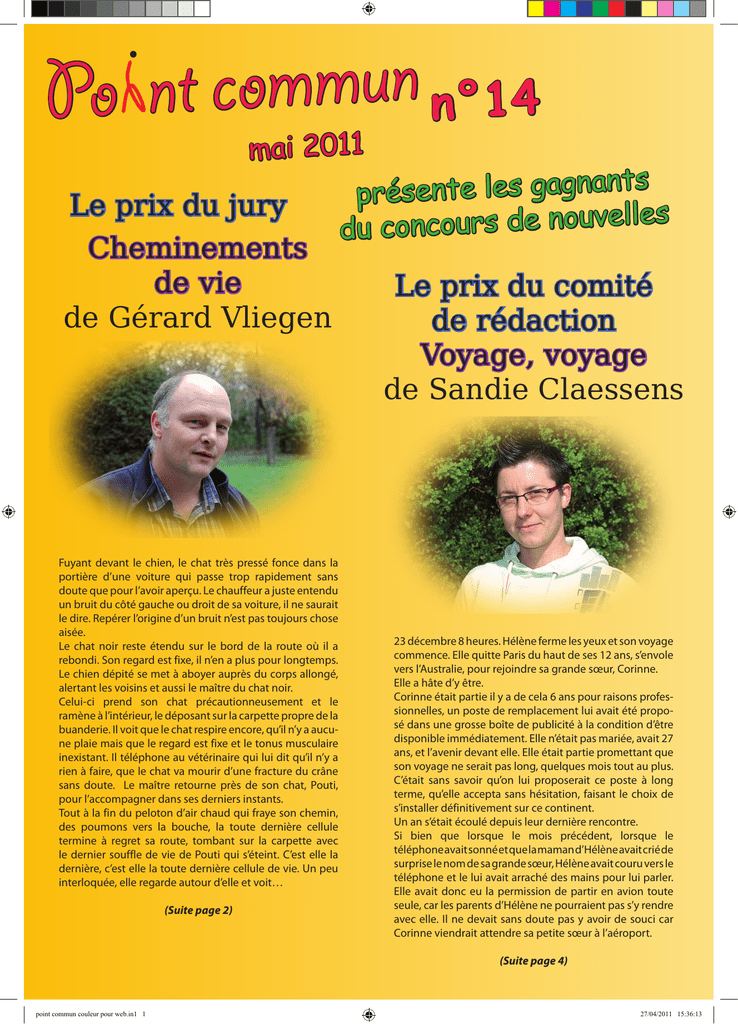 n u m m o c t n o P n°14 mai 2011 Le prix du jury Cheminements de vie de Gérard Vliegen Fuyant devant le chien, le chat très pressé fonce dans la portière d’une voiture qui passe trop rapidement sans doute que pour l’avoir aperçu. Le chauffeur a juste entendu un bruit du côté gauche ou droit de sa voiture, il ne saurait le dire. Repérer l’origine d’un bruit n’est pas toujours chose aisée. Le chat noir reste étendu sur le bord de la route où il a rebondi. Son regard est fixe, il n’en a plus pour longtemps. Le chien dépité se met à aboyer auprès du corps allongé, alertant les voisins et aussi le maître du chat noir. Celui-ci prend son chat précautionneusement et le ramène à l’intérieur, le déposant sur la carpette propre de la buanderie. Il voit que le chat respire encore, qu’il n’y a aucune plaie mais que le regard est fixe et le tonus musculaire inexistant. Il téléphone au vétérinaire qui lui dit qu’il n’y a rien à faire, que le chat va mourir d’une fracture du crâne sans doute. Le maître retourne près de son chat, Pouti, pour l’accompagner dans ses derniers instants. Tout à la fin du peloton d’air chaud qui fraye son chemin, des poumons vers la bouche, la toute dernière cellule termine à regret sa route, tombant sur la carpette avec le dernier souffle de vie de Pouti qui s’éteint. C’est elle la dernière, c’est elle la toute dernière cellule de vie. Un peu interloquée, elle regarde autour d’elle et voit… (Suite page 2) s présente les gagnant lles du concours de nouve Le prix du comité de rédaction Voyage, voyage de Sandie Claessens 23 décembre 8 heures. Hélène ferme les yeux et son voyage commence. Elle quitte Paris du haut de ses 12 ans, s’envole vers l’Australie, pour rejoindre sa grande sœur, Corinne. Elle a hâte d’y être. Corinne était partie il y a de cela 6 ans pour raisons professionnelles, un poste de remplacement lui avait été proposé dans une grosse boîte de publicité à la condition d’être disponible immédiatement. Elle n’était pas mariée, avait 27 ans, et l’avenir devant elle. Elle était partie promettant que son voyage ne serait pas long, quelques mois tout au plus. C’était sans savoir qu’on lui proposerait ce poste à long terme, qu’elle accepta sans hésitation, faisant le choix de s’installer définitivement sur ce continent. Un an s’était écoulé depuis leur dernière rencontre. Si bien que lorsque le mois précédent, lorsque le téléphone avait sonné et que la maman d’Hélène avait crié de surprise le nom de sa grande sœur, Hélène avait couru vers le téléphone et le lui avait arraché des mains pour lui parler. Elle avait donc eu la permission de partir en avion toute seule, car les parents d’Hélène ne pourraient pas s’y rendre avec elle. Il ne devait sans doute pas y avoir de souci car Corinne viendrait attendre sa petite sœur à l’aéroport. (Suite page 4) point commun couleur pour web.in1 1 27/04/2011 15:36:13 Dimanche 25 septembre 2011 sur le site du Nouvel Hôpital Valdor rue Basse-Wez, 301 à 4020 Liège organise «Les chemins du Valdor» un jogging interhospitalier de 7 Km (départ 11h00) PAF: 5,00 € (1 T-shirt + 1 boisson) au compte 068-8890342-28 & une balade familiale gratuite (départ libre de 10h00 à 11h15) Dès 12h30, BarBQ et rafraîchissements Parking aisé sur le site, château gonflable, vestiaires... Renseignements et inscription : David Collard, 04 3417970, [email protected] point commun couleur pour web.in2 2 27/04/2011 15:36:57 de vue la somme de toutes les peurs Tremblements de terre... + Tsunamis... + Accidents nucléaires... + Guerres civiles... + Dictatures... + Insécurité... + Éruptions volcaniques... + Calendrier Maya... + Marées noires... + Cyclones... + Drogues dures... + Faillites bancaires... + Pollutions... + Pics d’ozone... + Déforestations... + Pesticides... + Clonages... + Camps de concentration... + Eau potable... + Biodiversité... + Tornades... + Créationnisme... + OGM... + Réchauffement climatique... + Sectes... + Droits de l’homme... + Cultures intensives... + Agrocarburants... + Terrorisme... + Colis piégés... + Kamikazes... + Blanchiments d’argent... + Tortures... + Bombes atomiques... + Virus... + Piratages... + Intégrismes religieux... + Mondialisation... + Nationalismes... + Corruptions... + Pandémies... + Sécheresses... + Conflits... + 2ème amendement... + Ground zero... + Inondations... + Pogroms... + Fric... + Contaminations... + Insecticides... + Nanomatériaux... + Transgénismes... + NBC... + Subprimes... + Dioxines... + H1N1... + Antibiotiques... + Kalachnikovs... + Drones... + Famines... + Cartels mafieux... + SIDA... + Big one... + Guérillas... + Licenciements... + Extinctions... + Rayonnements électromagnétiques... + Incendies de forêts... + Surpopulation... + Snipers... + Fin du pétrole... + Disparition du plancton... + Pauvreté... + Déchets... + Effet de serre... + Chute de météorites... + Génocides... + Profits... = Crises... = Périls... = Incertitudes... Edgar Morin, le sociologue et philosophe français dit qu’on est entré dans une période d’une telle incertitude que la croyance générale au progrès historique s’est effondrée et que nous considérons le futur comme perdu, le présent angoissé et qu’on se tourne vers nos racines, c’est-à-dire le passé. Passé qui hier encore semblait un tissu de superstitions et d’erreurs, mais qui devient maintenant la vérité. Point commun: Journal d’entreprise d’ISoSL Intercommunale de Soins Spécialisés de Liège, rue Basse-Wez, 301 à 4020 Liège www.isosl.be comite de redaction Émile Brasseur, Maria Calderon, David Collard, Sabine Déom, Isabelle Doyen, Marcel Horion, Maud Jortay, Antoinette Liébecq, Jeanine Malchaire, Véronique Pirotton, Éliane Prenot, Bernard Rinaldi, Marie-Jeanne Vanderweckene Annick Vanwelkenhysen Anne-Marie Virzi, Joëlle Wauthier Chantal Yerna. e re