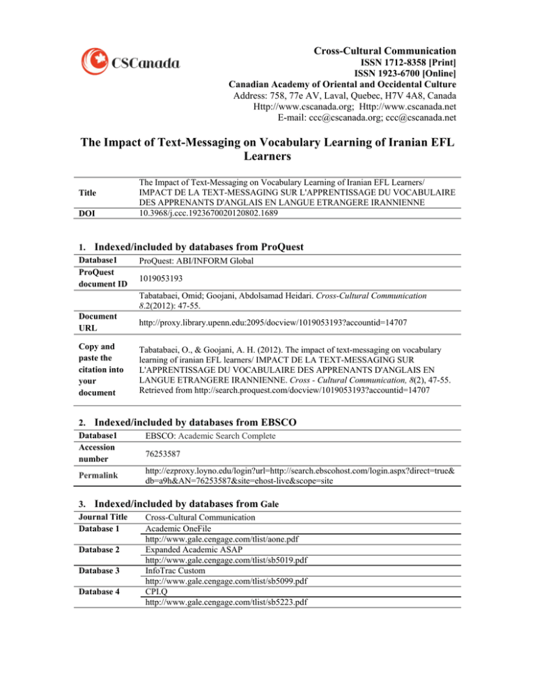 Cross-Cultural Communication ISSN 1712-8358 [Print] ISSN 1923-6700 [Online] Canadian Academy of Oriental and Occidental Culture Address: 758, 77e AV, Laval, Quebec, H7V 4A8, Canada Http://www.cscanada.org; Http://www.cscanada.net E-mail: [email protected]; [email protected] The Impact of Text-Messaging on Vocabulary Learning of Iranian EFL Learners Title DOI The Impact of Text-Messaging on Vocabulary Learning of Iranian EFL Learners/ IMPACT DE LA TEXT-MESSAGING SUR L'APPRENTISSAGE DU VOCABULAIRE DES APPRENANTS D'ANGLAIS EN LANGUE ETRANGERE IRANNIENNE 10.3968/j.ccc.1923670020120802.1689 1. Indexed/included by databases from ProQuest Database1 ProQuest: ABI/INFORM Global ProQuest 1019053193 document ID Tabatabaei, Omid; Goojani, Abdolsamad Heidari. Cross-Cultural Communication 8.2(2012): 47-55. Document http://proxy.library.upenn.edu:2095/docview/1019053193?accountid=14707 URL Copy and paste the citation into your document Tabatabaei, O., & Goojani, A. H. (2012). The impact of text-messaging on vocabulary learning of iranian EFL learners/ IMPACT DE LA TEXT-MESSAGING SUR L'APPRENTISSAGE DU VOCABULAIRE DES APPRENANTS D'ANGLAIS EN LANGUE ETRANGERE IRANNIENNE. Cross - Cultural Communication, 8(2), 47-55. Retrieved from http://search.proquest.com/docview/1019053193?accountid=14707 2. Indexed/included by databases from EBSCO Database1 EBSCO: Academic Search Complete Accession 76253587 number http://ezproxy.loyno.edu/login?url=http://search.ebscohost.com/login.aspx?direct=true& Permalink db=a9h&AN=76253587&site=ehost-live&scope=site 3. Indexed/included by databases from Gale Journal Title Cross-Cultural Communication Academic OneFile Database 1 http://www.gale.cengage.com/tlist/aone.pdf Expanded Academic ASAP Database 2 http://www.gale.cengage.com/tlist/sb5019.pdf InfoTrac Custom Database 3 http://www.gale.cengage.com/tlist/sb5099.pdf CPI.Q Database 4 http://www.gale.cengage.com/tlist/sb5223.pdf Cross-Cultural Communication ISSN 1712-8358 [Print] ISSN 1923-6700 [Online] Canadian Academy of Oriental and Occidental Culture Address: 758, 77e AV, Laval, Quebec, H7V 4A8, Canada Http://www.cscanada.org; Http://www.cscanada.net E-mail: [email protected]; [email protected] 4.Indexed/included by databases from DOAJ Journal Title Database 1 Cross-Cultural Communication DOAJ http://www.doaj.org 5.Indexed/included by databases from AMICUS Journal Title Database 1 Cross-Cultural Communication AMICUS http://amicus.collectionscanada.gc.ca/aawebbin/aamain/itemdisp?sessionKey=999999999_142&l=0&d=2&v=0&lvl=1&itm=30957 159 The journal Cross-Cultural Communication (CCC) is a leading peer reviewed academic journal published bimonthly. It’s founded in May 31th, 2005. Cross-Cultural Communication filed by Library and Archives Canada, and collected by the database AMICUS of Canada, indexed/included and archived by databases from the following famous companies or organizations: Library and Archives Canada (http://www.collectionscanada.gc.ca/index-e.html) ProQuest LIC. (http://www.proquest.com/) Gale (http://www.gale.cengage.com/) EBSCO Publishing (http://www.ebscohost.com/) DOAJ (http://www.doaj.org/) CNKI (http://www.cnki.com.cn/) Ulrich’s (http://www.ulrichsweb.com/) Google Scholar (http://scholar.google.com) PKP Open Archives Harvester (http://pkp.sfu.ca/) Open Access (http://www.open-access.net/) Open J-gate (http://www.openj-gate.com) Ulrich's Periodicals Directory (http://www.ulrichsweb.com) Cabell's Directories (https://ssl.cabells.com/index.aspx) Journal TOCs (http://www.journaltocs.ac.uk/) AMICUS.