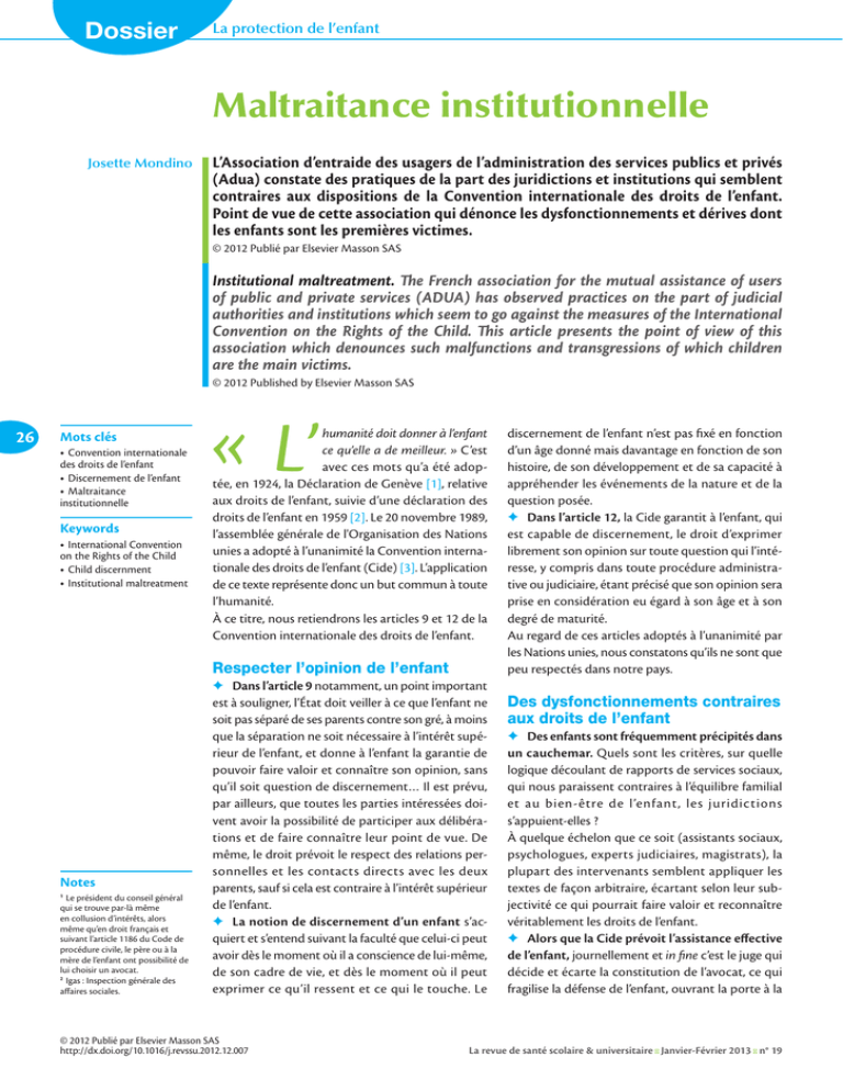 Dossier La protection de l’enfant Maltraitance institutionnelle Josette Mondino L’Association d’entraide des usagers de l’administration des services publics et privés (Adua) constate des pratiques de la part des juridictions et institutions qui semblent contraires aux dispositions de la Convention internationale des droits de l’enfant. Point de vue de cette association qui dénonce les dysfonctionnements et dérives dont les enfants sont les premières victimes. © 2012 Publié par Elsevier Masson SAS Institutional maltreatment. The French association for the mutual assistance of users of public and private services (ADUA) has observed practices on the part of judicial authorities and institutions which seem to go against the measures of the International Convention on the Rights of the Child. This article presents the point of view of this association which denounces such malfunctions and transgressions of which children are the main victims. © 2012 Published by Elsevier Masson SAS 26 Mots clés • Convention internationale des droits de l’enfant • Discernement de l’enfant • Maltraitance institutionnelle Keywords • International Convention on the Rights of the Child • Child discernment • Institutional maltreatment « L’ humanité doit donner à l’enfant ce qu’elle a de meilleur. » C’est avec ces mots qu’a été adoptée, en 1924, la Déclaration de Genève [1], relative aux droits de l’enfant, suivie d’une déclaration des droits de l’enfant en 1959 [2]. Le 20 novembre 1989, l’assemblée générale de l'Organisation des Nations unies a adopté à l’unanimité la Convention internationale des droits de l’enfant (Cide) [3]. L’application de ce texte représente donc un but commun à toute l’humanité. À ce titre, nous retiendrons les articles 9 et 12 de la Convention internationale des droits de l’enfant. Respecter l’opinion de l’enfant Notes Le président du conseil général qui se trouve par-là même en collusion d’intérêts, alors même qu’en droit français et suivant l’article 1186 du Code de procédure civile, le père ou à la mère de l’enfant ont possibilité de lui choisir un avocat. 2 Igas : Inspection générale des affaires sociales. 1 J J Dans l’article 9 notamment, un point important est à souligner, l’État doit veiller à ce que l’enfant ne soit pas séparé de ses parents contre son gré, à moins que la séparation ne soit nécessaire à l’intérêt supérieur de l’enfant, et donne à l’enfant la garantie de pouvoir faire valoir et connaître son opinion, sans qu’il soit question de discernement… Il est prévu, par ailleurs, que toutes les parties intéressées doivent avoir la possibilité de participer aux délibérations et de faire connaître leur point de vue. De même, le droit prévoit le respect des relations personnelles et les contacts directs avec les deux parents, sauf si cela est contraire à l’intérêt supérieur de l’enfant. J J La notion de discernement d’un enfant s’acquiert et s’entend suivant la faculté que celui-ci peut avoir dès le moment où il a conscience de lui-même, de son cadre de vie, et dès le moment où il peut exprimer ce qu’il ressent et ce qui le touche. Le © 2012 Publié par Elsevier Masson SAS http://dx.doi.org/10.1016/j.revssu.2012.12.007 discernement de l’enfant n’est pas fixé en fonction d’un âge donné mais davantage en fonction de son histoire, de son développement et de sa capacité à appréhender les événements de la nature et de la question posée. J J Dans l’article 12, la Cide garantit à l’enfant, qui est capable de discernement, le droit d’exprimer librement son opinion sur toute question qui l’intéresse, y compris dans toute procédure administrative ou judiciaire, étant précisé que son opinion sera prise en considération eu égard à son âge et à son degré de maturité. Au regard de ces articles adoptés à l’unanimité par les Nations unies, nous constatons qu’ils ne sont que peu respectés dans notre pays. Des dysfonctionnements contraires aux droits de l’enfant J J Des enfants sont fréquemment précipités dans un cauchemar. Quels sont les critères, sur quelle logique découlant de rapports de services sociaux, qui nous paraissent contraires à l’équilibre familial et au bien-être de l’enfant, les juridictions s’appuient-elles ? À quelque échelon que ce soit (assistants sociaux, psychologues, experts judiciaires, magistrats), la plupart des intervenants semblent appliquer les textes de façon arbitraire, écartant selon leur subjectivité ce qui pourrait faire valoir et reconnaître véritablement les droits de l’enfant. J J Alors que la Cide prévoit l’assistance effective de l’enfant, journellement et in fine c’est le juge qui décide et écarte la constitution de l’avocat, ce qui fragilise la défense de l’enfant, ouvrant la porte à la La revue de santé scolaire & universitaire ● Janvier-Février 2013 ● n° 19 La protection de l’enfant Dossier Des constats partagés J J L’enfant n’est que peu souvent entendu. Il n’est pas recherché à quel membre de la famille proche il pourrait être confié. Il est totalement isolé de ses liens familiaux et surtout de son parent protecteur. J J Lorsque l’on parle de services sociaux et de protection de l’enfance, les citoyens pensent que seules les familles défavorisées seraient touchées. Il est urgent que tous sachent que nul n’est à l’abri de ce contexte et qu’un différend parental, même mineur, peut être déclencheur d’une telle machinerie. Lorsqu’ils consultent les sites institutionnels qui traitent de la défense des droits des enfants, les citoyens non avertis supposent que tous les aspects relatifs à l’intérêt supérieur de celui-ci sont véritablement pris en cause et que tout est mis en œuvre pour lui donner le meilleur. L’Association d’entraide des usagers de l
