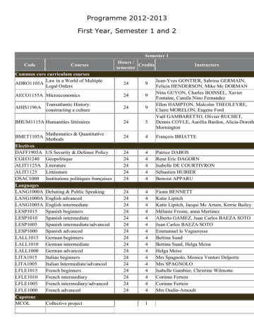 Programme 2012-2013 First Year, Semester 1 and 2 Semester 1 Code Courses Common core curriculum courses Law in a World of Multiple ADRO1105A Legal Orders Hours / Credits semester Instructors Jean-Yves GONTIER, Sabrina GERMAIN, Felicia HENDERSON, Mike Mc DORMAN Nina GUYON, Charles BOISSEL, Xavier Fontaine, Camila Nino Fernandez Ellen HAMPTON, Malcolm THEOLEYRE, Claire MORELON, Eugene Ford Yaël GAMBARETTO, Olivier RUCHET, Dennis COYLE, Aurélia Bardon, Alicia-Doroth Mornington 24 9 24 9 Transatlantic History: constructing a culture 24 9 BHUM1115A Humanities littéraires 24 5 Mathematics & Quantitative Methods 24 4 François BRIATTE US Security & Defense Policy Géopolitique Literature Littérature Institutions politiques françaises 24 24 24 24 24 4 4 4 4 4 Patrice DABOS René Eric DAGORN Isabelle DE COURTIVRON Sébastien HUBIER Benoist APPARU Debating & Public Speaking English advanced English intermediate Spanish beginners Spanish intermediate Spanish intermediate/advanced Spanish advanced German beginners German intermediate German advanced Italian beginners Italian Intermediate/advanced French beginners French intermediary French intermediary/advanced French advanced 24 24 24 24 24 24 24 24 24 24 24 24 24 24 24 24 4 4 4 4 4 4 4 4 4 4 4 4 4 4 4 4 Fionn BENNETT Katie Lipitch Katie Lipitch, Jacqui Mc Artain, Kerrie Bailey Mélanie Fresne, anna Martinez Alberto GAMEZ, Juan Carlos BAEZA SOTO Juan Carlos BAEZA SOTO Emmanuel le Vagueresse Bettina Sund Bettina Sund, Helga Meise Helga Meise Mrs Spagnolo, Monica Venturi Delporte Mrs SPAGNOLO Isabelle Gambier, Christine Wilmotte Corinne Fertein Corinne Fertein Mrs Oudin-Arnoult AECO1155A Microeconomics AHIS1196A BMET1105A Electives DAFF1905A CGEO1240 ALIT1125A ALIT1125 OSAC1000 Languages LANG1000A LANG1000A LANG1005A LESP1015 LESP1010 LESP1005 LESP1000 LALL1015 LALL1010 LALL1000 LITA1015 LITA1005 LFLE1015 LFLE1010 LFLE1005 LFLE1000 Capstone MCOL Collective project 1 Total required credits Optional courses Sport Code 44 1 Courses Semester 2 Hours / Credits semester Instructors Common core curriculum courses AECO1160A Macroeconomics 24 9 ASPO1130A Political Science 24 9 ASOC1105A Sociology 24 9 BHUM1150A Humanités Littéraires 24 4 Arts Workshops CART1250 Arts Workshop 1 Musique 24 4 Stefan KRAUSE, Charles BOISSEL Emiliano GROSSMAN, Vlad GROSS,Philip KOSTELKA,Jasper COOPER Anne REVILLARD Colette CAMELIN ,Laurence CHAMLOU,René DAVAL,Sébastien HUBIER,Jean BALSAMO,Cynthia TOLENTINO Patrick DEFOSSEZ La Comédie de Reims/Laurent NOUZILLE La Comédie de Reims/Chloë LATOUR & Frédérique AIT TOITI CART1250 Arts Workshop 2 Théâtre 24 4 CART1250 Arts Workshop 3 Théâtre 24 4 24 4 Antonio LABATI 24 4 Claire FAUCHILLE 24 4 Jean-Michel HANNECART 24 4 Autour du cinéma 24 4 Jérôme DESCAMPS 24 4 Aurélio SAVINI 24 4 Earlwyn COVINGTON CART1250 CART1250 CART1250 CART1250 CART1250 CART1250 CART1250 Arts Workshop 4 Théâtre Arts Workshop 5 Design Objet Arts Workshop 6 Peinture Arts Workshop 7 Pocket Cinema Arts Workshop 8 Cinéma Documentaire Arts Workshop 9 Histoire du cinéma & mise en scène Arts Workshop 10 Creative Writing Resources Arts Workshop 11 Calligraphie chinoise Arts Workshop 12 CART1250 Danse Arts Workshop 13 CART1250 Photographie Arts Workshop 14 CART1250 Design Culinaire Arts Workshop 15 ACART1250 Opéra Electives Géopolitique ODIH2025 La Guerre au XXème siècle Global Mass Communication in the International Arena DAFF1980A Transatlantic Relations 20th Century Asian wars CART1250 24 4 Domitille GERMAIN 24 4 24 4 24 4 Céline MARDERE 24 4 Hadhoum TUNC 24 24 4 4 René DAGORN Mr PIVIDORI 24 4 Marcello SCARONE 24 24 4 4 Démocratie et totalitarisme 24 4 Mr CHAMOREL Eugene FORD Yaël GAMBAROTTO The African-American Odyssey 24 4 LANG1000A English advanced 24 4 LANG1005A English intermediate 24 4 LANG1010A English intermediate/low 24 4 LESP1015 Spanish beginners 24 4 LESP1010 Spanish intermediate 24 4 LESP1005 Spanish intermediate/advanced 24 4 LESP1000 Spanish advanced 24 4 LALL1015 German beginners 24 4 LALL1010 German intermediate 24 4 LALL1000 German advanced 24 4 LITA1015 Italian beginners 24 4 LITA1005 Italian Intermediate/advanced 24 4 Le Manége/Judith PERRON Jean-Christophe HANCHE Sylvie LAURENT Languages Katie LIPITCH,Jacqui Mc ARTAIN Katie LIPITCH, Kerrie BAILEY Kerrie BAILEY Mélanie FRESNE, Anna MARTINEZ Alberto GAMEZ, Juan Carlos BAEZA SOTO,Anna MARTINEZ Juan Carlos BAEZA SOTO,Florence DUMORA Emmanuel LE VAGUERESSE Bettina SUND Bettina SUND, Helga MEISE Helga MEISE Mrs SPAGNOLO, Monica VENTURI DELPORTE Mrs SPAGNOLO LFLE1015 French beginners 24 4 LFLE1010 French intermediary French intermediary/advanced 24 4 24 4 French advanced 24 4 LFLE1005 LFLE1000 Isabelle GAMBIER,Christine WILMOTTE Corinne FERTEIN Mrs OUDINARNOULT Mrs OUDINARNOULT Spring School BSPO1010A Spring School 1 Collaborative Project MCOL1115 Collaborative Project Sports 1 Anne-Marie LE GLOANNEC,Salomé ZOURABICHVILI Hervé LAHEURTE,,Julien BERAUT, HSPO5490 Escalade,Rugby,Badminton, Fitness/Musculation 1 Aurélien ALBAUD & Muriel CHEVREL, Laurent TRUILLET Excel Training EEXL1005A Excel Training 1
