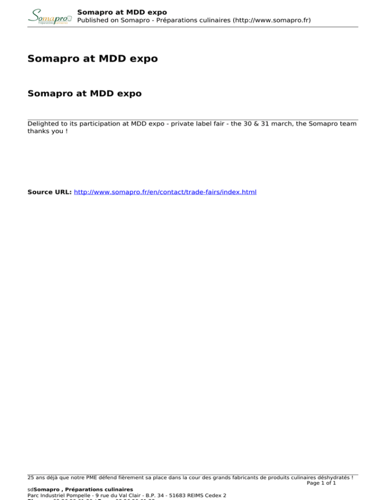Somapro at MDD expo Published on Somapro - Préparations culinaires (http://www.somapro.fr) Somapro at MDD expo Somapro at MDD expo Delighted to its participation at MDD expo - private label fair - the 30 & 31 march, the Somapro team thanks you ! Source URL: http://www.somapro.fr/en/contact/trade-fairs/index.html 25 ans déjà que notre PME défend fièrement sa place dans la cour des grands fabricants de produits culinaires déshydratés ! Page 1 of 1 sdSomapro , Préparations culinaires Parc Industriel Pompelle - 9 rue du Val Clair - B.P. 34 - 51683 REIMS Cedex 2