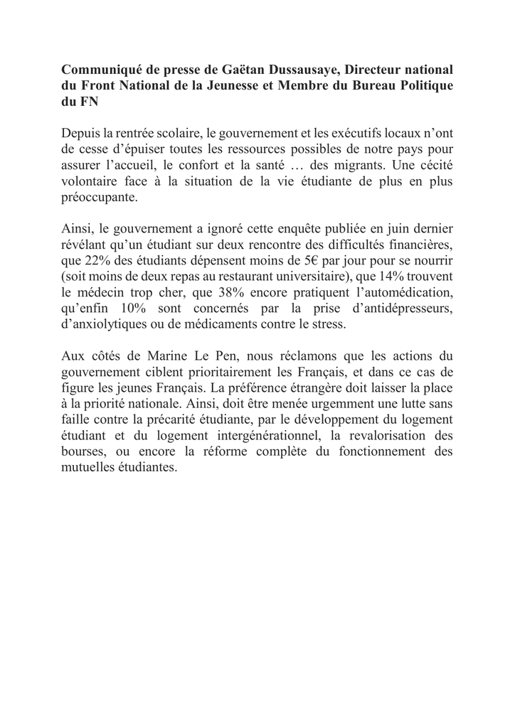 Communiqué de presse de Gaëtan Dussausaye, Directeur national du Front National de la Jeunesse et Membre du Bureau Politique du FN Depuis la rentrée scolaire, le gouvernement et les exécutifs locaux n’ont de cesse d’épuiser toutes les ressources possibles de notre pays pour assurer l’accueil, le confort et la santé … des migrants. Une cécité volontaire face à la situation de la vie étudiante de plus en plus préoccupante. Ainsi, le gouvernement a ignoré cette enquête publiée en juin dernier révélant qu’un étudiant sur deux rencontre des difficultés financières, que 22% des étudiants dépensent moins de 5€ par jour pour se nourrir (soit moins de deux repas au restaurant universitaire), que 14% trouvent le médecin trop cher, que 38% encore pratiquent l’automédication, qu’enfin 10% sont concernés par la prise d’antidépresseurs, d’anxiolytiques ou de médicaments contre le stress. Aux côtés de Marine Le Pen, nous réclamons que les actions du gouvernement ciblent prioritairement les Français, et dans ce cas de figure les jeunes Français. La préférence étrangère doit laisser la place à la priorité nationale. Ainsi, doit être menée urgemment une lutte sans faille contre la précarité étudiante, par le développement du logement étudiant et du logement intergénérationnel, la revalorisation des bourses, ou encore la réforme complète du fonctionnement des mutuelles étudiantes.