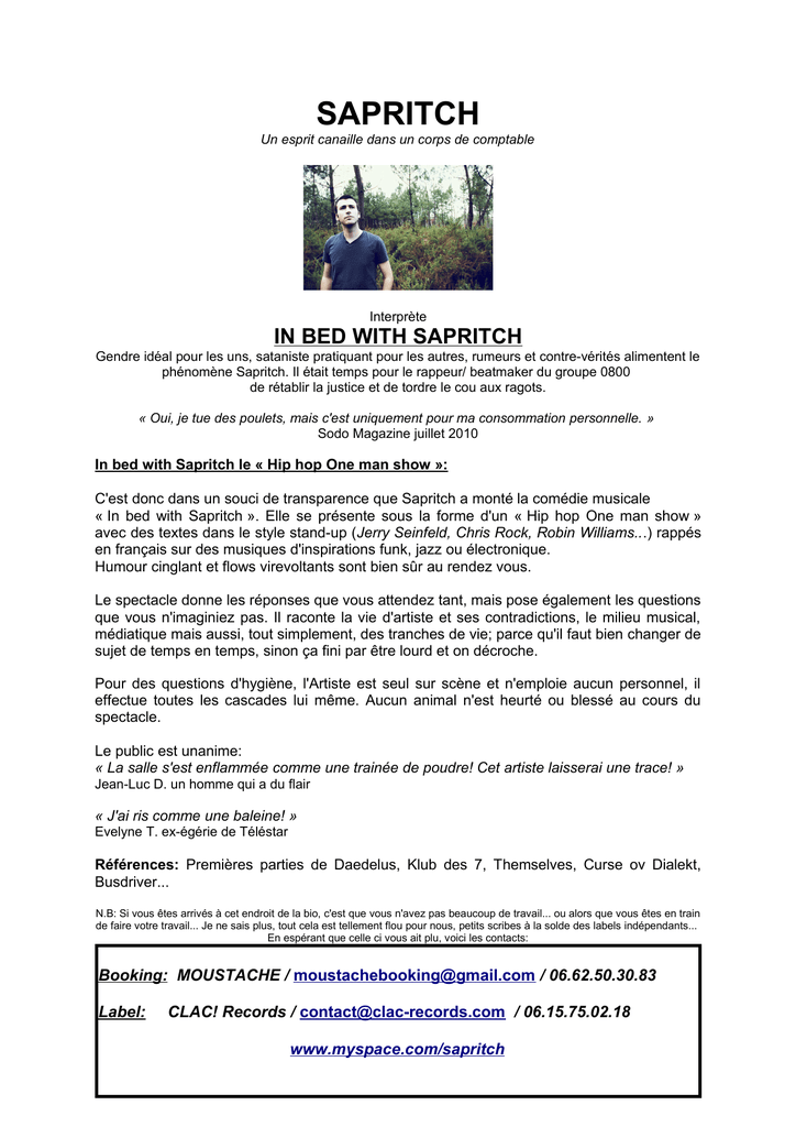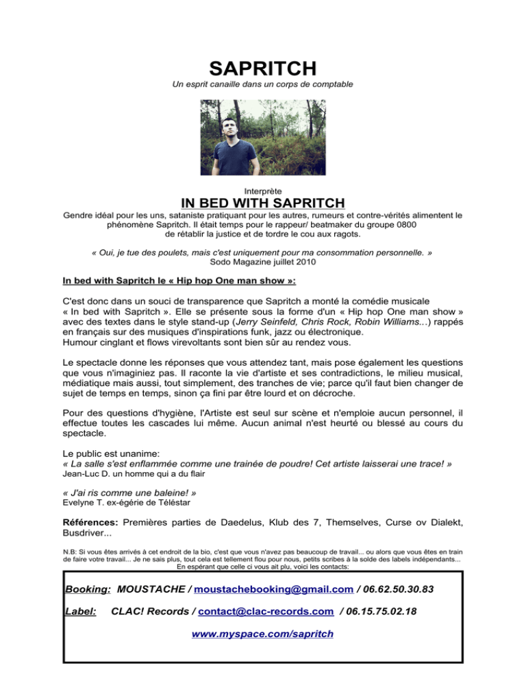 SAPRITCH Un esprit canaille dans un corps de comptable Interprète IN BED WITH SAPRITCH Gendre idéal pour les uns, sataniste pratiquant pour les autres, rumeurs et contre-vérités alimentent le phénomène Sapritch. Il était temps pour le rappeur/ beatmaker du groupe 0800 de rétablir la justice et de tordre le cou aux ragots. « Oui, je tue des poulets, mais c'est uniquement pour ma consommation personnelle. » Sodo Magazine juillet 2010 In bed with Sapritch le « Hip hop One man show »: C'est donc dans un souci de transparence que Sapritch a monté la comédie musicale « In bed with Sapritch ». Elle se présente sous la forme d'un « Hip hop One man show » avec des textes dans le style stand-up (Jerry Seinfeld, Chris Rock, Robin Williams...) rappés en français sur des musiques d'inspirations funk, jazz ou électronique. Humour cinglant et flows virevoltants sont bien sûr au rendez vous. Le spectacle donne les réponses que vous attendez tant, mais pose également les questions que vous n'imaginiez pas. Il raconte la vie d'artiste et ses contradictions, le milieu musical, médiatique mais aussi, tout simplement, des tranches de vie; parce qu'il faut bien changer de sujet de temps en temps, sinon ça fini par être lourd et on décroche. Pour des questions d'hygiène, l'Artiste est seul sur scène et n'emploie aucun personnel, il effectue toutes les cascades lui même. Aucun animal n'est heurté ou blessé au cours du spectacle. Le public est unanime: « La salle s'est enflammée comme une trainée de poudre! Cet artiste laisserai une trace! » Jean-Luc D. un homme qui a du flair « J'ai ris comme une baleine! » Evelyne T. ex-égérie de Téléstar Références: Premières parties de Daedelus, Klub des 7, Themselves, Curse ov Dialekt, Busdriver... N.B: Si vous êtes arrivés à cet endroit de la bio, c'est que vous n'avez pas beaucoup de travail... ou alors que vous êtes en train de faire votre travail... Je ne sais plus, tout cela est tellement flou pour nous, petits scribes à la solde des labels indépendants... En espérant que celle ci vous ait plu, voici les contacts: Booking: MOUSTACHE / [email protected] / 06.62.50.30.83 Label: CLAC! Records / [email protected] / 06.15.75.02.18 www.myspace.com/sapritch SAPRITCH - RIDER Si vous avez des questions, contactez : Moustache au 06.62.50.30.83 L'accueil 1 personne A son arrivée l'artiste trouvera dans sa loge une assiette de fromage/charcuterie (pas de sucré svp) avec du pain et 6 bières fraiches (heineken ou 1664) et 2 bouteilles d'eau. Un repas chaud et équilibré sera servi avant le concert si la représentation se passe après 20 heures. Pour les représentation avant 20 heures, sapritch mangera en sortant de scène. L'artiste disposera d'un minimum de 30 minutes de balances. Un technicien son sera présent pendant les balances et la représentation. L'hébergement 1 chambre SAPRITCH - TECH. SUSCEPTIBLE DE MODIFICATIONS (Fiche tech pour moyennes et grande salles, pour bars et petits lieux, me contacter en direct) L'artiste se déplace sans technicien 1 chanteur+ système ordinateur/machine DIFFUSION FACADE La puissance doit être adaptée à la capacité de la salle ainsi qu’une dispersion uniforme dans toute la salle. CONSOLE & PERIPHERIQUES FACADE 1 x Console Type : AMEK - MIDAS - DIGICO - SOUNDCRAFT. 2 x Canaux de Graphic EQ 31 bandes. Type : APEX - BSS - KLARK. (Égalisation du système de diffusion) 3 x Canaux de Compresseur : DBX – BSS - DRAWMER. DIFFUSION MONITOR 2 x Wedges identiques (monitor compris) Type: D&B Max 15/12- MARTIN LE 400 - NEXO PS 15. CONSOLE & PERIPHERIQUES MONITOR 1 x Console Type : - MIDAS- SOUNDCRAFT - DIGICO 3 x Canaux de Graphic EQ 31 bandes. Type: APEX - BSS - KLARK: (insert aux). SAPRITCH - PATCH. Input Affectations 13 14 MIXETTE LEFT MIXETTE RIGHT 15 LEAD SAPRITCH Micros Stands Insert F.O.H Observ DI DI SM58/ BETA 58 A 2 keyboard stands COMP COMP 48Volt 48Volt GRAND COMP Contact technique : SAPRITCH 06.15.75.02.18 Plan de Scène 220v Ordinateur/ machine/mixette 2 STANDS CLAVIERS SAPRITCH